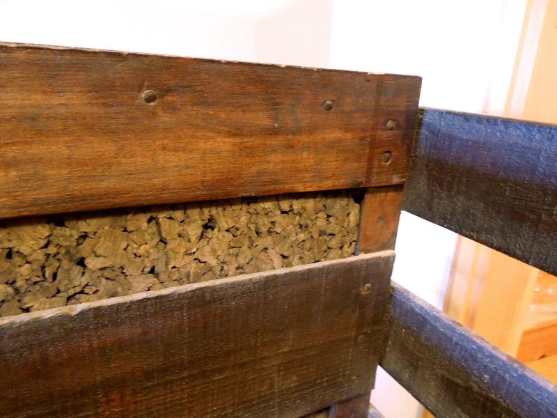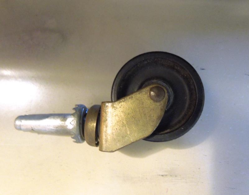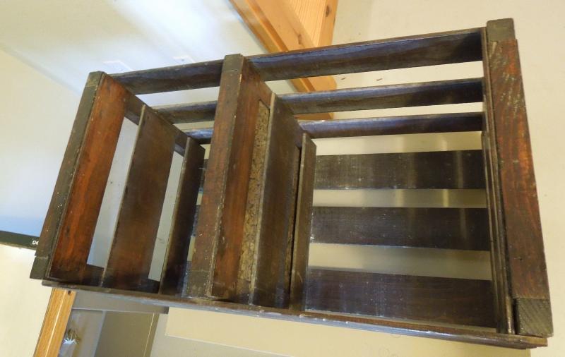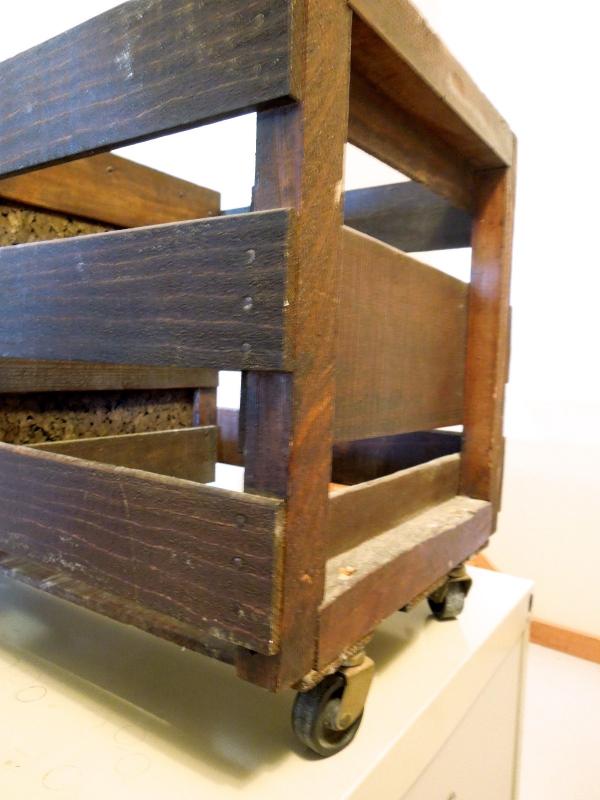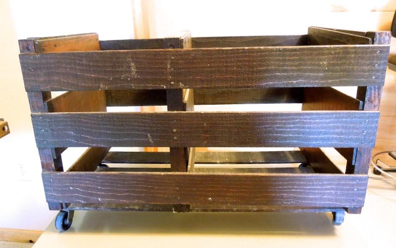 Home made dark stained fruit crate on casters with stationary divided sections. Two casters are loose and may need some gluing. Divider is made of wood and cork. Fits vinyl LP's. Paint is not even.