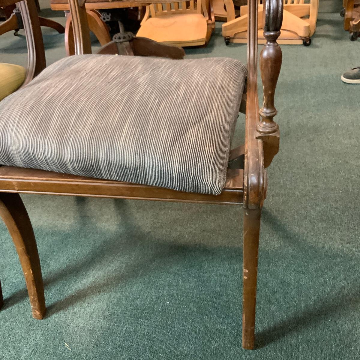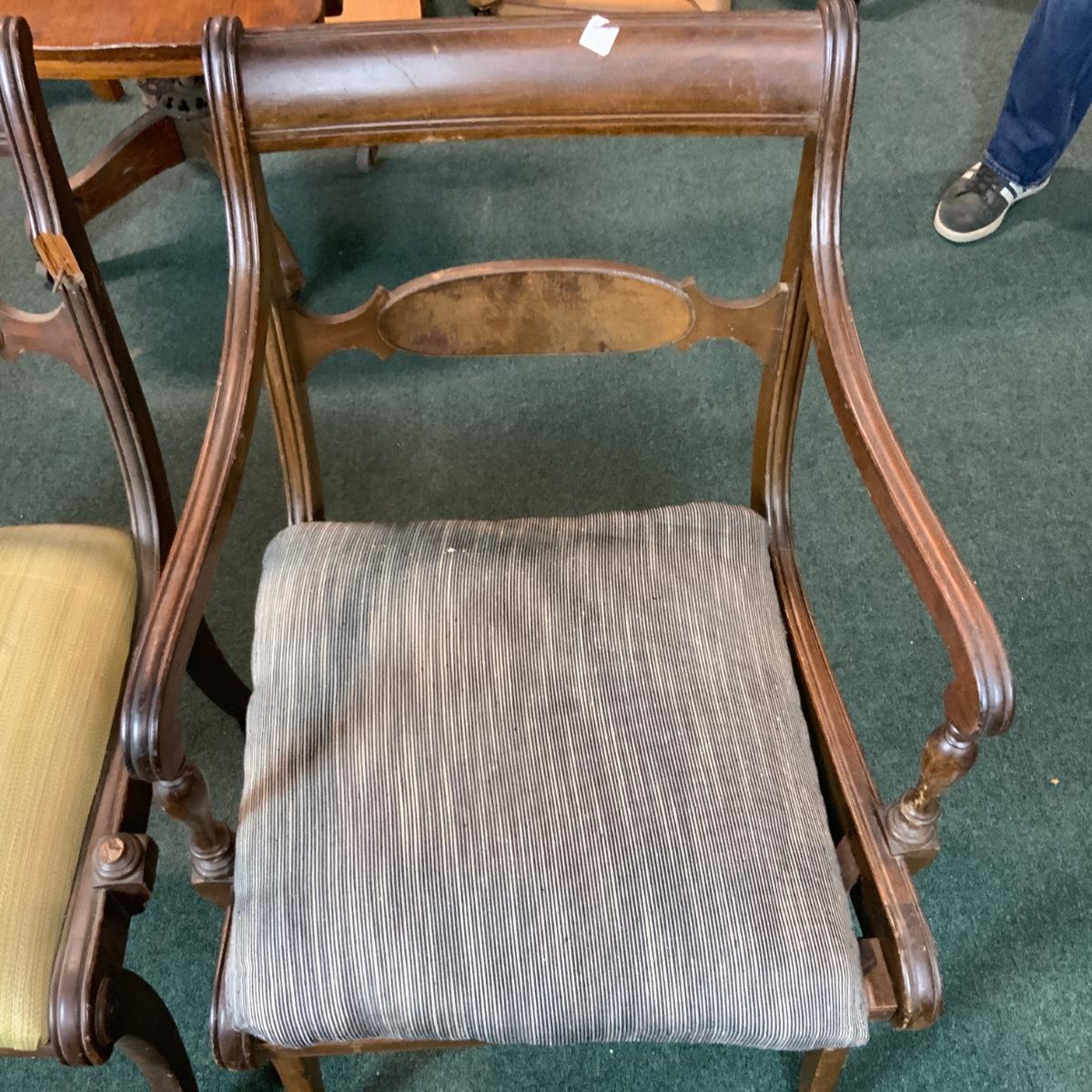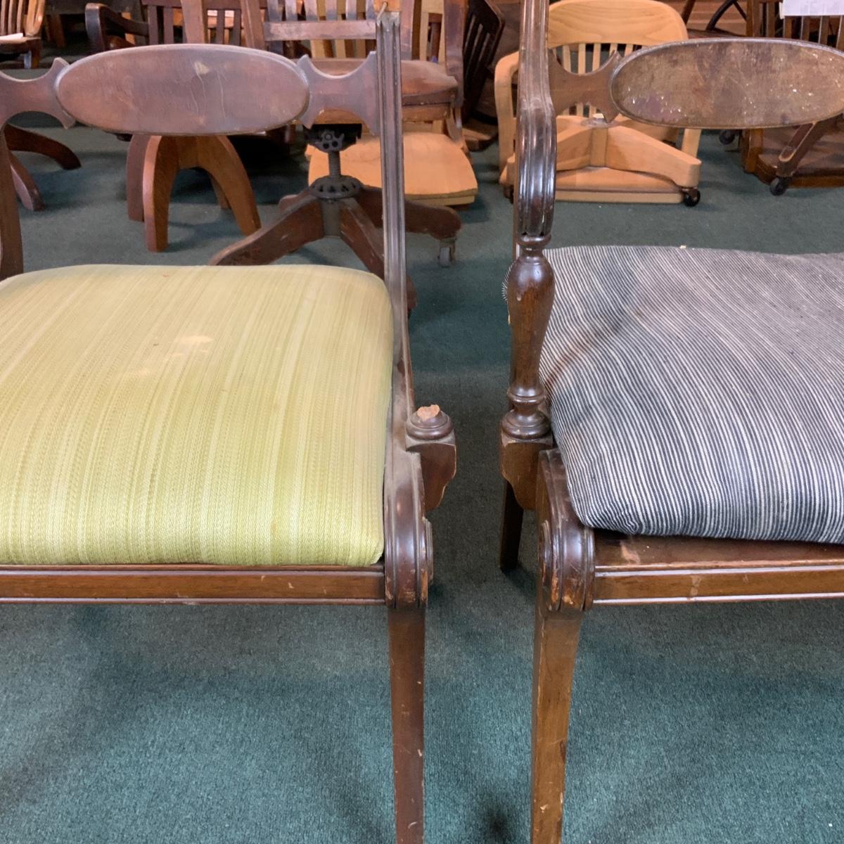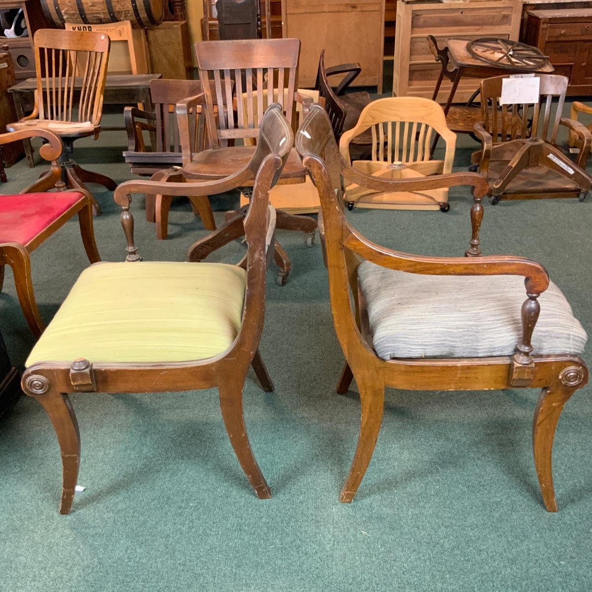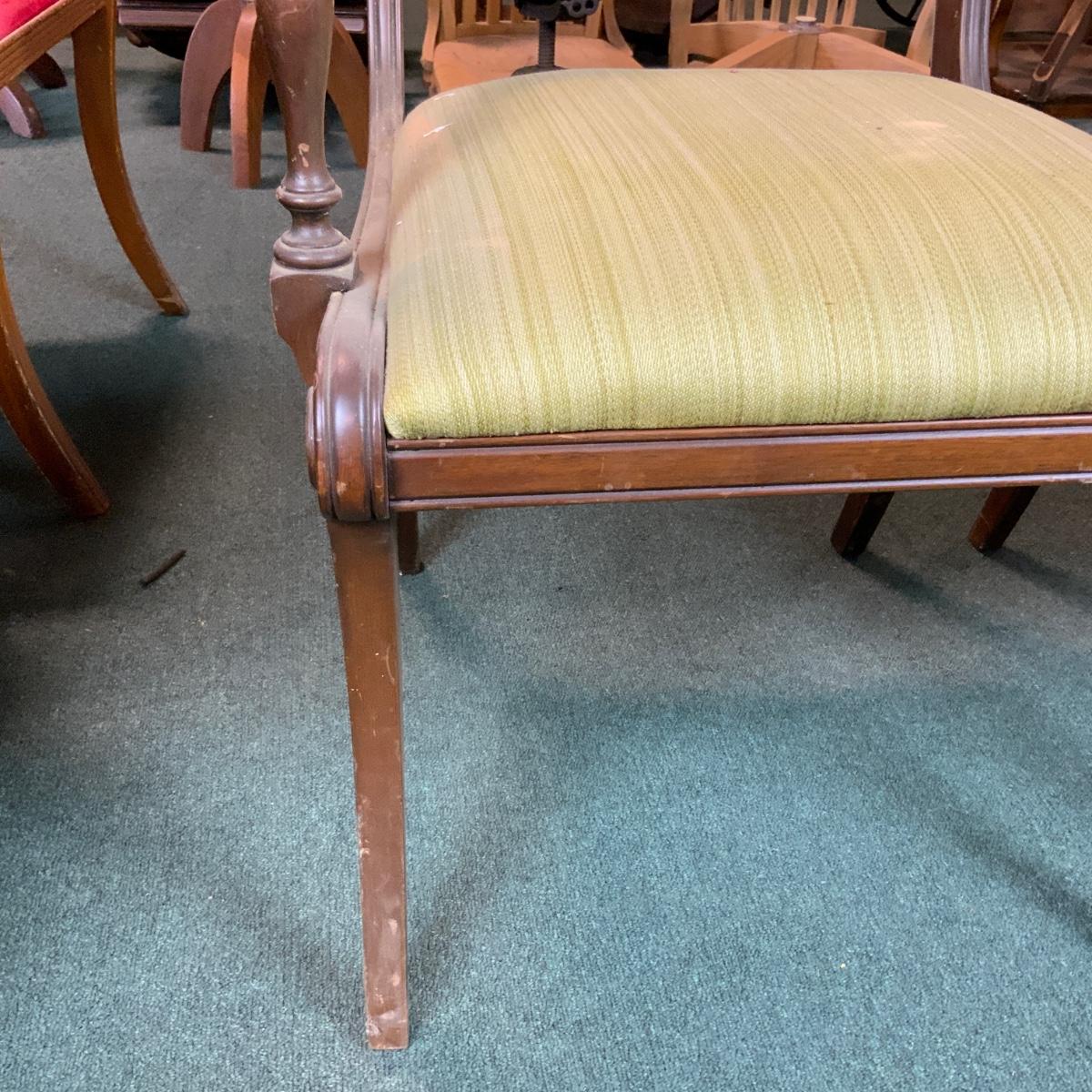 Two Antique Arm Chairs. The one with the green seat is missing an arm. //::\\ Please see photos for details and condition. No attempt has been made to hide any imperfections. All items listed in this auction are warehouse items, and need to be cleaned. A majority of the items need restoration as well. All items are sold AS IS and WITHOUT GUARANTEE. If you are uncertain about an item, DO NOT BID. Due to the nature of this online auction in-person inspection is HIGHLY recommended. All Sales are FINAL. Pick Up Times are FIRM. Please confirm with your own schedule that you can pick up in the scheduled times listed in the Terms and Conditions. Any questions please message the auctioneer. DO NOT Contact The Harp Gallery.