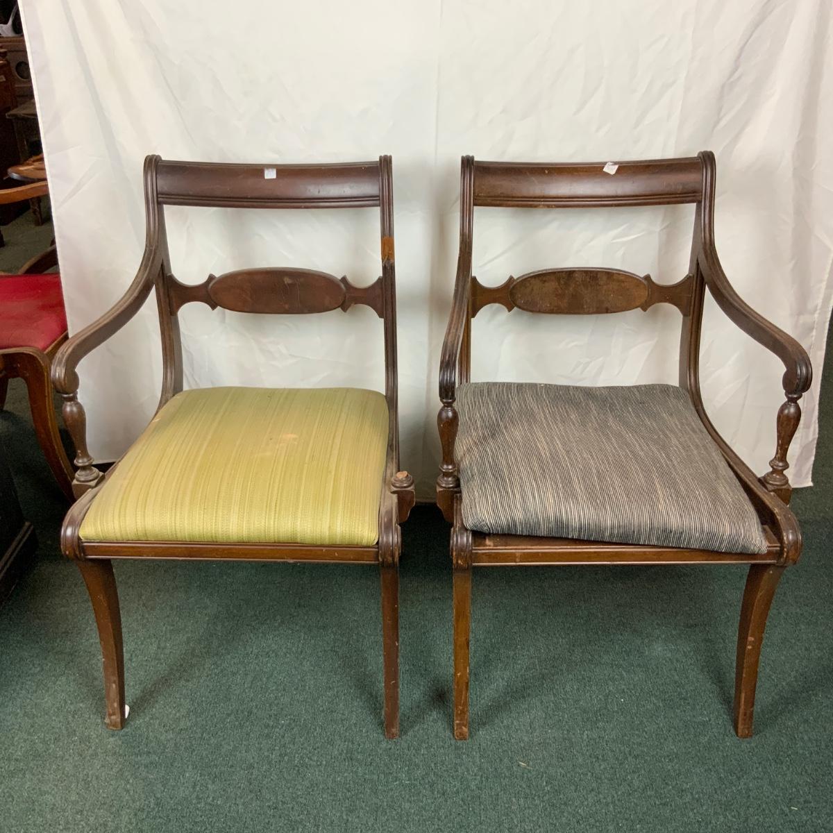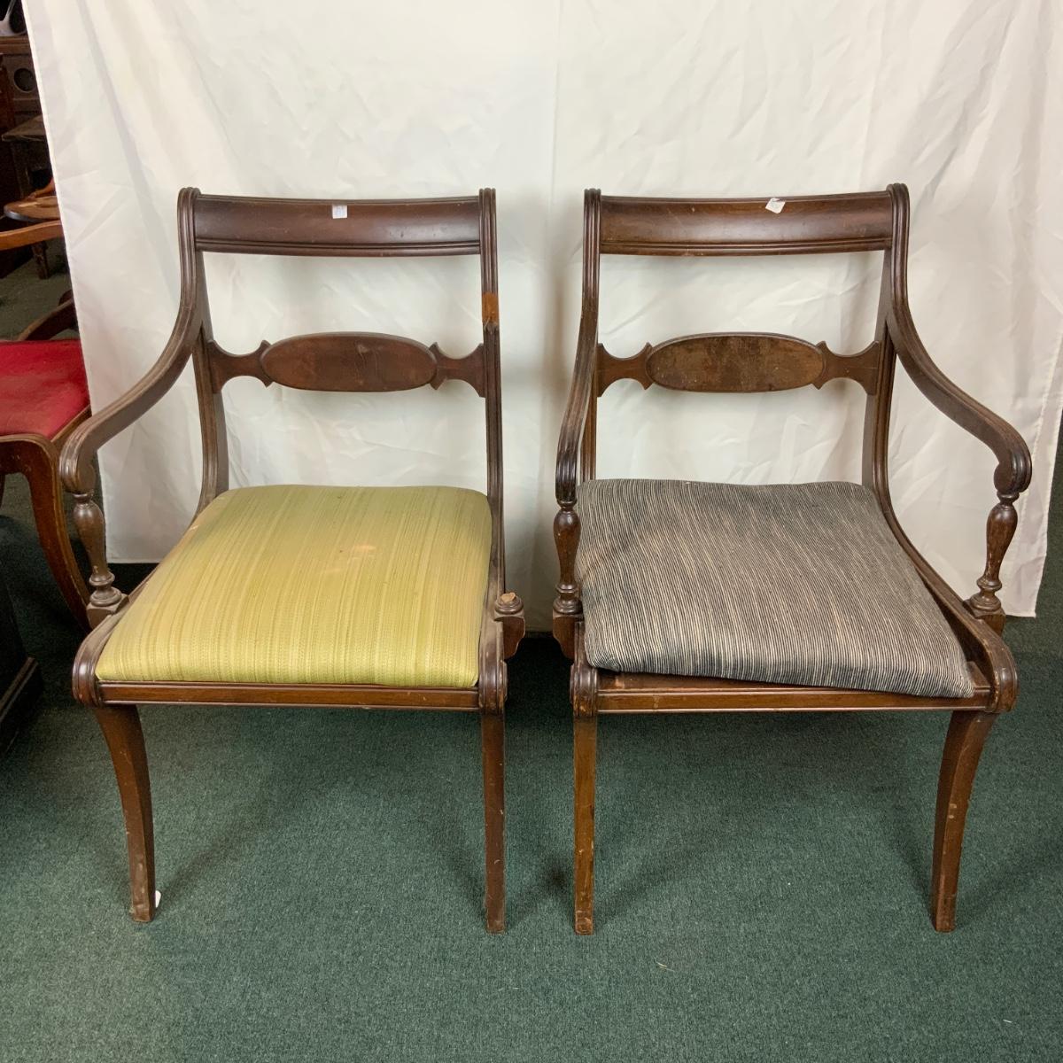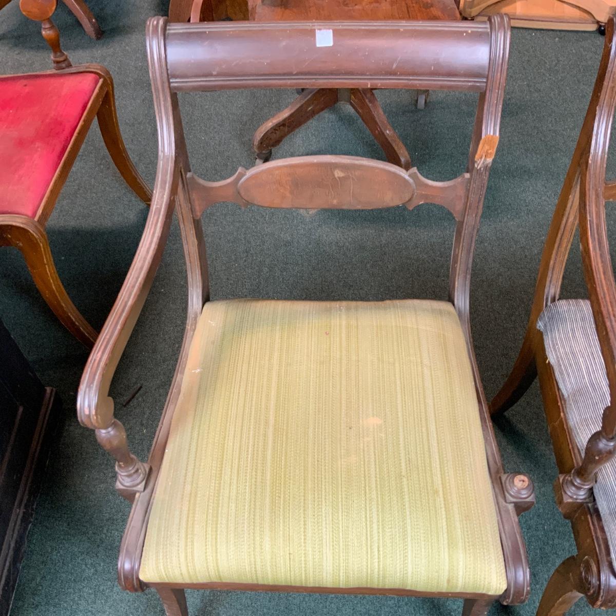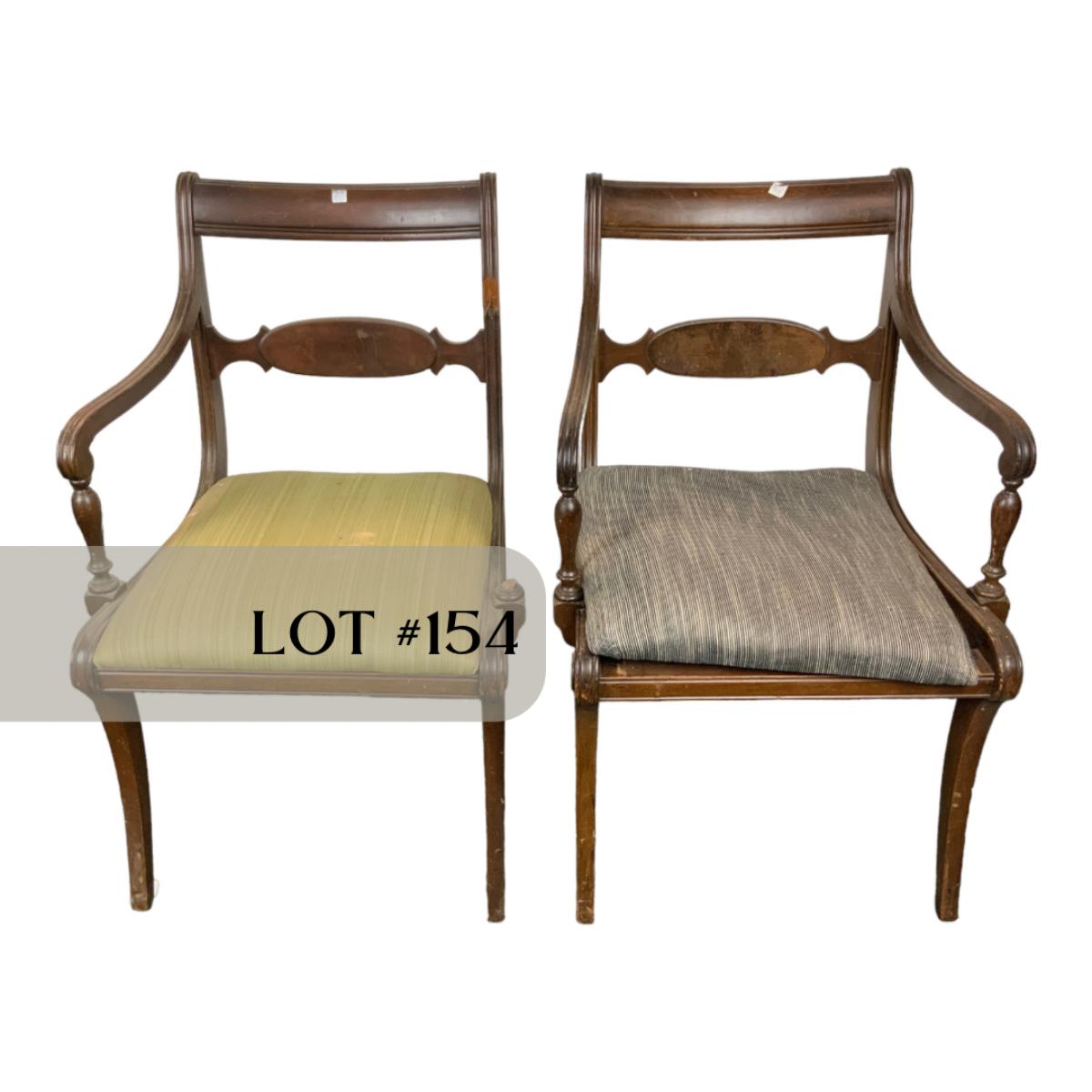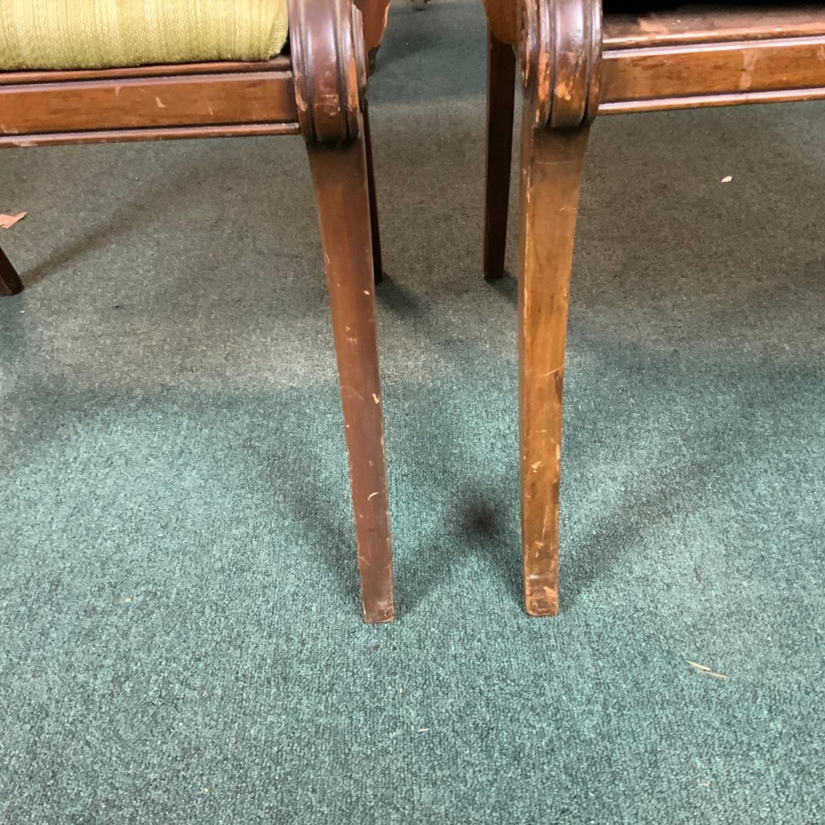 Two Antique Arm Chairs. The one with the green seat is missing an arm. //::\\ Please see photos for details and condition. No attempt has been made to hide any imperfections. All items listed in this auction are warehouse items, and need to be cleaned. A majority of the items need restoration as well. All items are sold AS IS and WITHOUT GUARANTEE. If you are uncertain about an item, DO NOT BID. Due to the nature of this online auction in-person inspection is HIGHLY recommended. All Sales are FINAL. Pick Up Times are FIRM. Please confirm with your own schedule that you can pick up in the scheduled times listed in the Terms and Conditions. Any questions please message the auctioneer. DO NOT Contact The Harp Gallery.