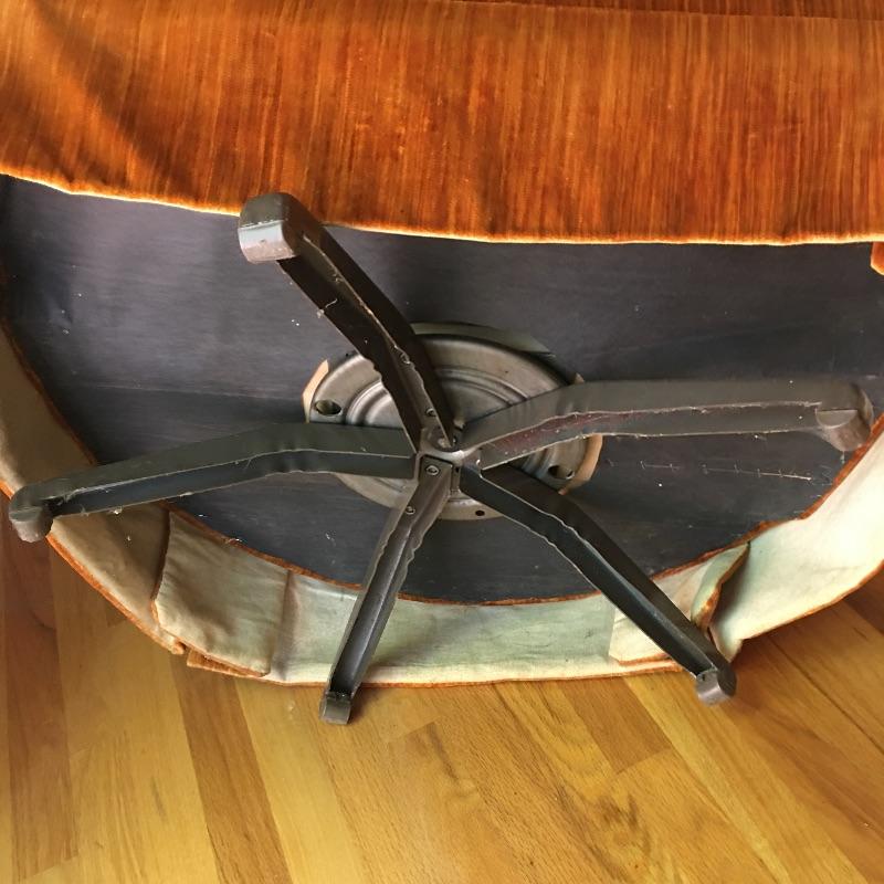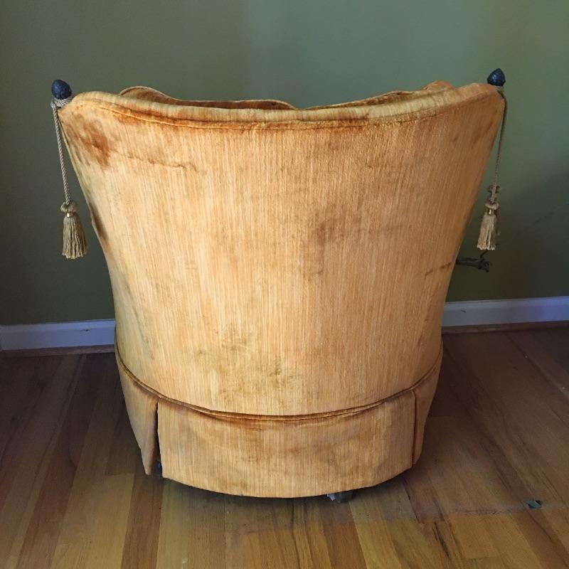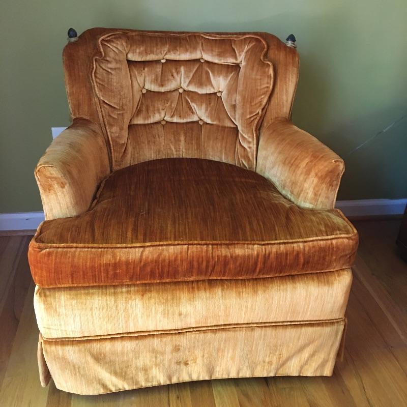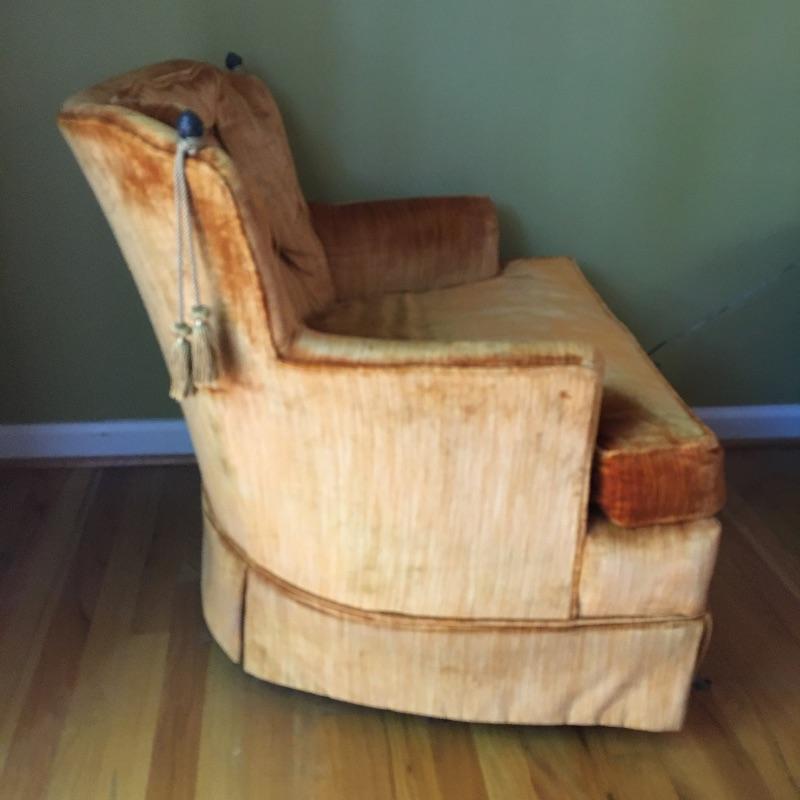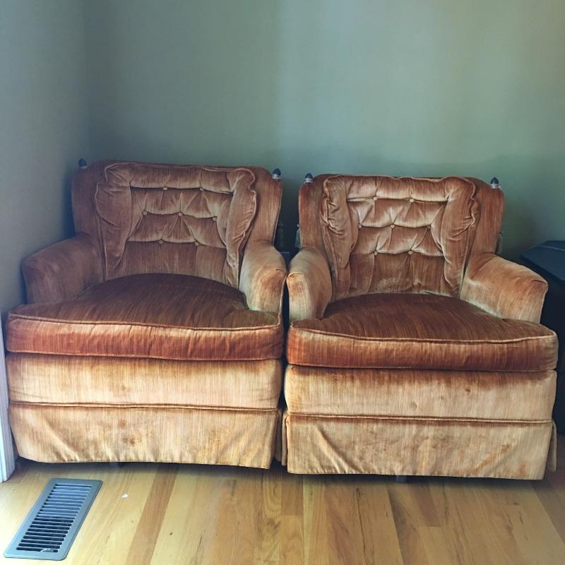 Two matching gold velour swivel chairs. A pair of retro gold velour chairs that are sure to bring back memories. Chairs measure 24” x 48” x 29” with a seat height of 17”.