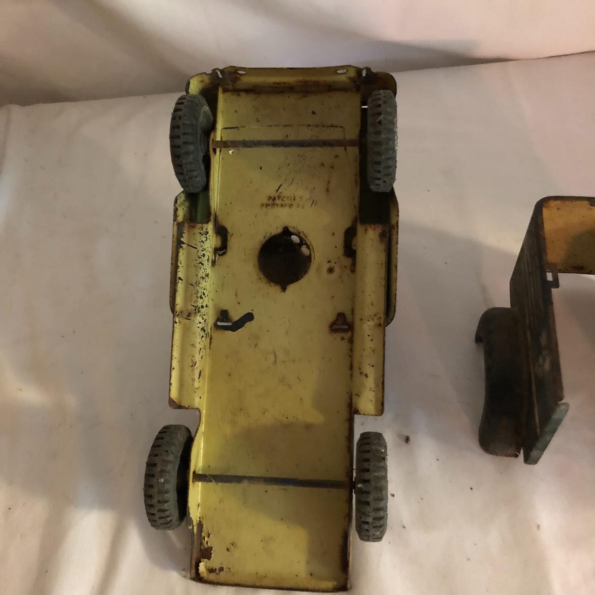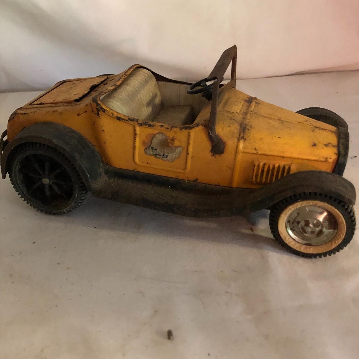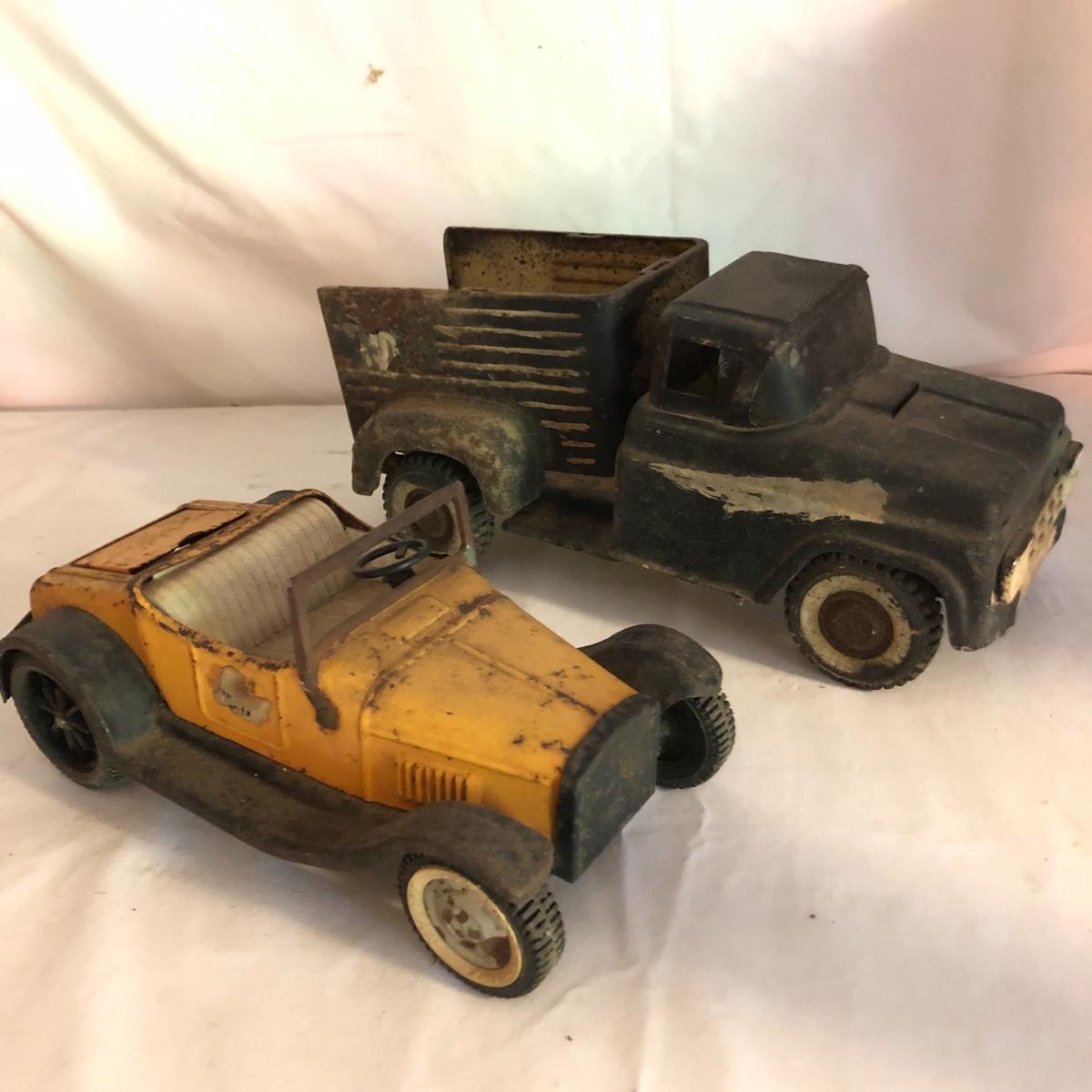 The yellow convertible car was made by Nylint, name on the truck is hard to decipher. Both vehicles are vintage and metal collectors items. The truck has a lot more rust than the car.