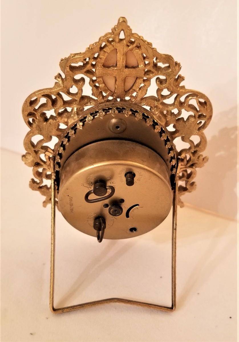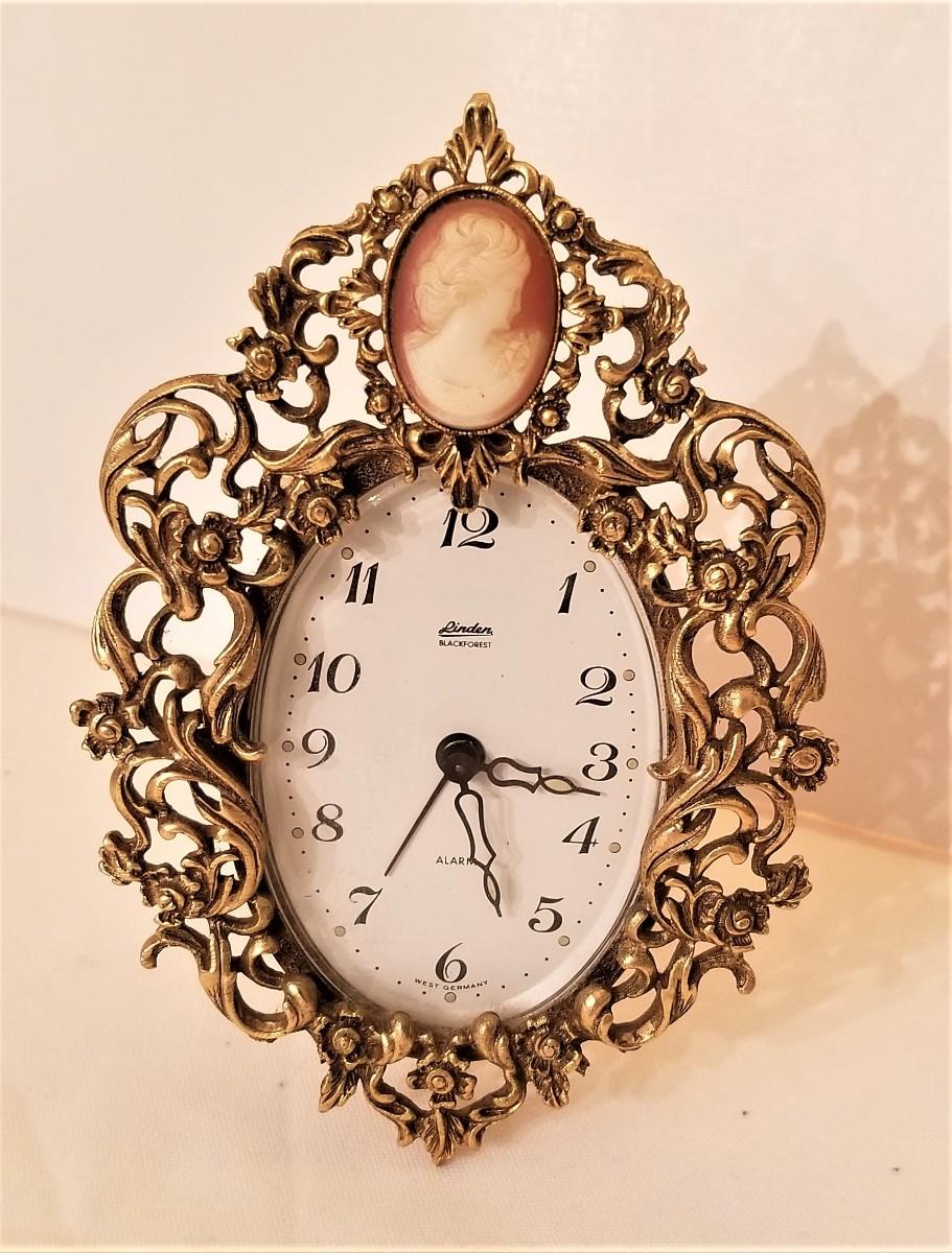 This is a little beauty that appears to be in good working condition - even has an alarm! Vintage vanity or dresser clock with metal filigree frame - inset faux cameo at top. Made by Linden Blackforest in West Germany. 5" tall.