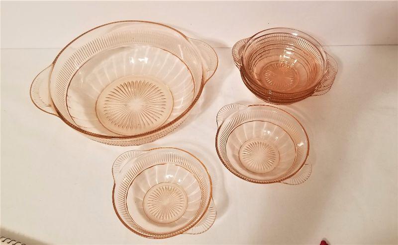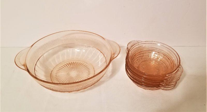 Berry Bowl set in pink glass - Depression-era. Very good condition. Large bowl and 6 serving bowls. Large bowl measures 9.5" across handle to handle. Small bowls are 5.5" across.