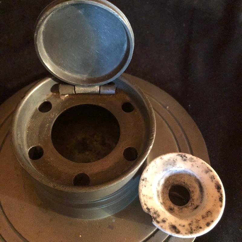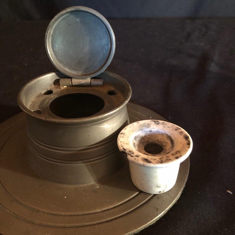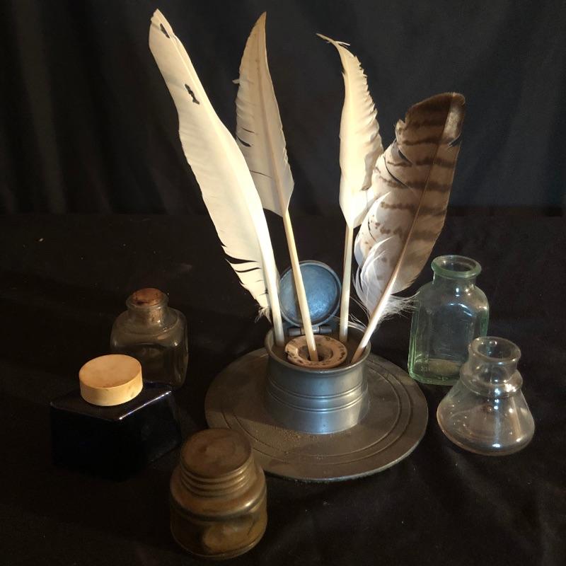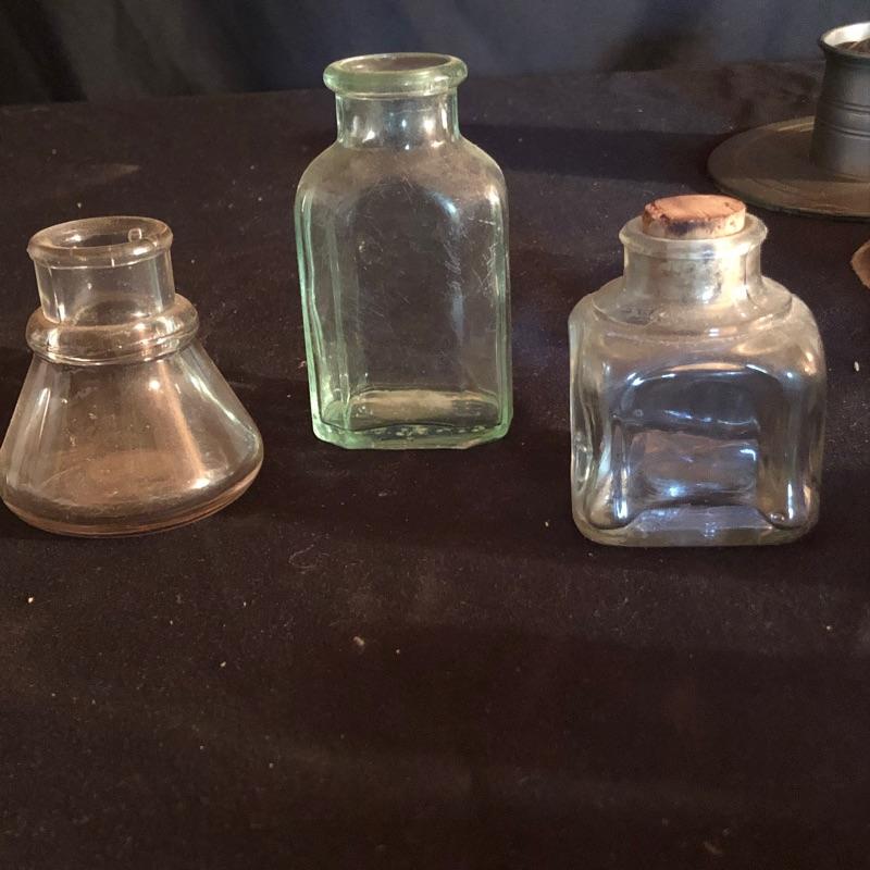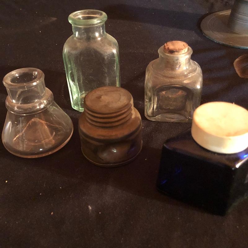 Go back in time with this metal ink well, quills and ink bottles. The inkwell is in good shape with just one nick in the ceramic ink container that is shown in the last image. We have also included 4 feather quills and numerous glass bottles and a small metal lidded tin that does have a sizable dent in the side.