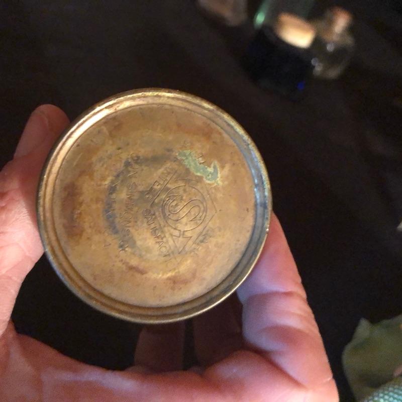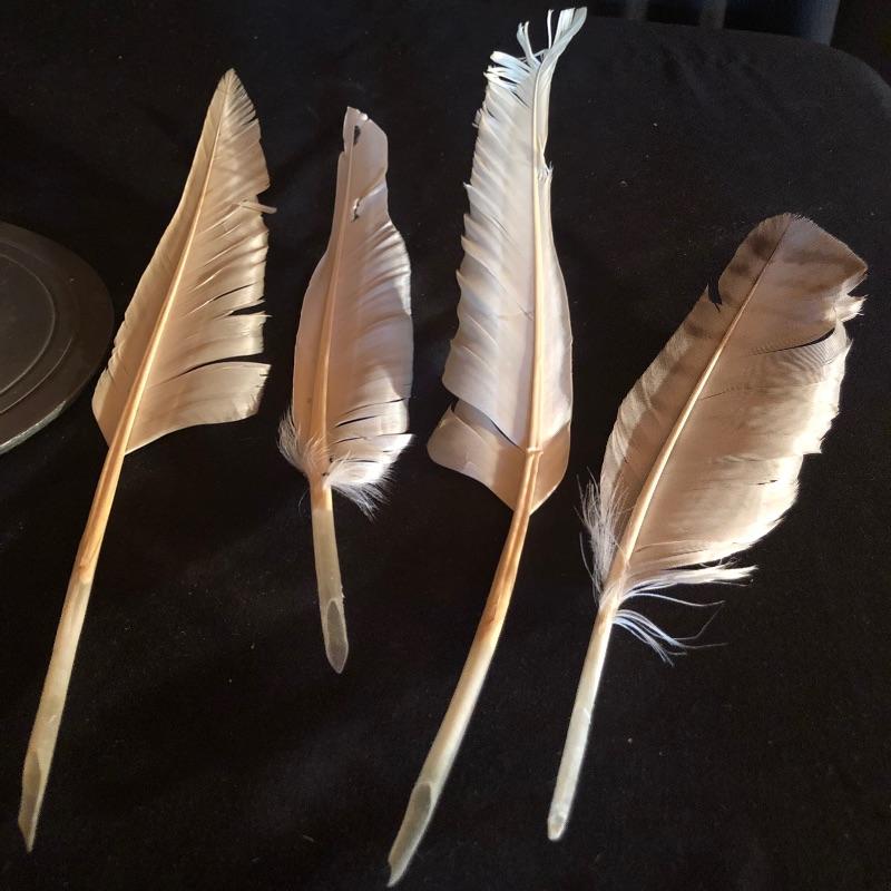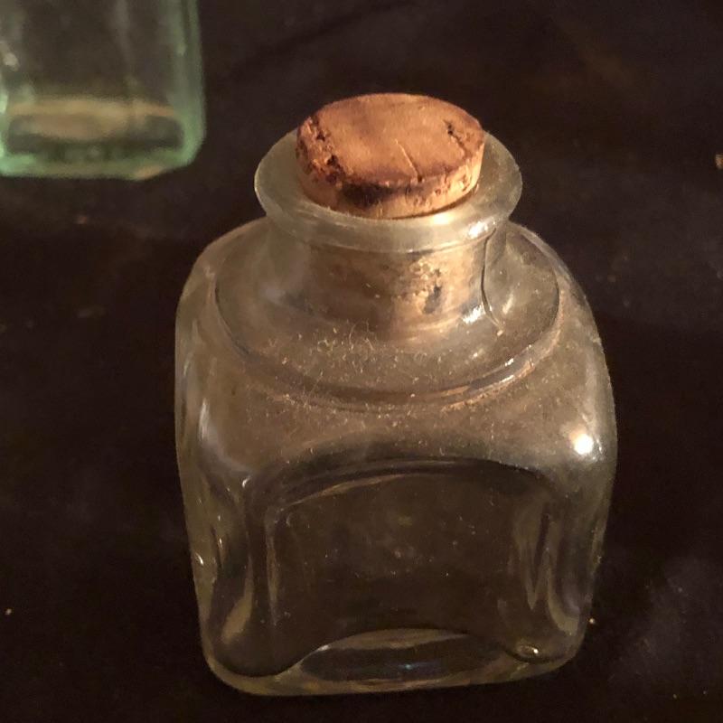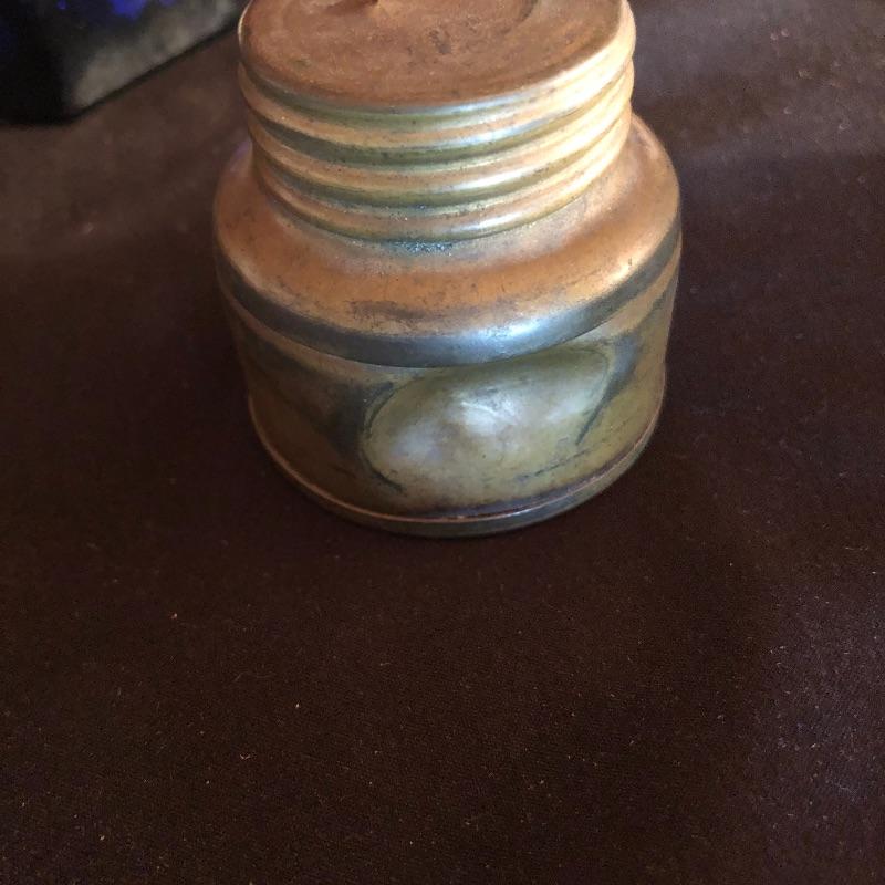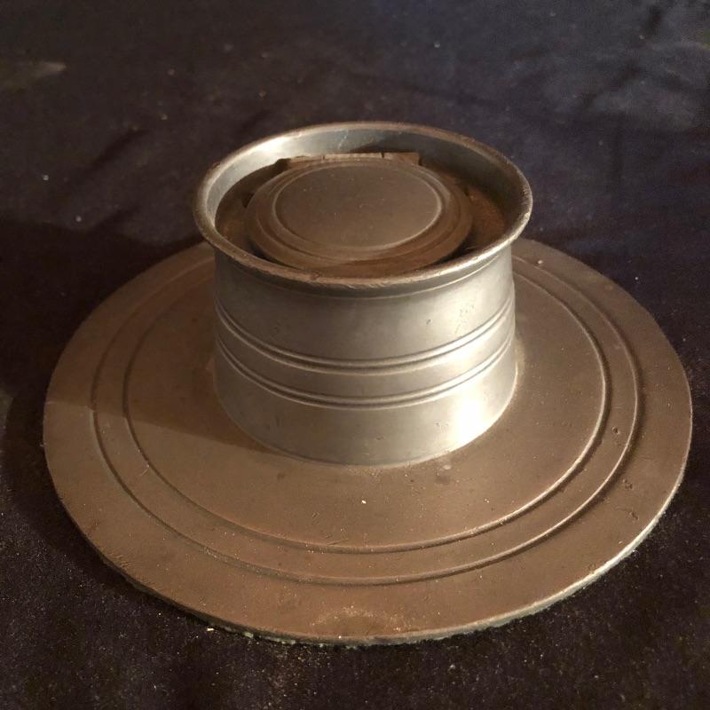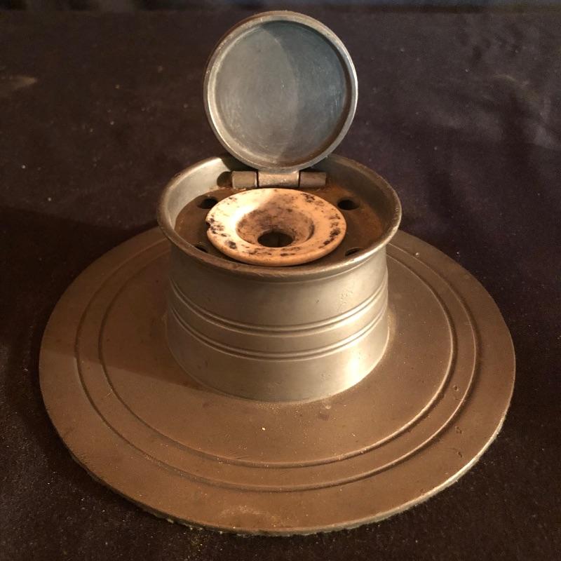 Go back in time with this metal ink well, quills and ink bottles. The inkwell is in good shape with just one nick in the ceramic ink container that is shown in the last image. We have also included 4 feather quills and numerous glass bottles and a small metal lidded tin that does have a sizable dent in the side.