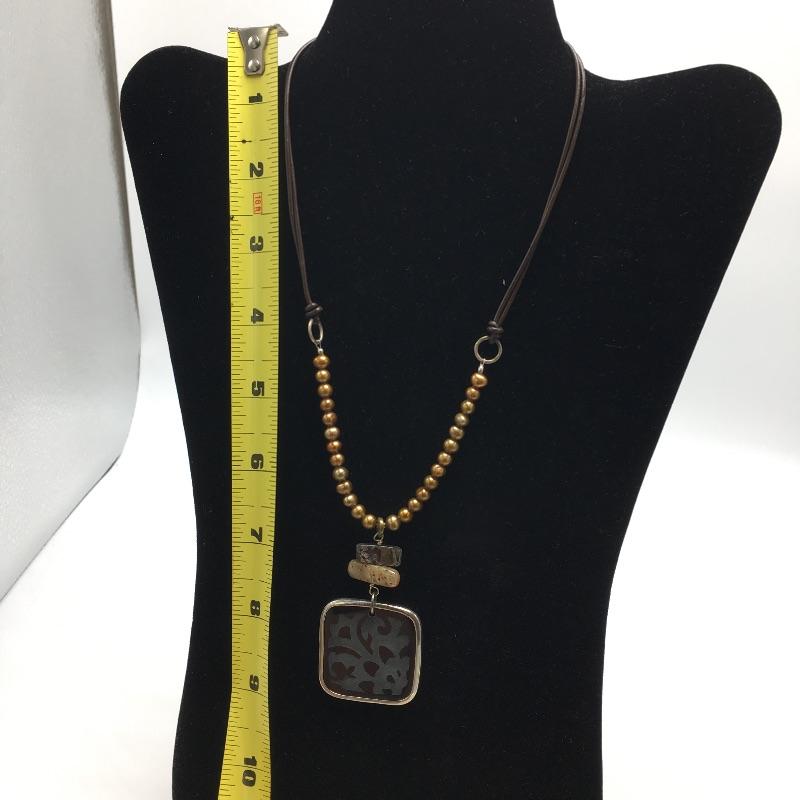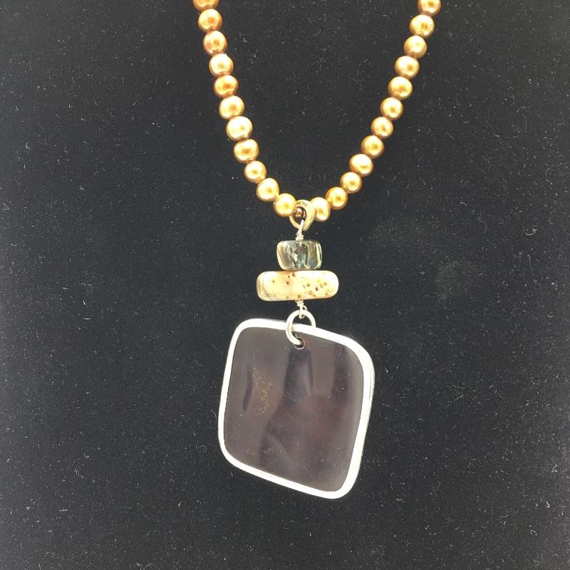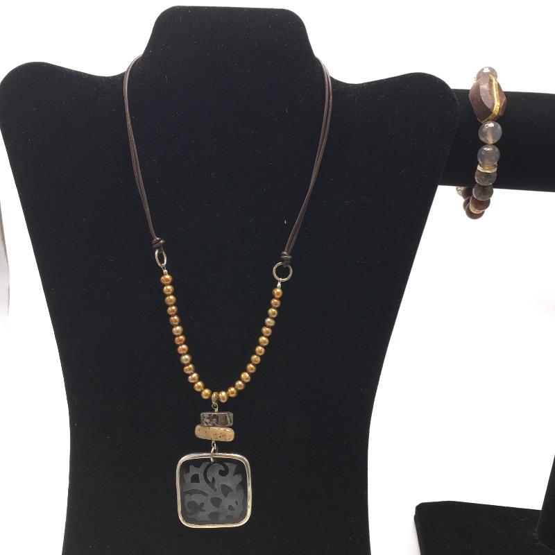 Silpada Wildwood stretch bracelet in Agate, brass, Swarovski crystals, wood and sterling silver with a 7” length and a bronze freshwater pearl, abalone shell, black lip shell, and sterling silver necklace that measures 16” long with a 2” extender.