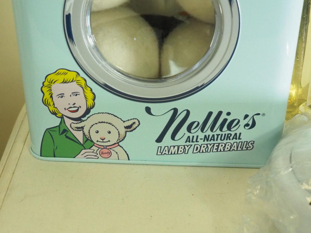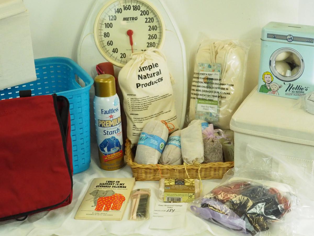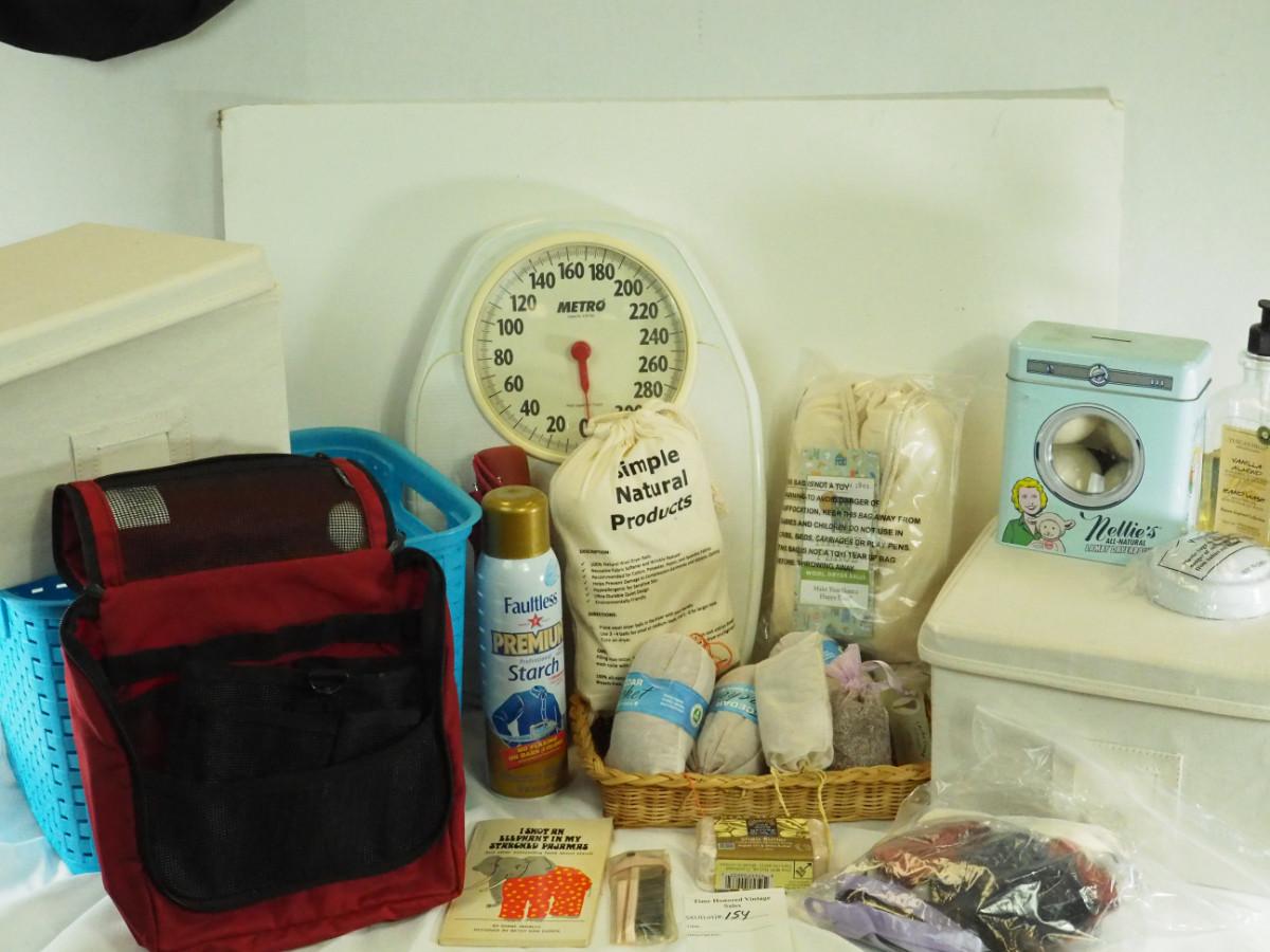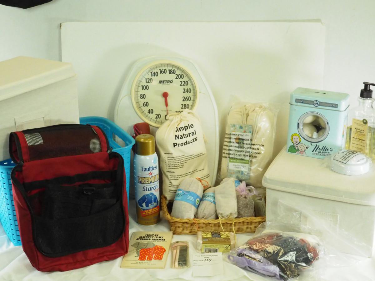 Lot 154- Nellie's natural dryer balls, Spray starch, potpourri, LL Bean organizer, baskets, vintage scale, canvas storage box.