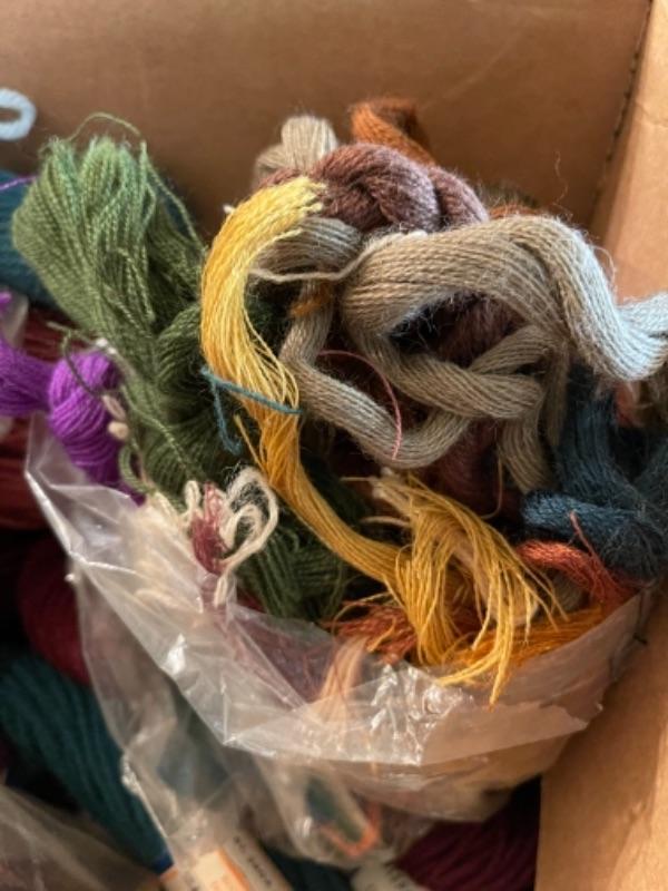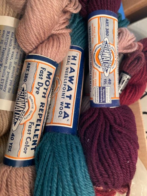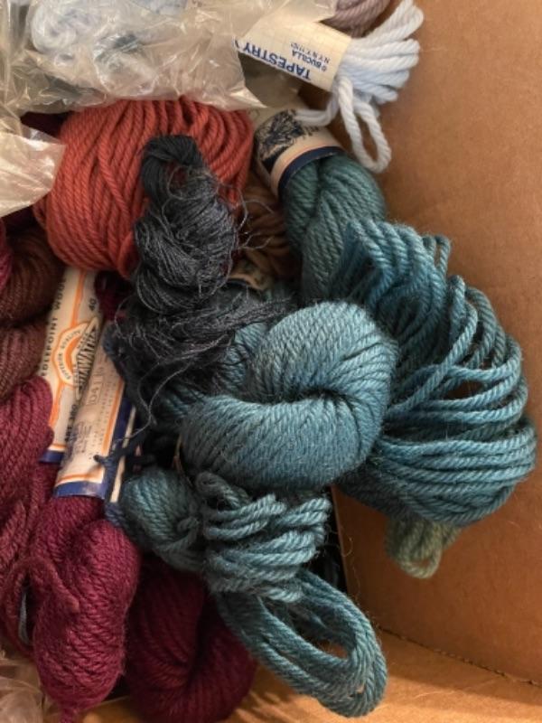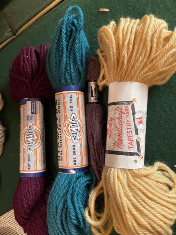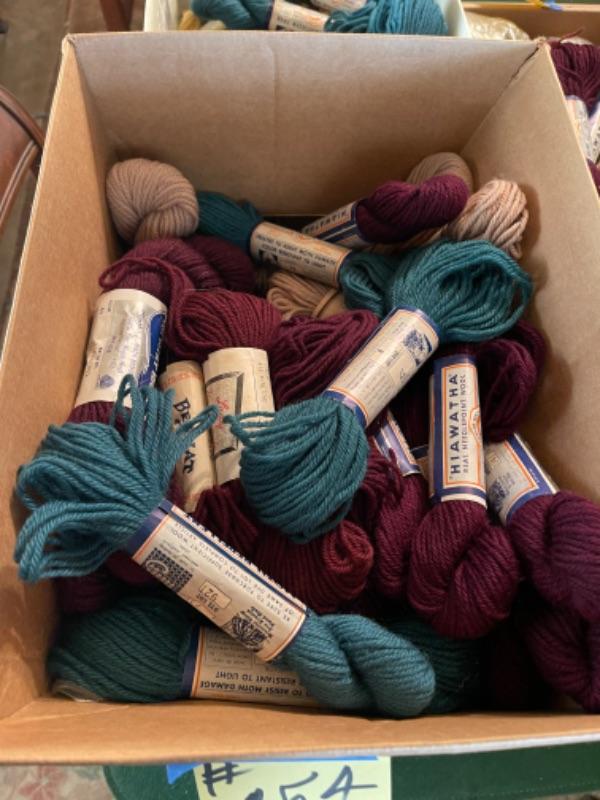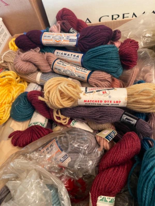 Lot 154DR. Large collection (hundreds of skeins) of needlepoint wool (Hiawatha, Bernat, Bucilla, Elsa Williams, Dritz, etc.) and unworked canvasses for completion--$250