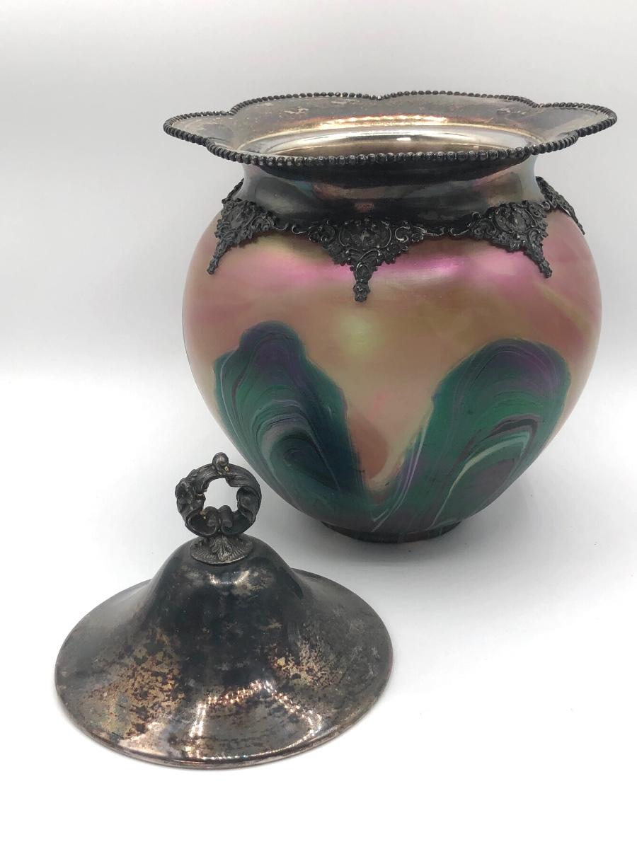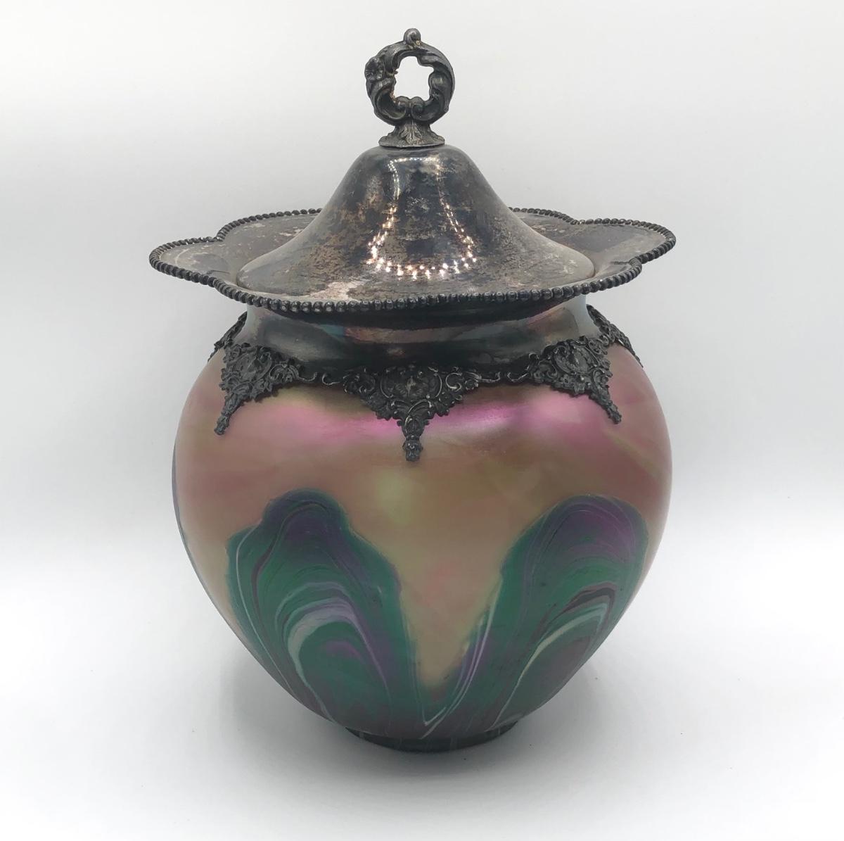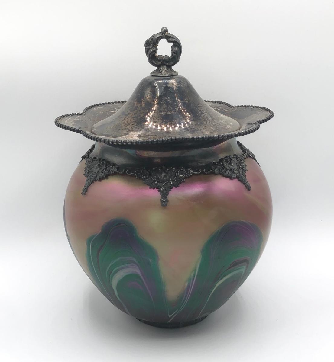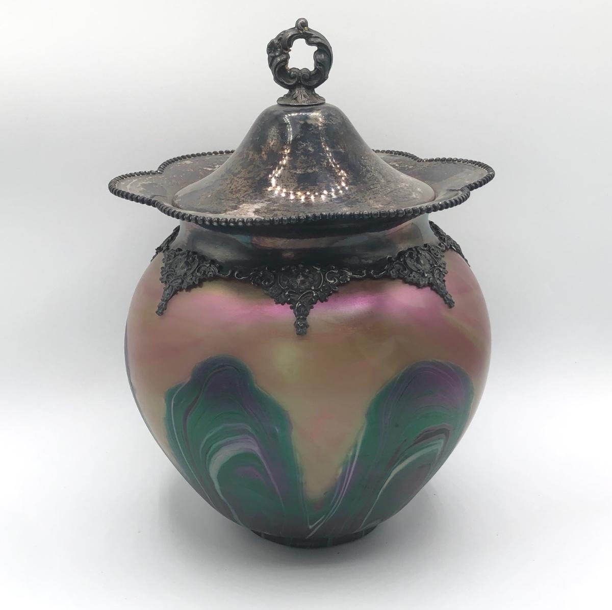 LOT 154F: Art Glass Loetz style Iridescent Covered Jar (silver plated lid)