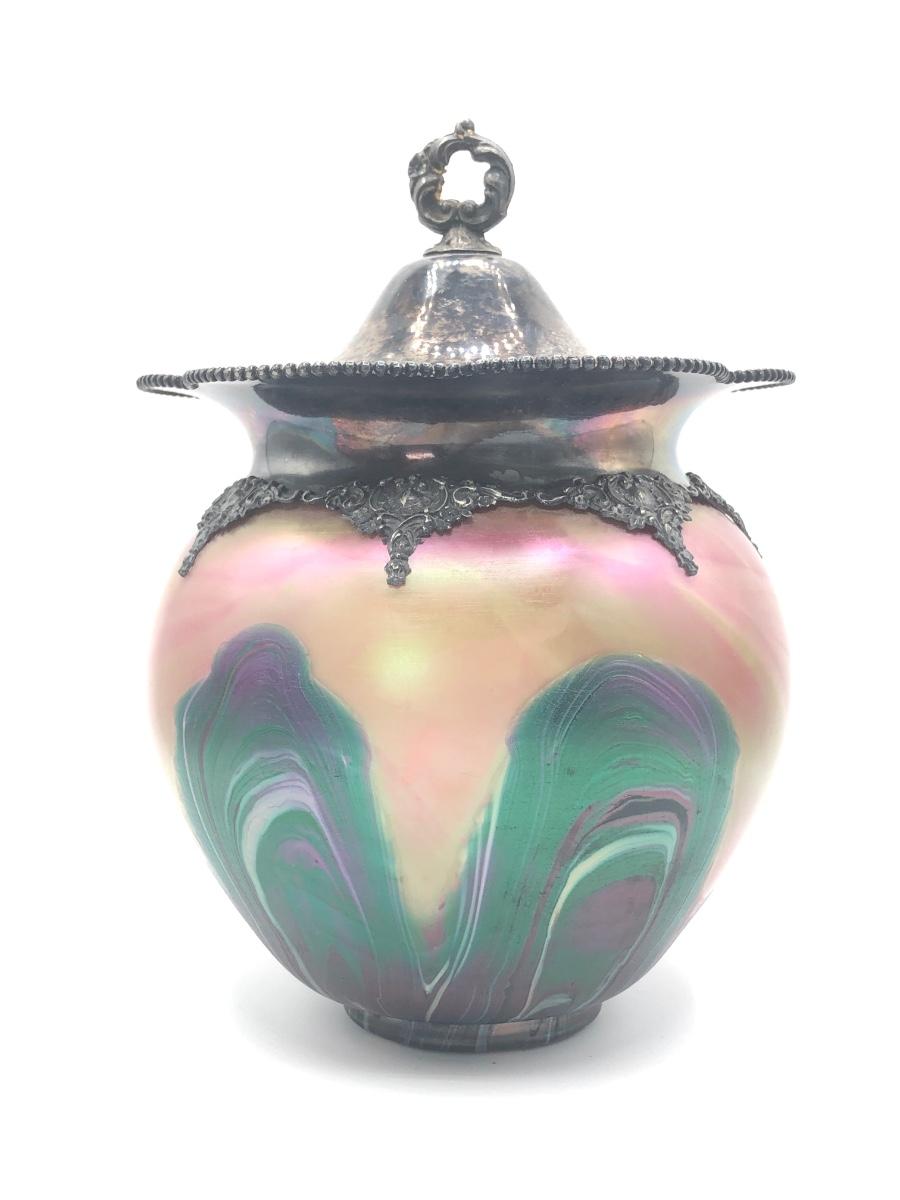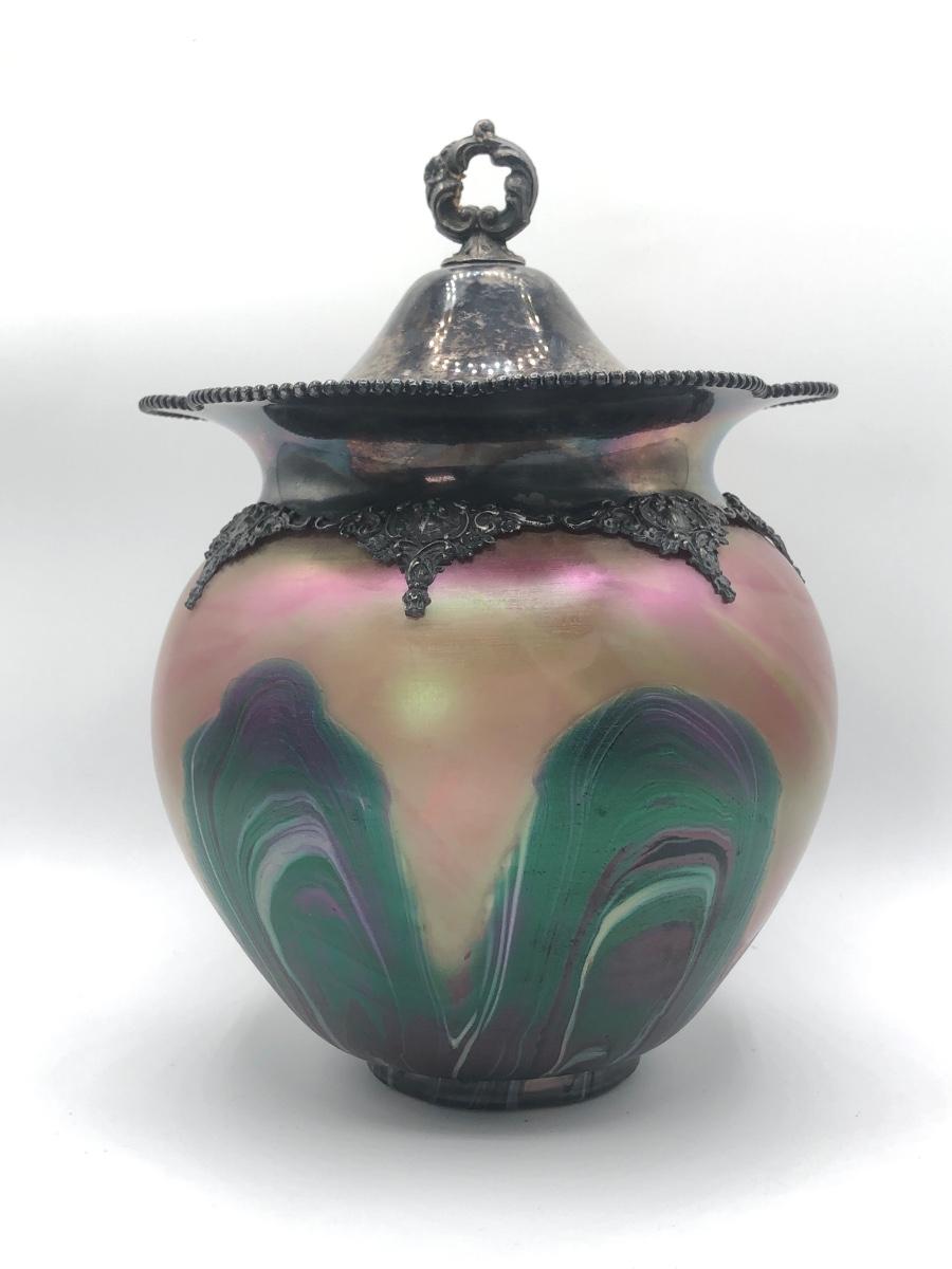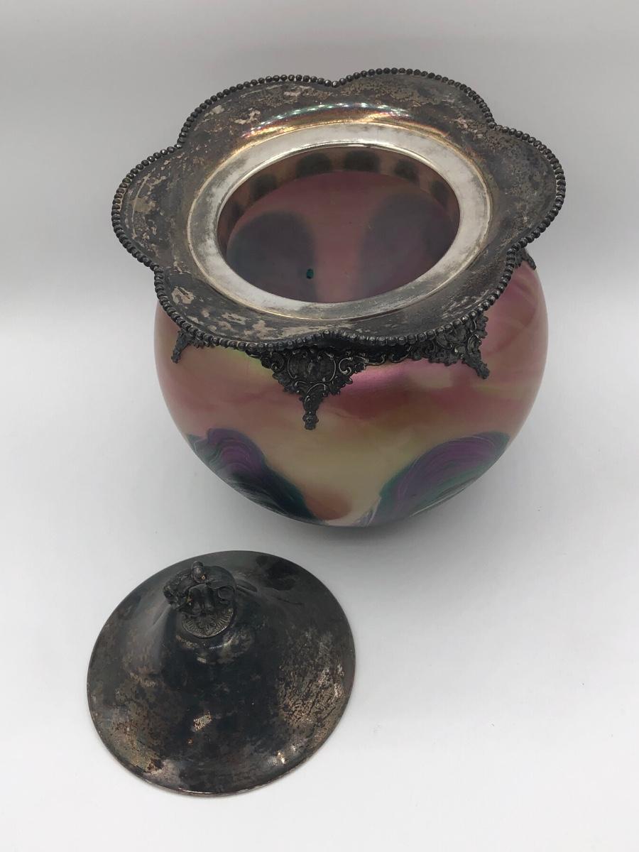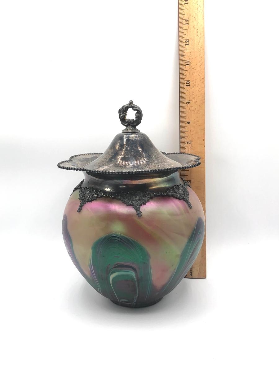 LOT 154F: Art Glass Loetz style Iridescent Covered Jar (silver plated lid)