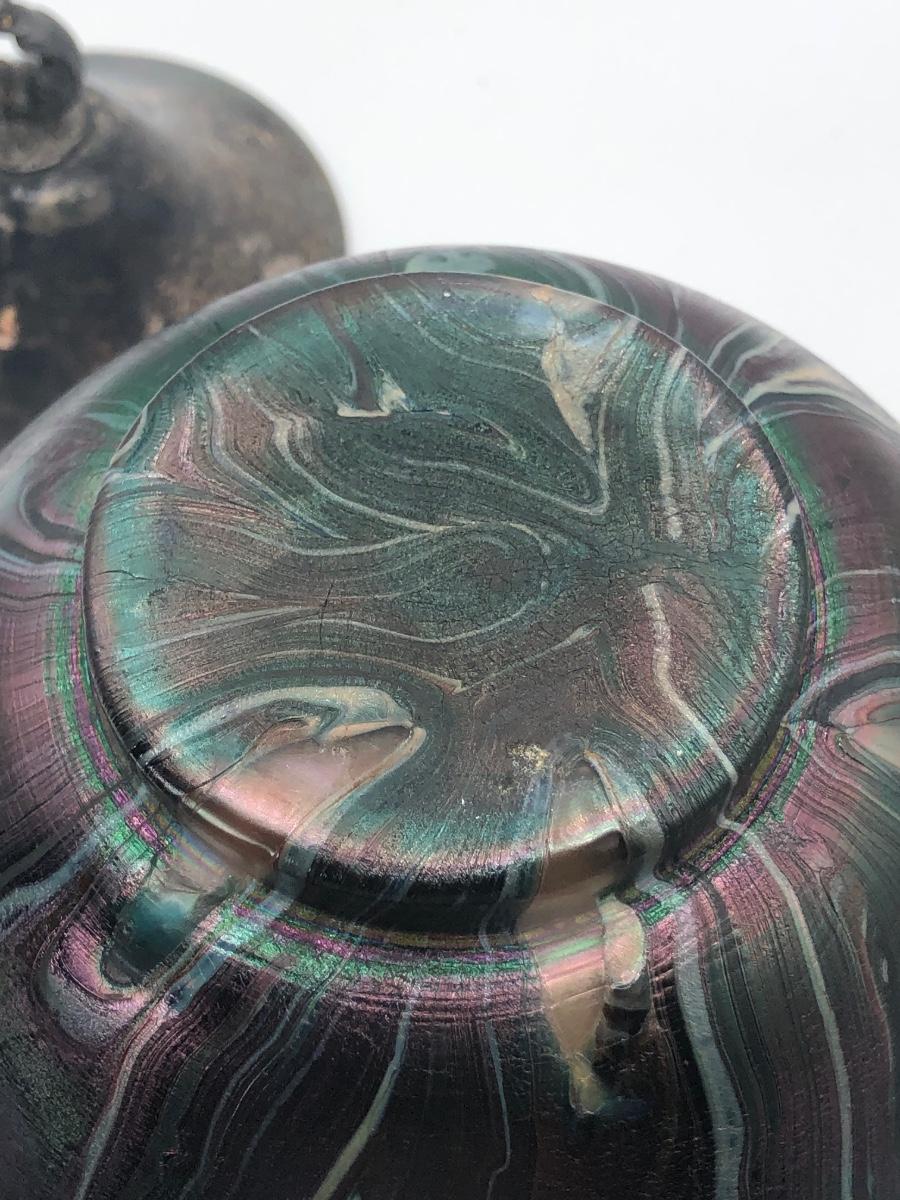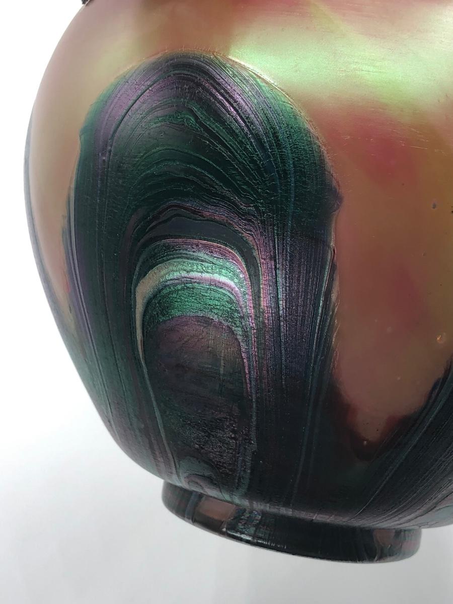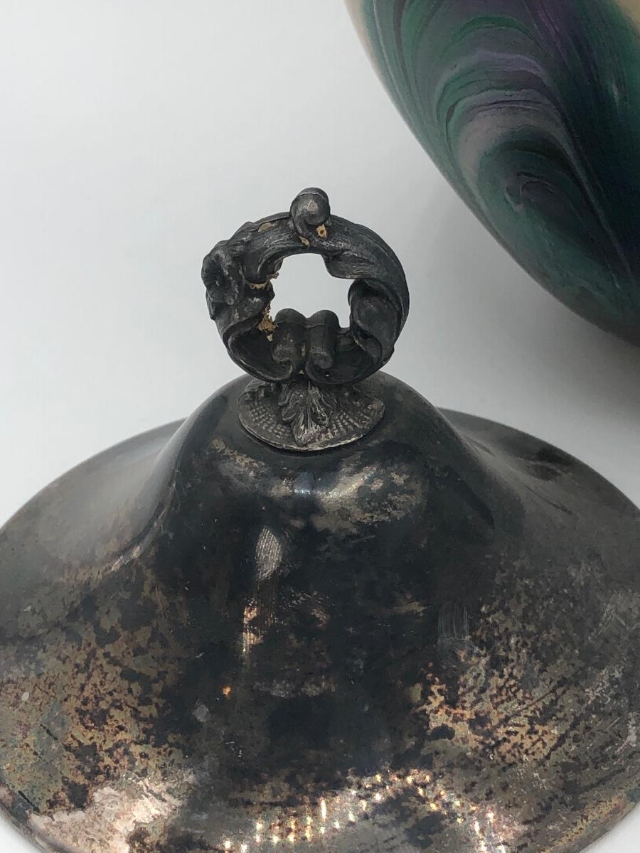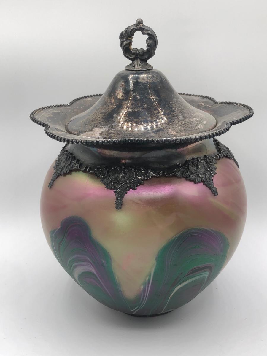LOT 154F: Art Glass Loetz style Iridescent Covered Jar (silver plated lid)