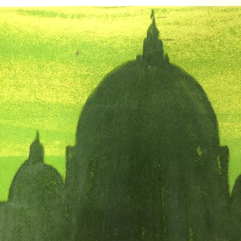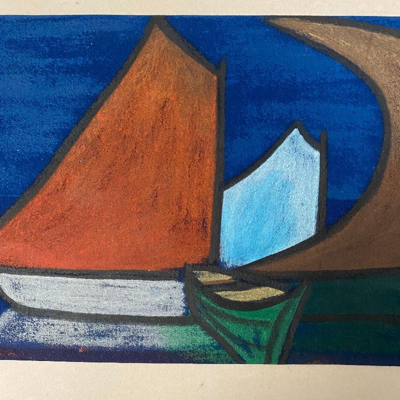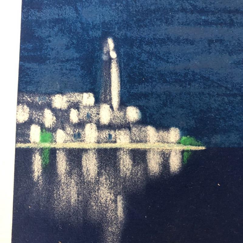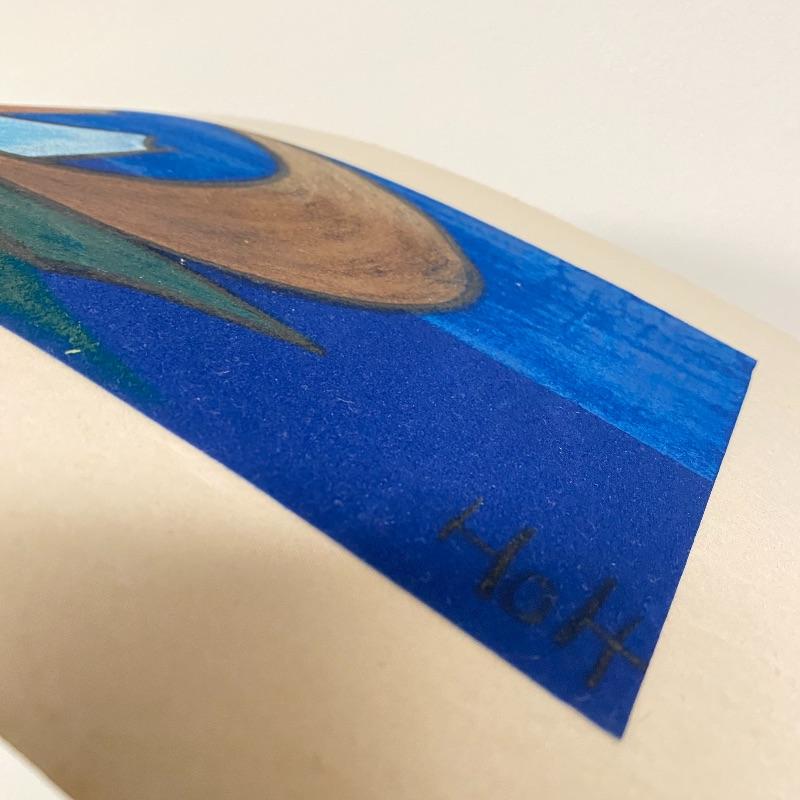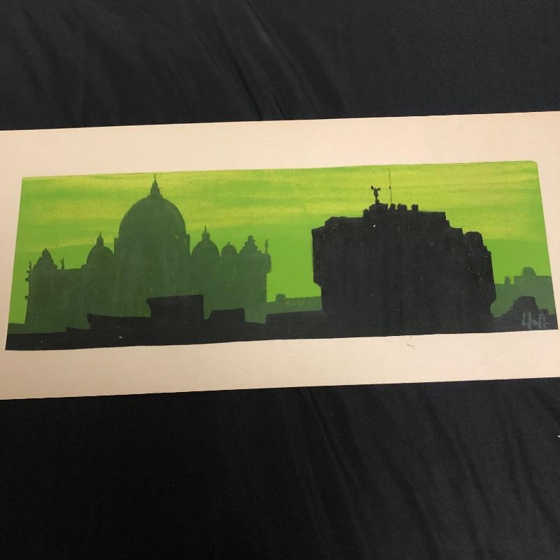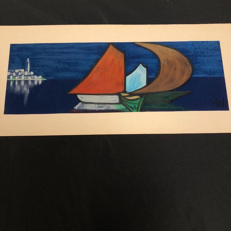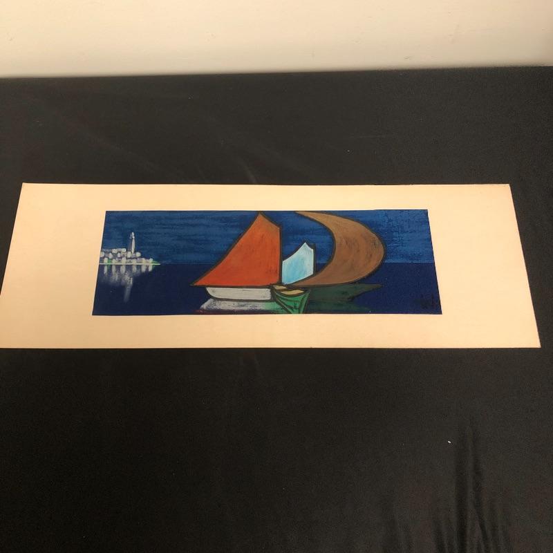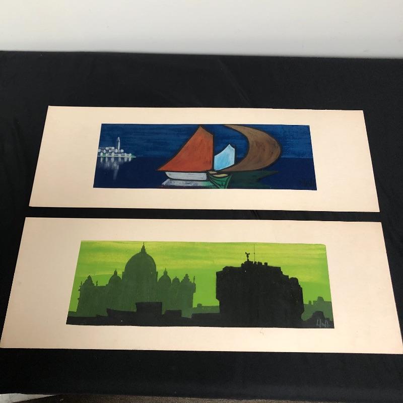 This lot contains two (28” x 10”) works by "Holt". The first depicts two sailboats and the second depicts a city skyline with a green background. They are of an unknown medium. It has a fuzzy texture. The signatures on both appear to be originals. They are both signed on the bottom right and are on a card stock paper.