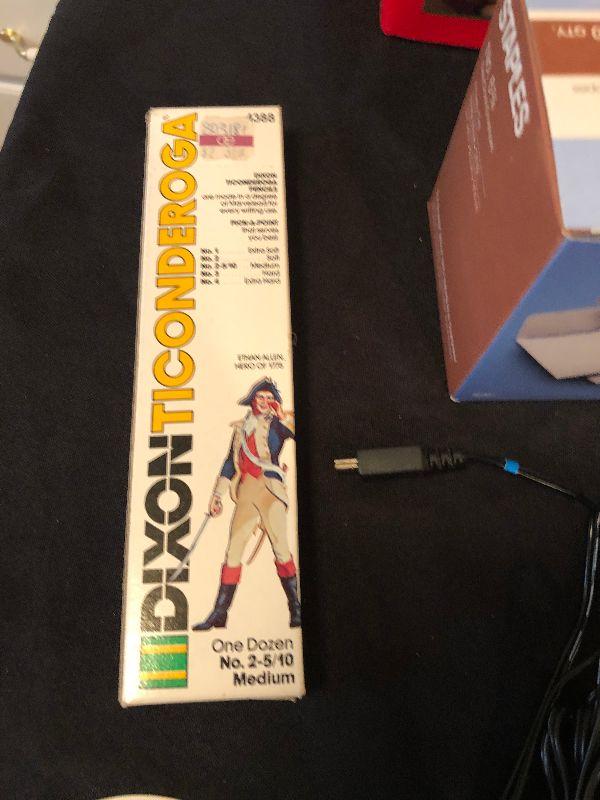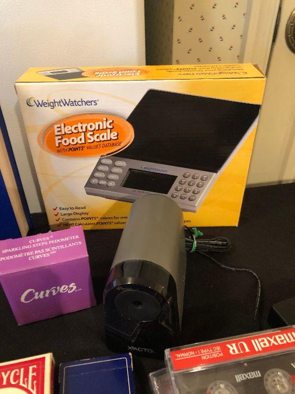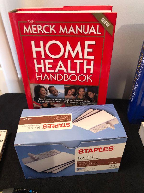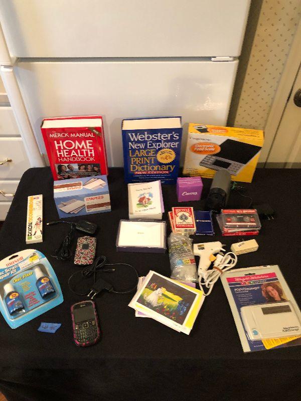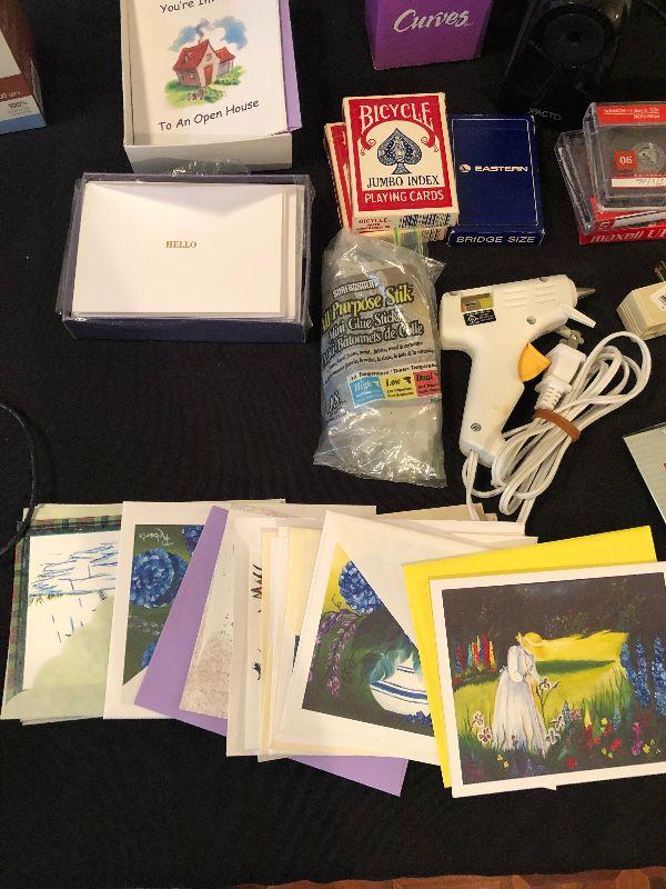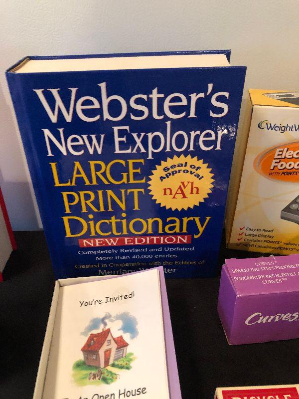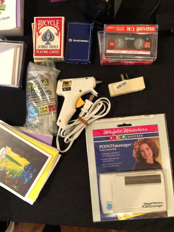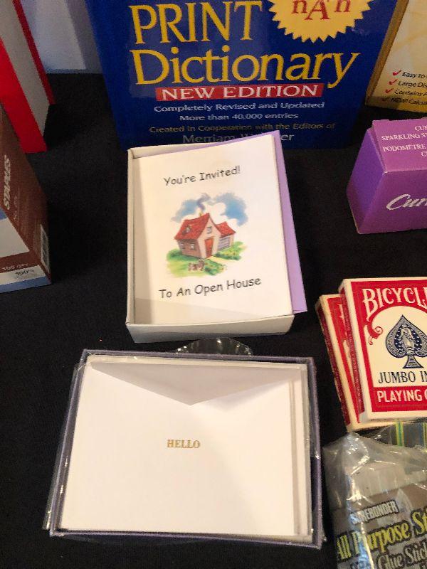 Assortment of Office Items including Books (Webster's New Explorer & Home Health Handbook), Greeting Cards, Envelopes, Glue Gun w/Sticks, #2 Pencils, Weight Watchers Food Scale and More.