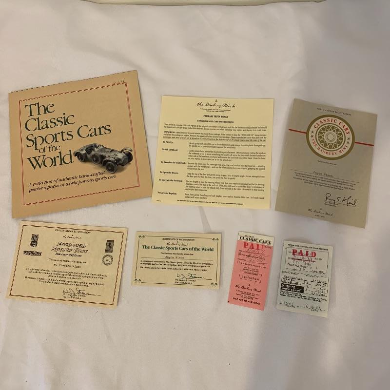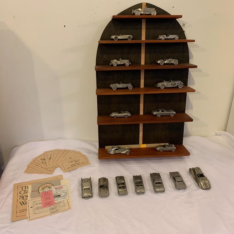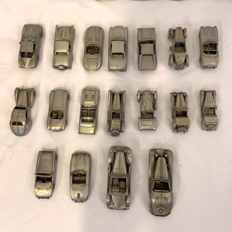 This lot contains 18 pewter Danbury Mint cars, with models such as Porche, Bugatti, Pantera, Ferrari, BMW, and more. There is some discoloration on a few of them, but most of them are in very good condition. The bottom of each car reads “Danbury Mint” as well as the make and model of each car. Each car is about 4”. Local pickup only.