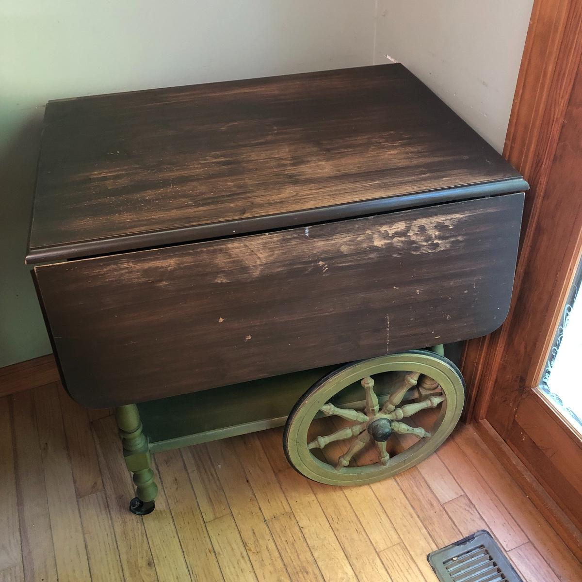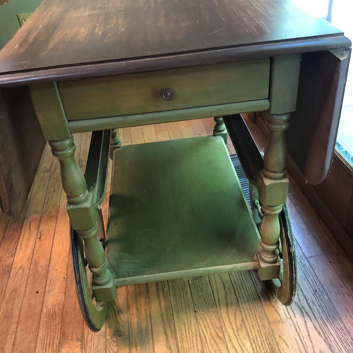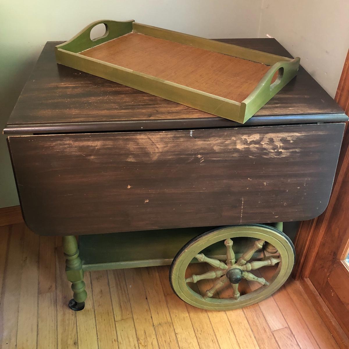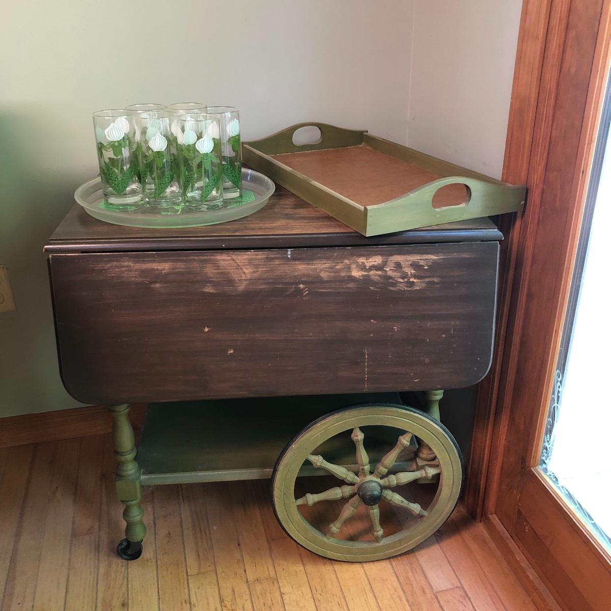 Serve your guests in style or display your favorite items with this kitchen cart and glass set! This solid wood cart has a removable tray (21” x 12”) to help carry your food or drinks and also then becomes part of the cart. Both sides of the cart extend transforming the cart into a table. It has been stained both brown and a light green. The cart with the sides up measures 39” x 27.5”.. With the sides collapsed, the cart measures 20” x 27.5”. Note the cute dovetailed drawer on the front! Please note the discoloration, light scratches on the cart-which may be easily remedied with scratch cover polish. Enjoy your summer drink in the adorable glasses with complimentary tray! The six glasses are glass and the serving tray is plastic. The tray measures 13.5” in diameter. Local pick up only.