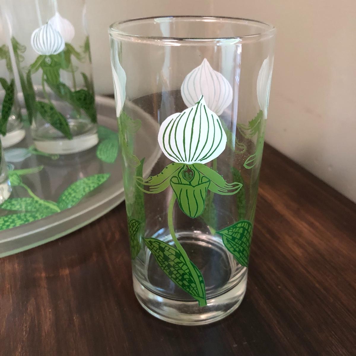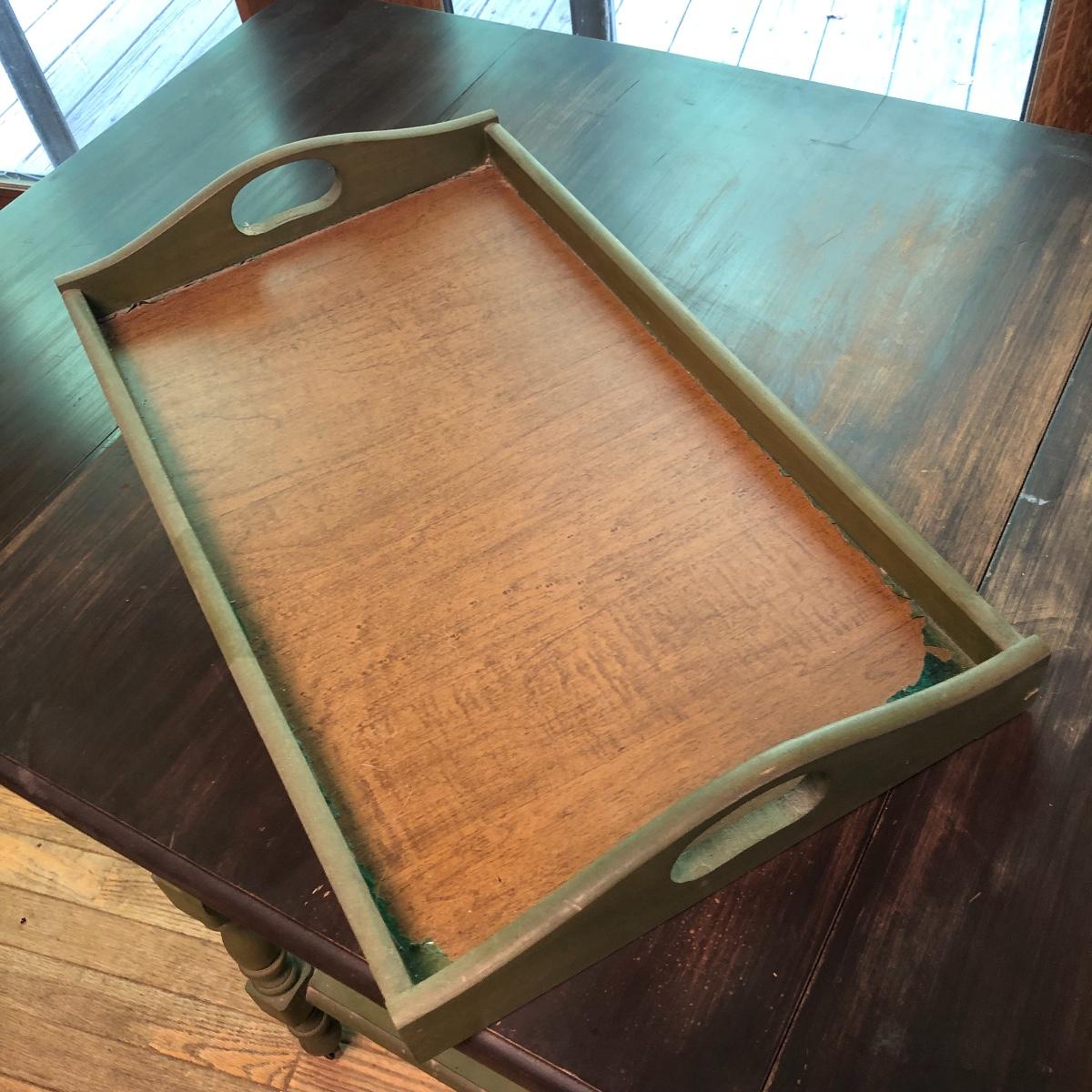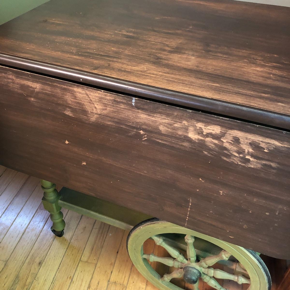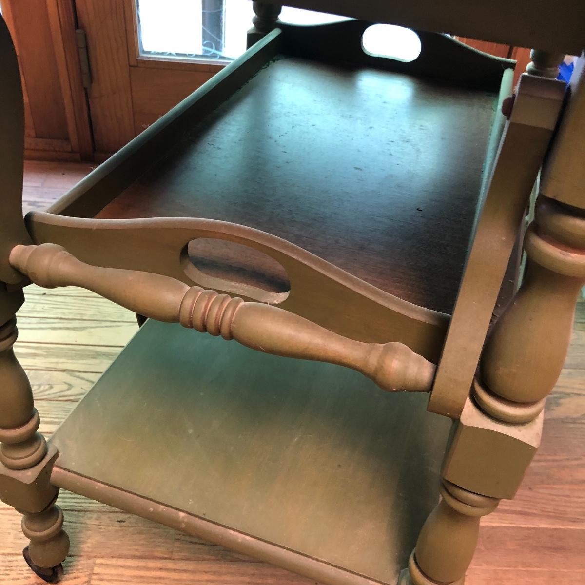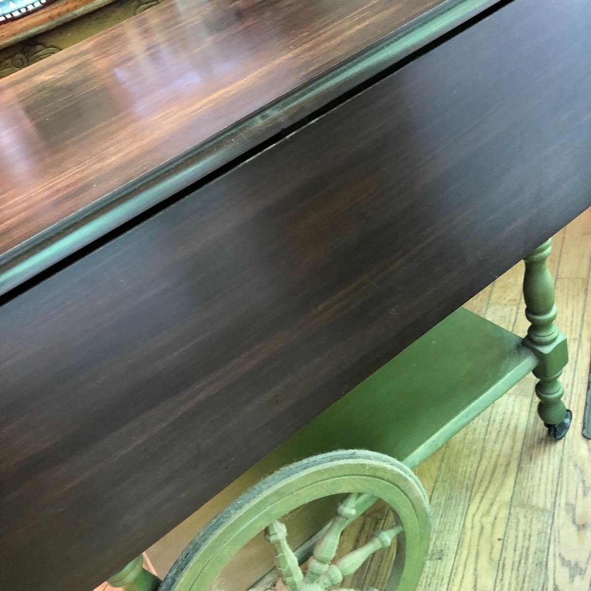 Serve your guests in style or display your favorite items with this kitchen cart and glass set! This solid wood cart has a removable tray (21” x 12”) to help carry your food or drinks and also then becomes part of the cart. Both sides of the cart extend transforming the cart into a table. It has been stained both brown and a light green. The cart with the sides up measures 39” x 27.5”.. With the sides collapsed, the cart measures 20” x 27.5”. Note the cute dovetailed drawer on the front! Please note the discoloration, light scratches on the cart-which may be easily remedied with scratch cover polish. Enjoy your summer drink in the adorable glasses with complimentary tray! The six glasses are glass and the serving tray is plastic. The tray measures 13.5” in diameter. Local pick up only.