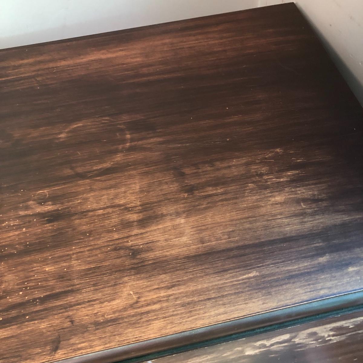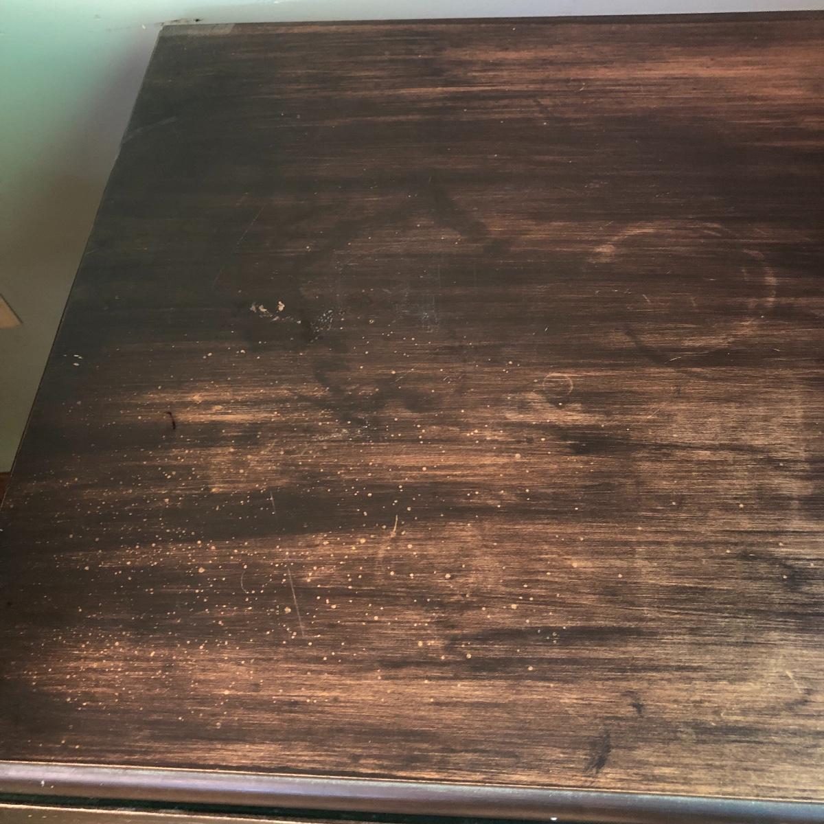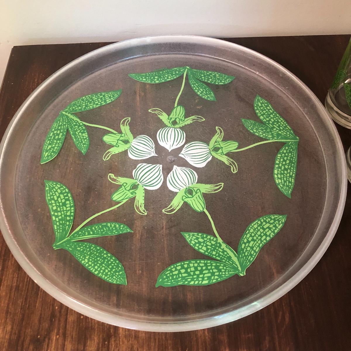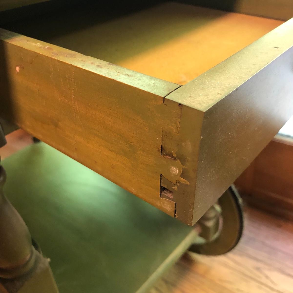 Serve your guests in style or display your favorite items with this kitchen cart and glass set! This solid wood cart has a removable tray (21” x 12”) to help carry your food or drinks and also then becomes part of the cart. Both sides of the cart extend transforming the cart into a table. It has been stained both brown and a light green. The cart with the sides up measures 39” x 27.5”.. With the sides collapsed, the cart measures 20” x 27.5”. Note the cute dovetailed drawer on the front! Please note the discoloration, light scratches on the cart-which may be easily remedied with scratch cover polish. Enjoy your summer drink in the adorable glasses with complimentary tray! The six glasses are glass and the serving tray is plastic. The tray measures 13.5” in diameter. Local pick up only.