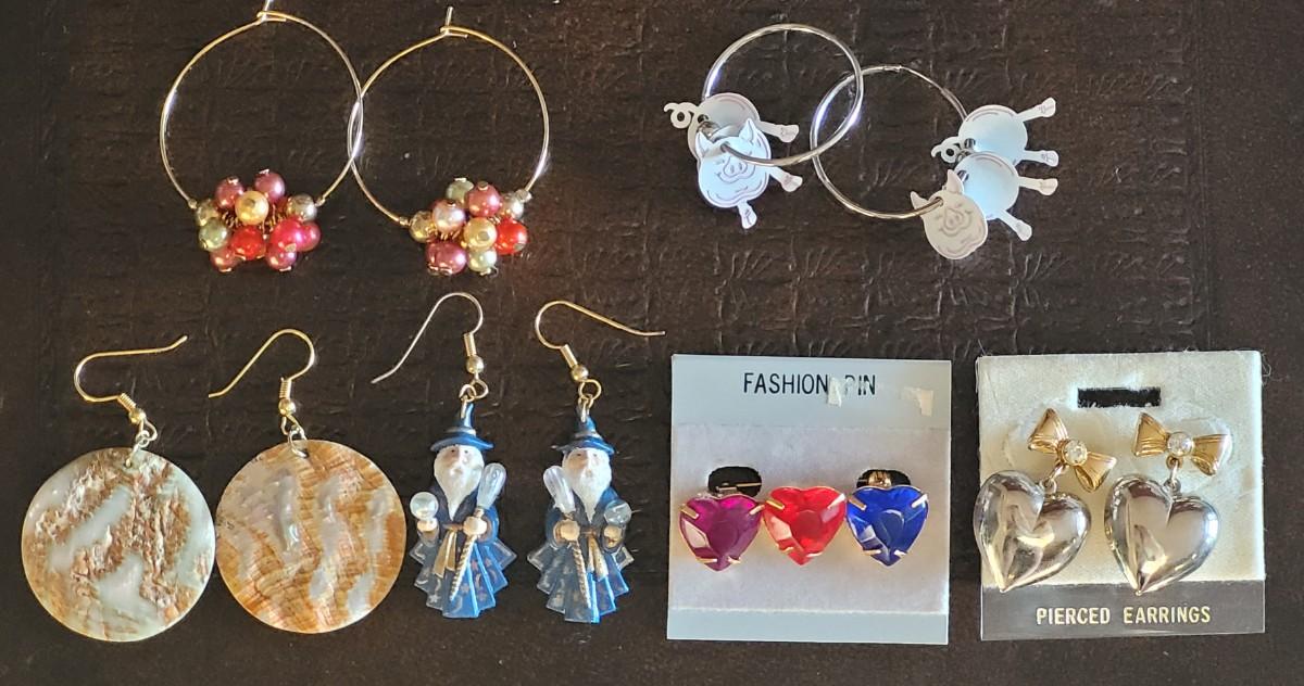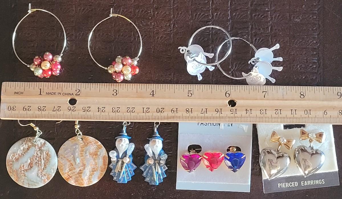 Lot 155: Earring Lot - gold tone, Beads, Rhinestones, Abalone, Wizards & Pigs