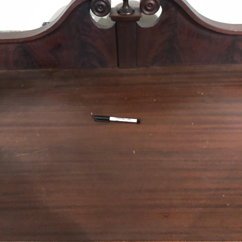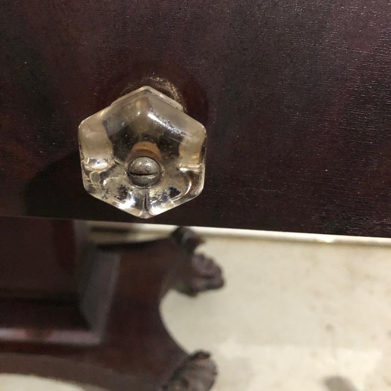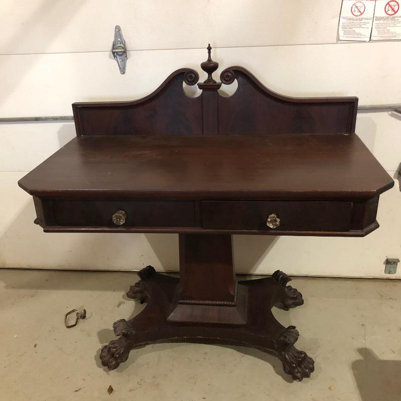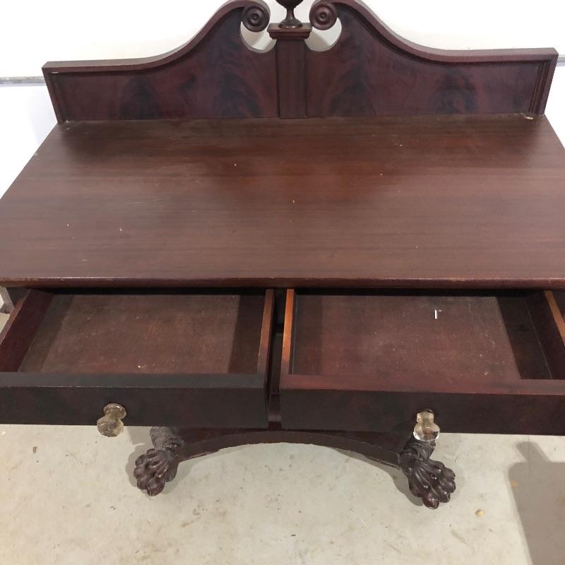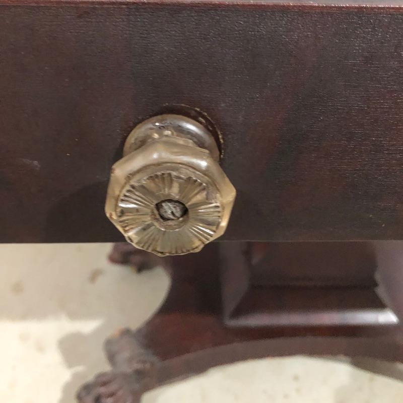 This pedestal style table/desk is a beauty! On rolling castors that sit underneath it’s claw feet, it has two dovetailed drawers with glass knob handles; these handles do not match and one needs to be secured back into place. There are some blemishes that are shown in images, mainly just scratches on the surface of the desk and some damage on one of the feet.