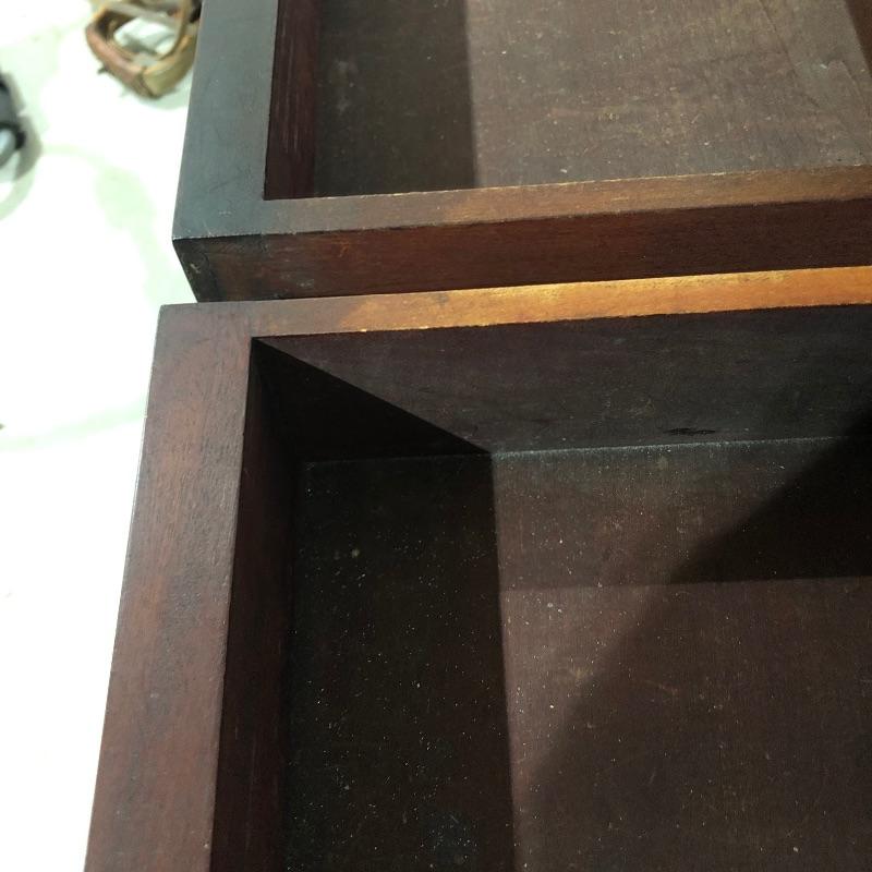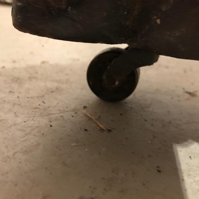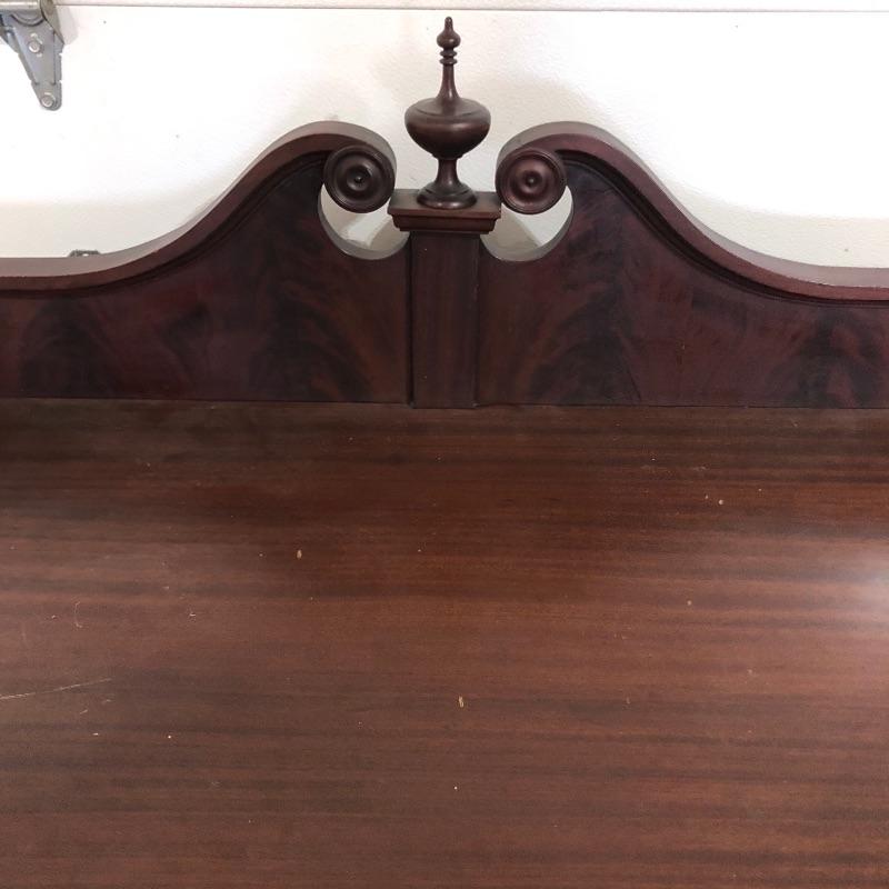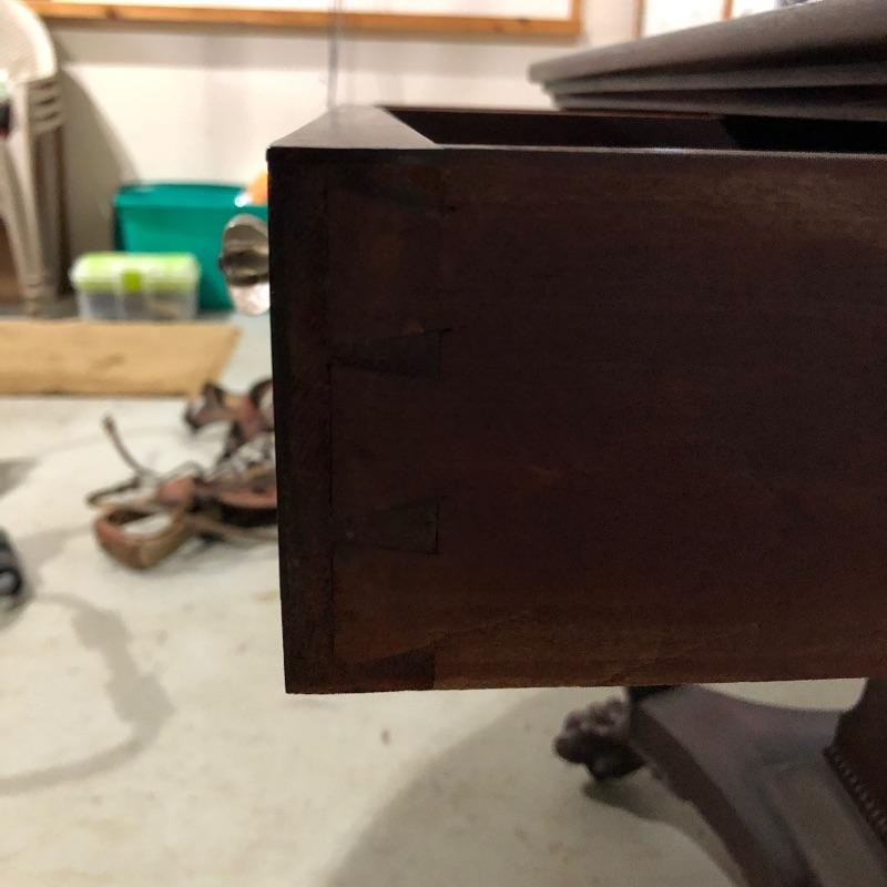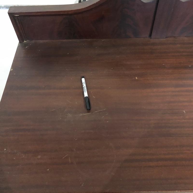This pedestal style table/desk is a beauty! On rolling castors that sit underneath it’s claw feet, it has two dovetailed drawers with glass knob handles; these handles do not match and one needs to be secured back into place. There are some blemishes that are shown in images, mainly just scratches on the surface of the desk and some damage on one of the feet.