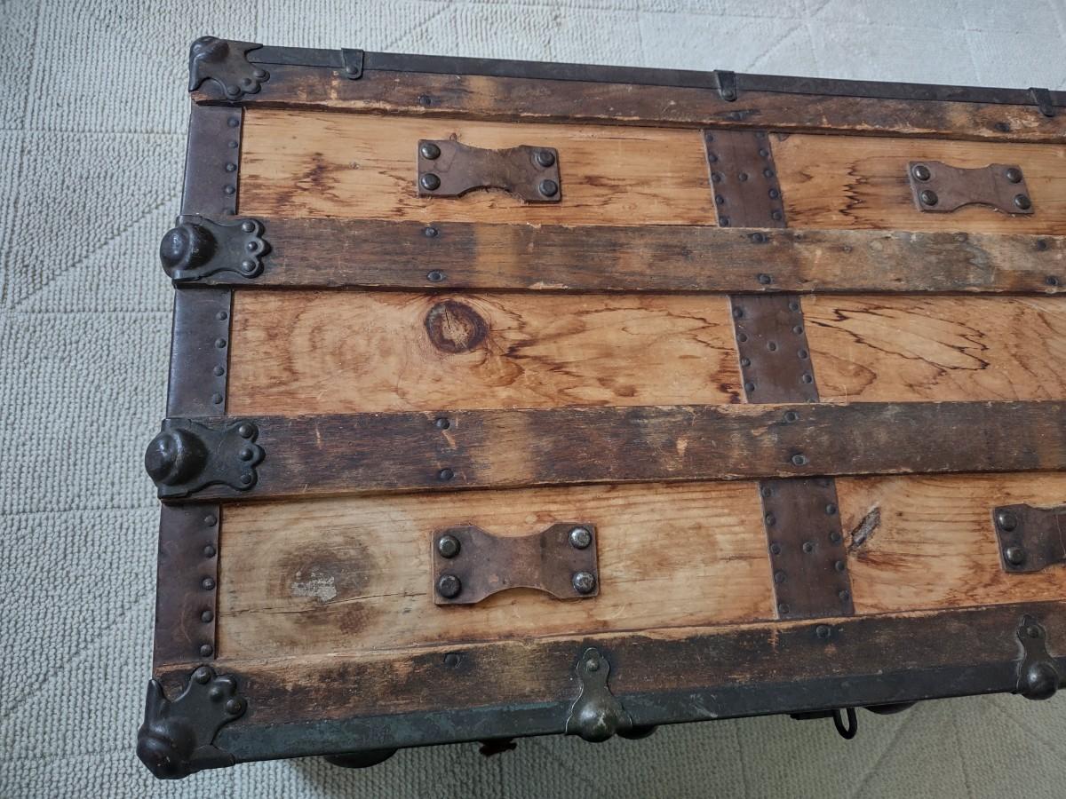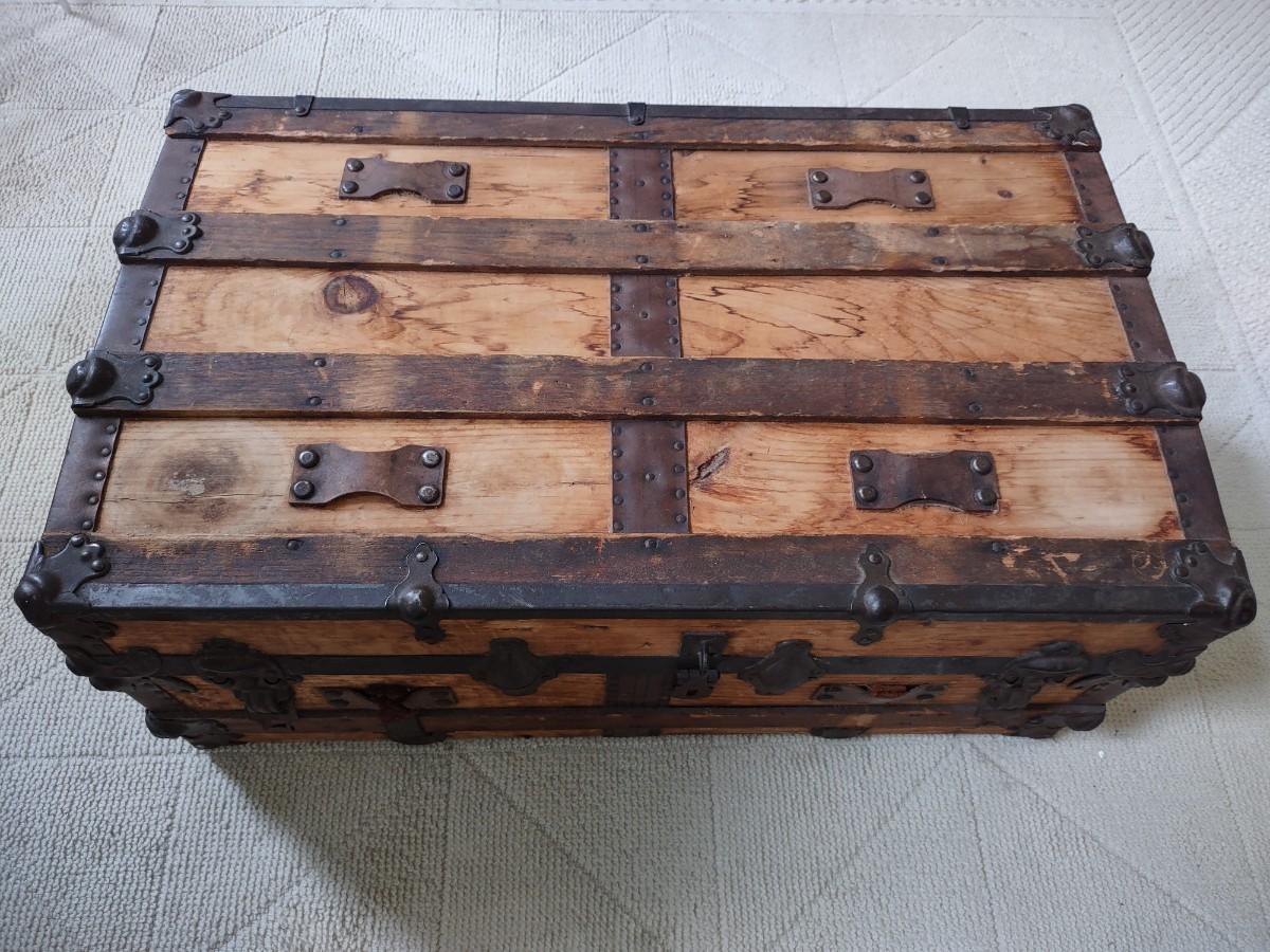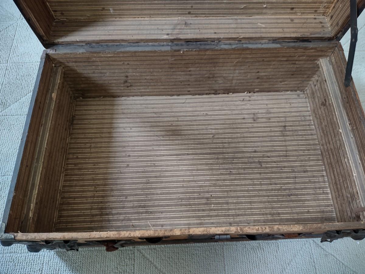 31x18x13 inches tall. Gorgeous antique trunk. The wood on this is incredible! The client collected antique trunks and repaired them or accented them for home decor with function! No handles. Please see all pictures for content of the lot, condition of the lot, and measurements if taken. Pictures are the best representation of the items listed and items are untested unless indicated in description. Thank you for looking and have fun bidding!