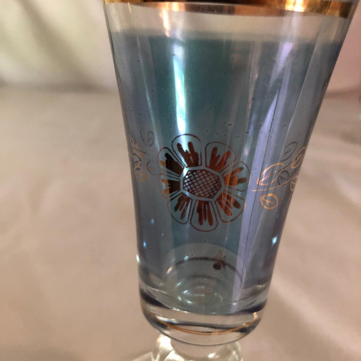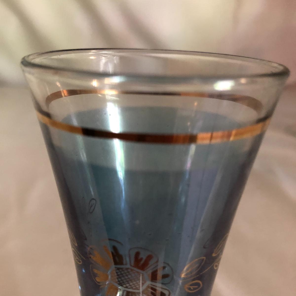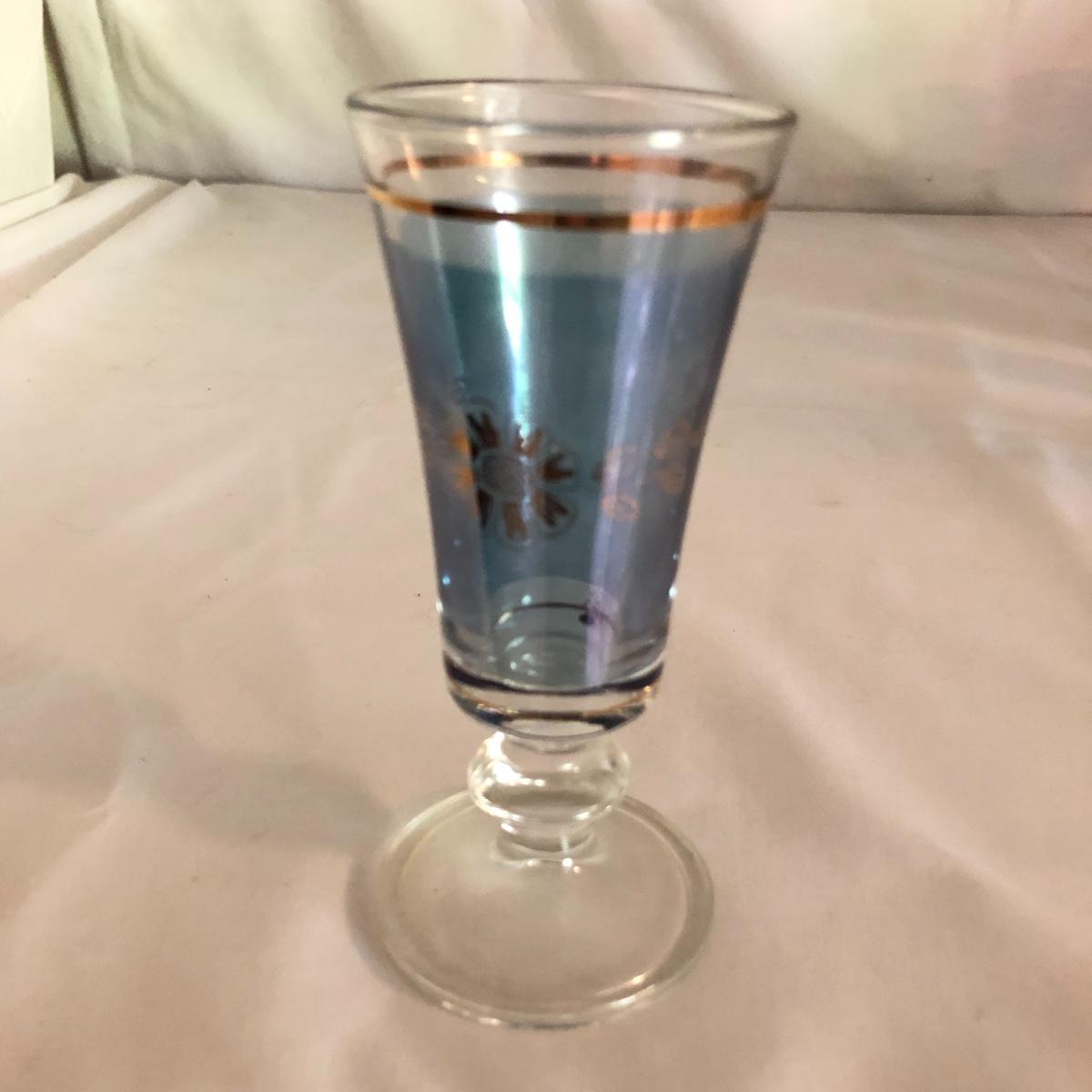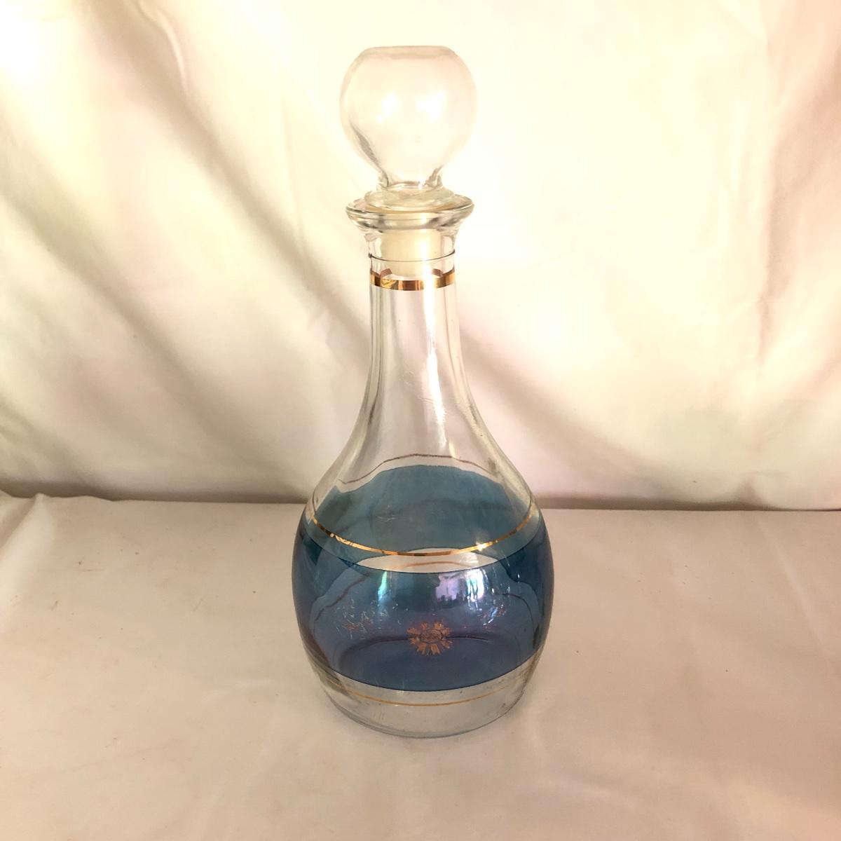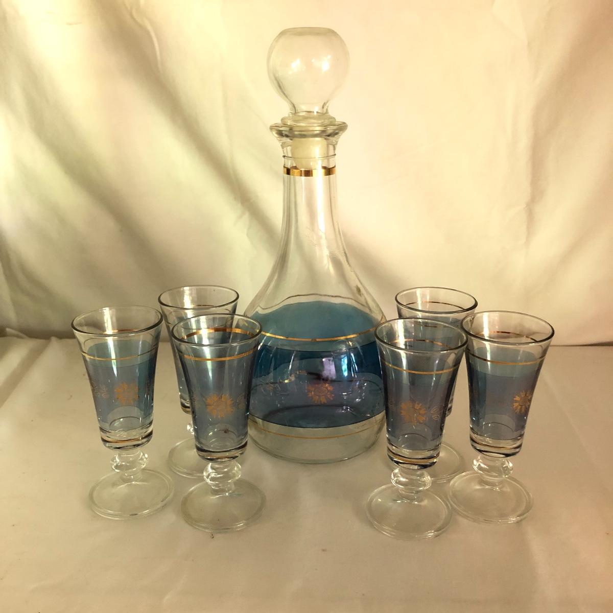 This attractive vintage decanter is clear and blue glass with gold accents. It comes with 6 matching cordial glasses. Decanter has a blemish shown in images.