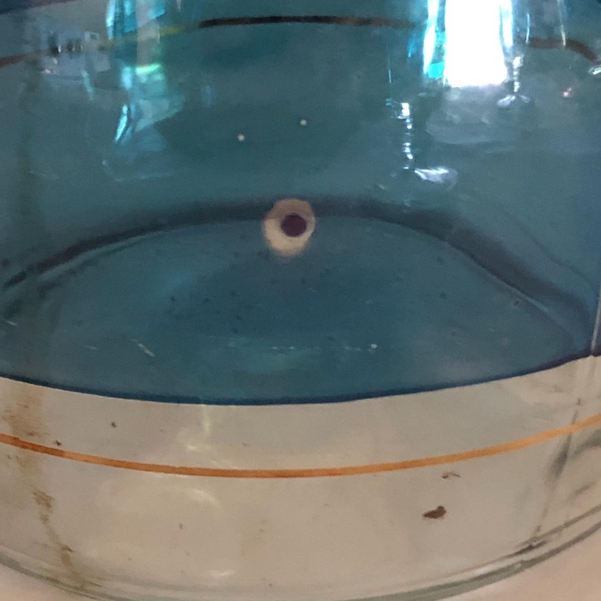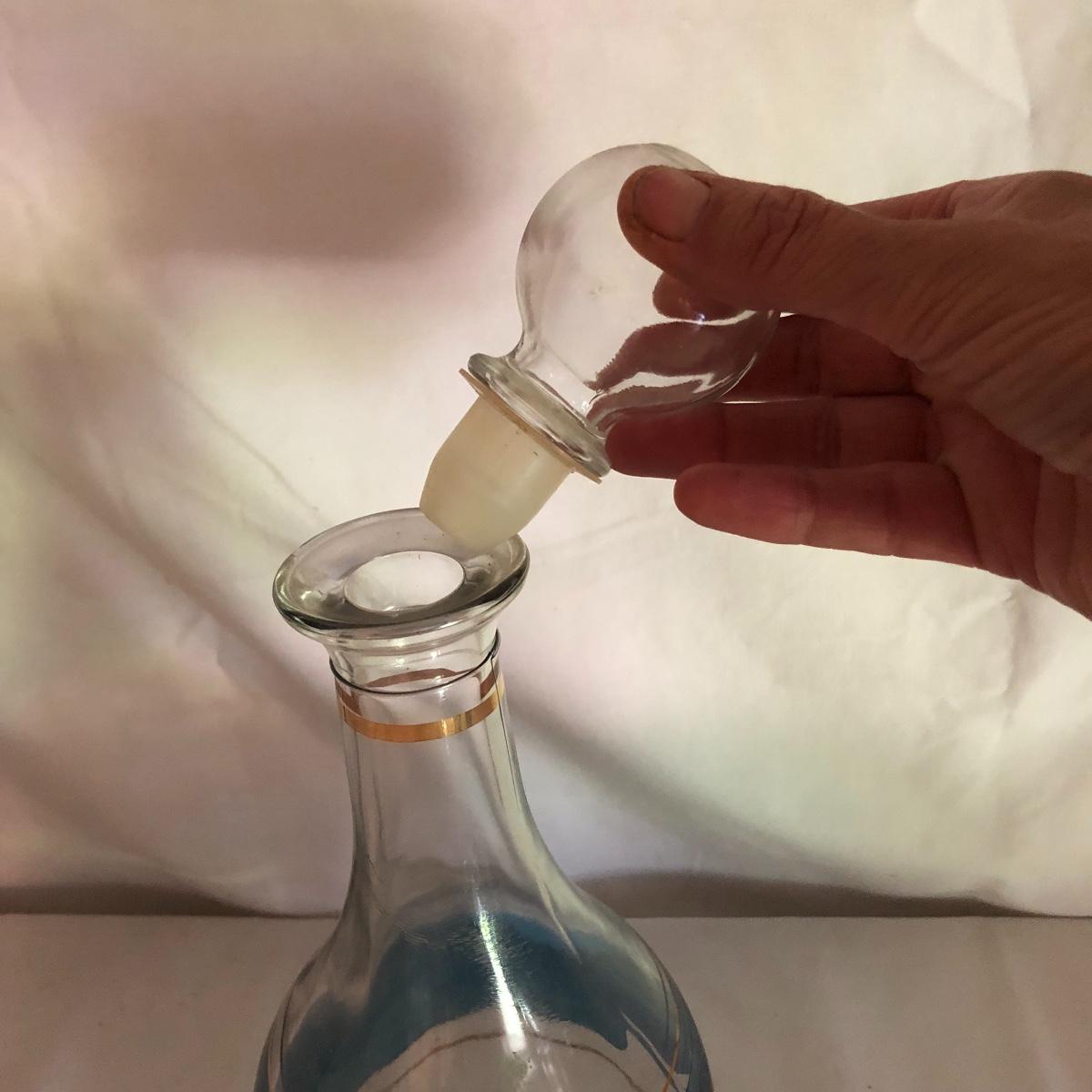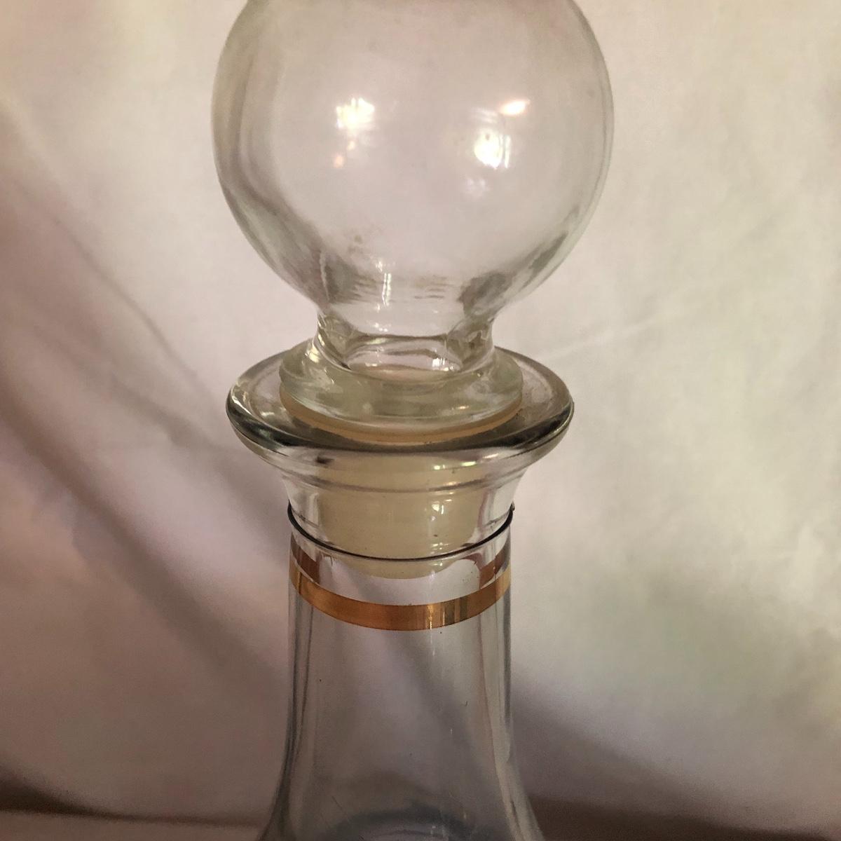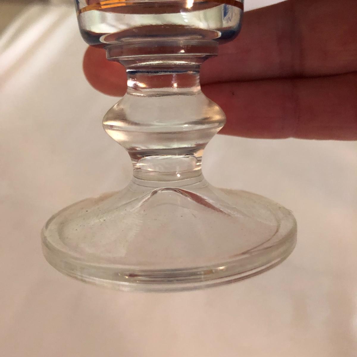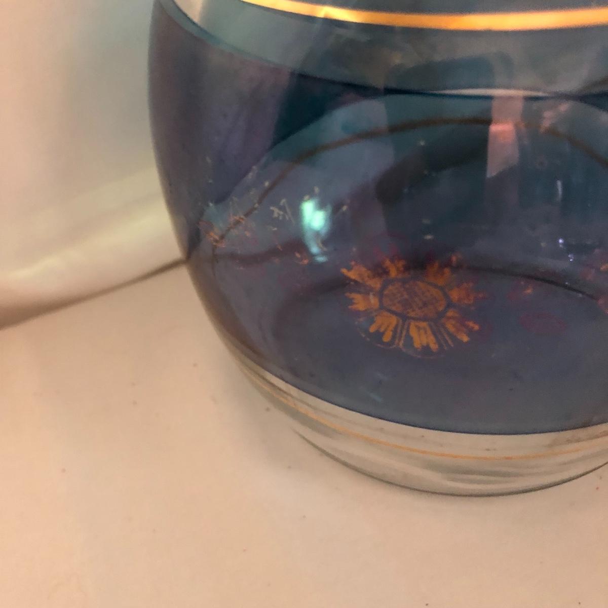 This attractive vintage decanter is clear and blue glass with gold accents. It comes with 6 matching cordial glasses. Decanter has a blemish shown in images.