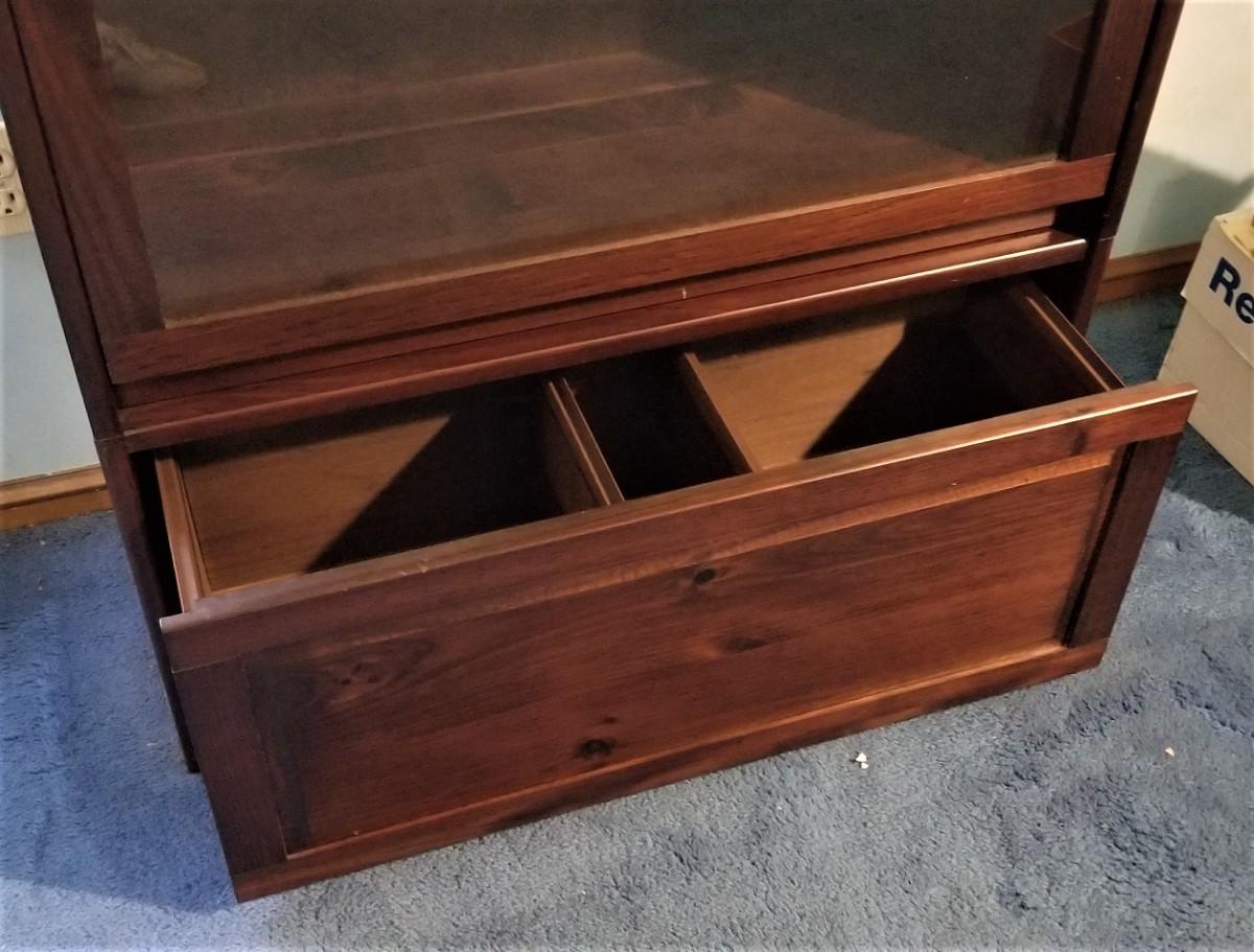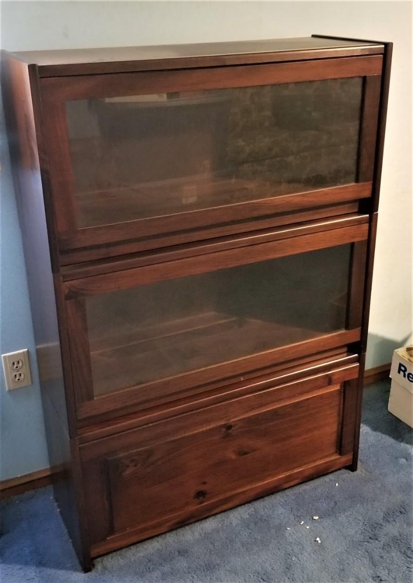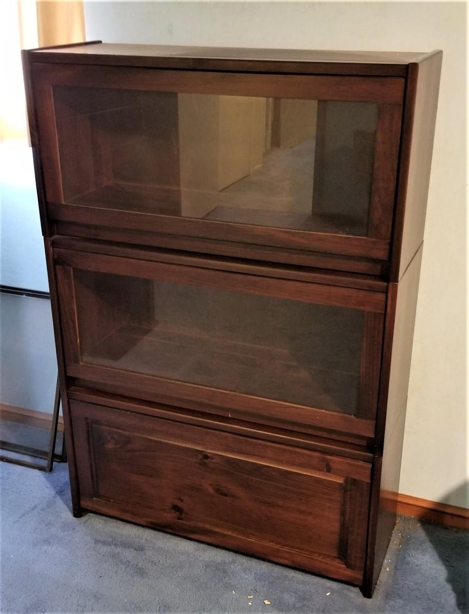 Contemporary Barrister Style Bookcase - 3 sections - bottom made to hold files. 33.5" across, 12" deep, 49" tall. Good used condition.