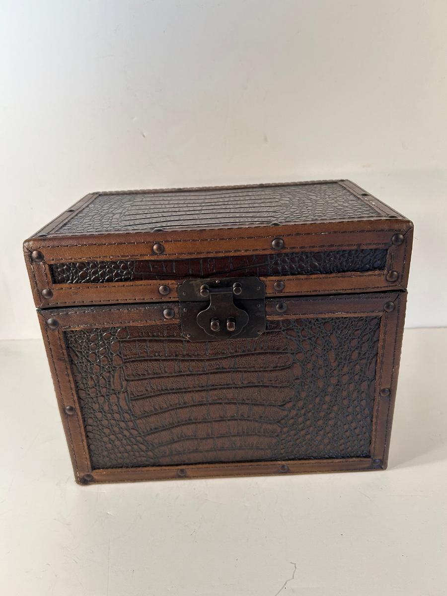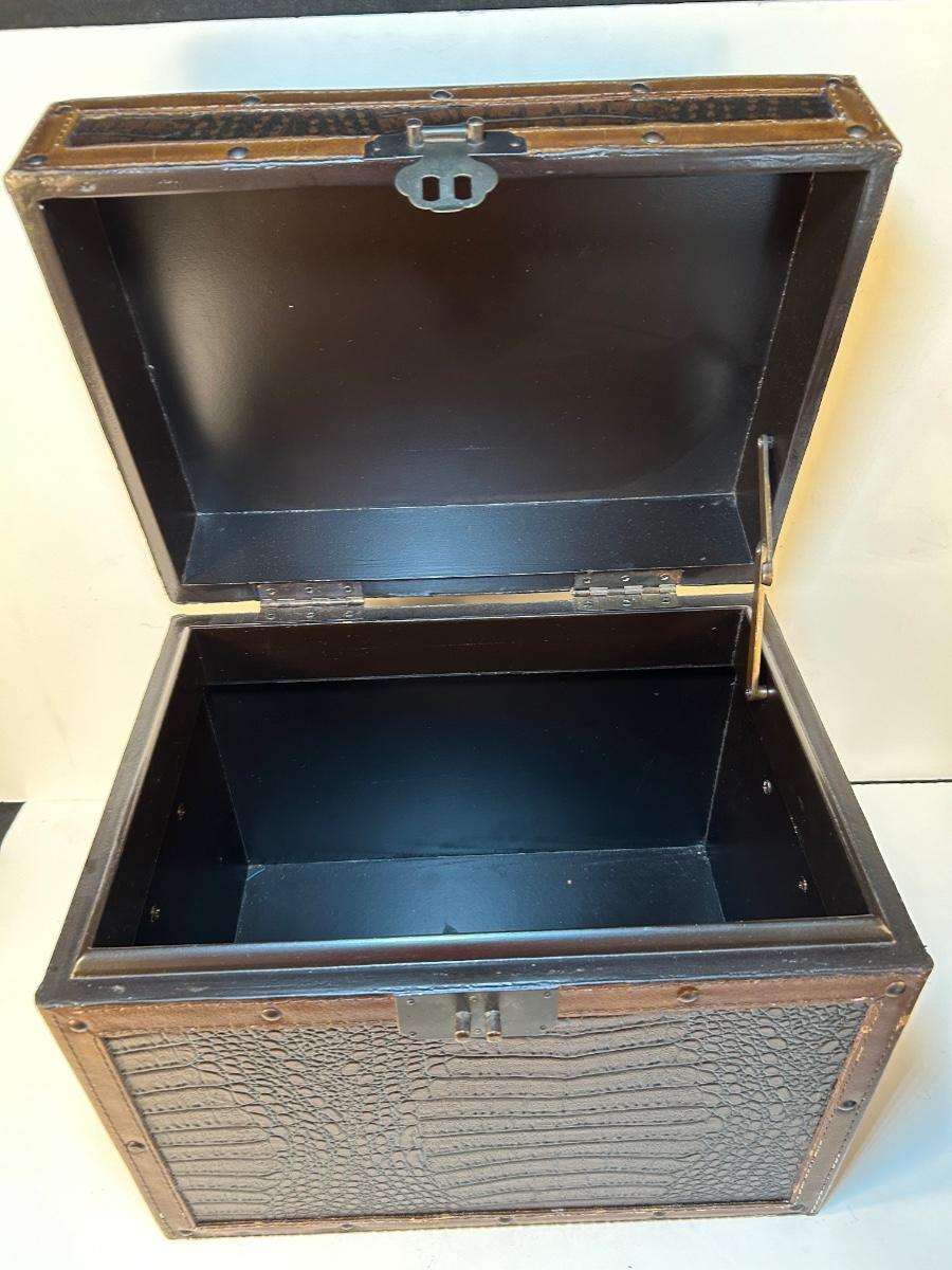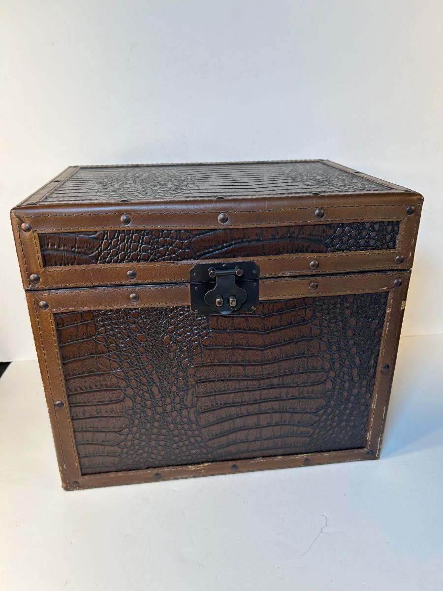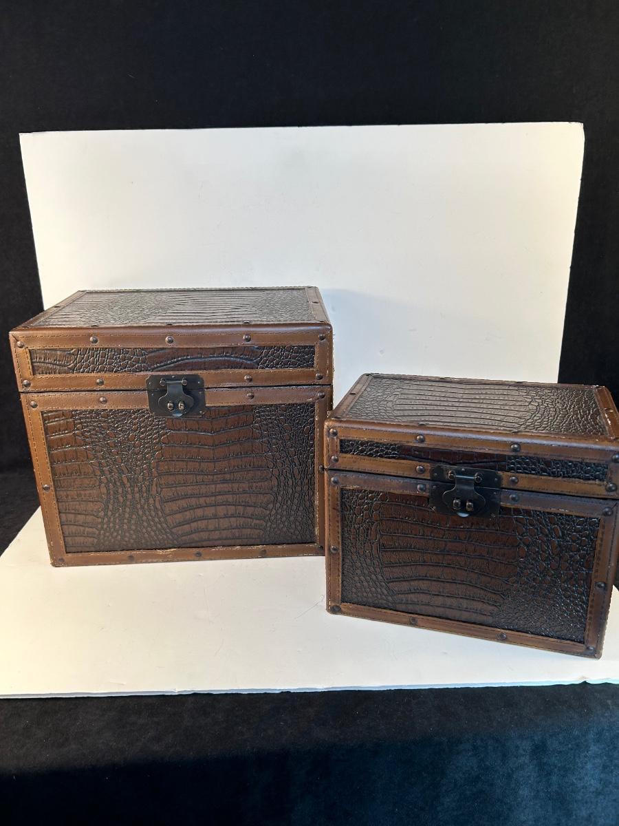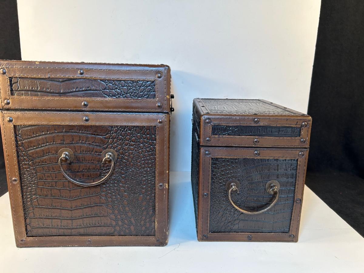 Wood leather looking boxes with attached lid. 14 1/4"W x 12"H x 9"D & 11 1/4"W x 9 1/4"H x 6 3/4"D