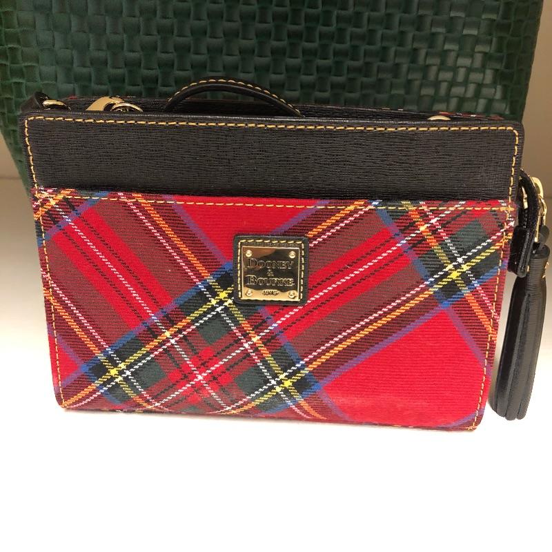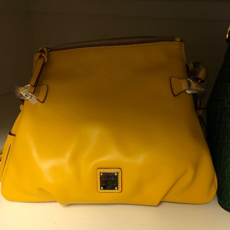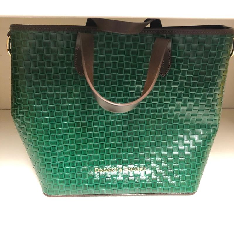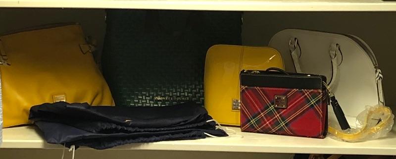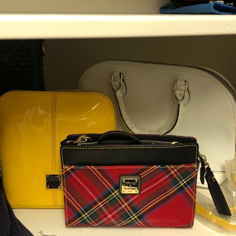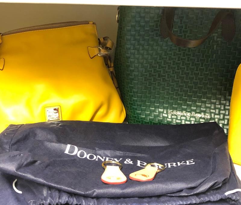 Five Dooney and Bourne purses, Two dark blue Dooney and Bourke storage bags and 2 D&B key chains. Cannot verify authenticity. All are is great condition.