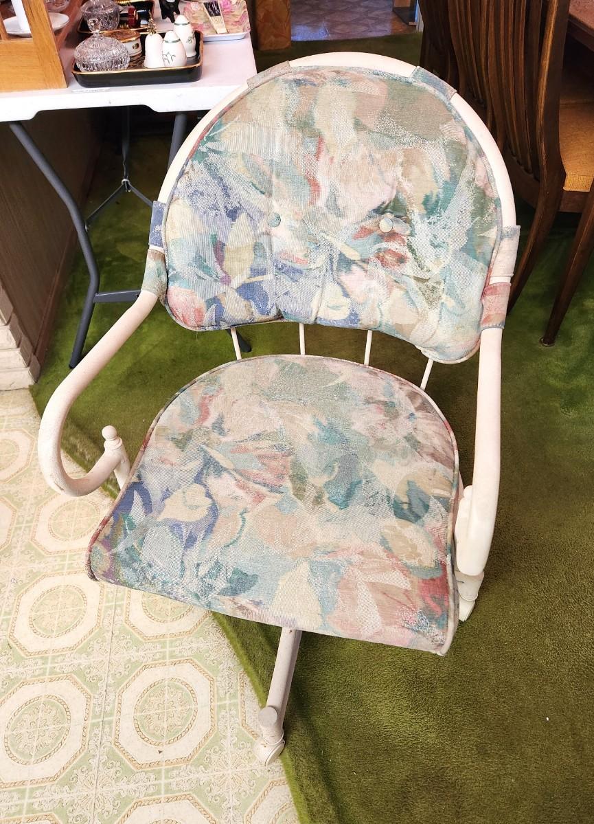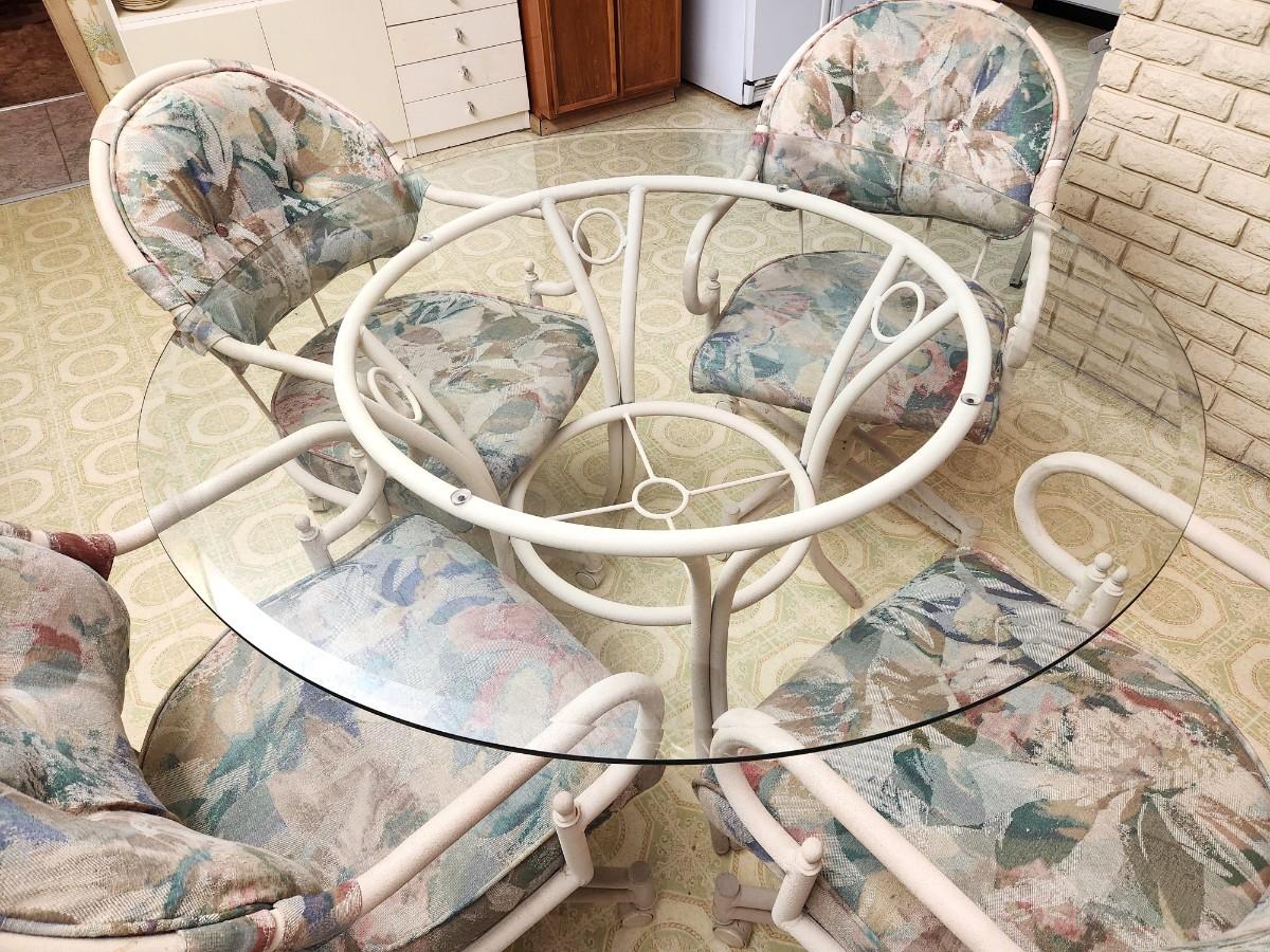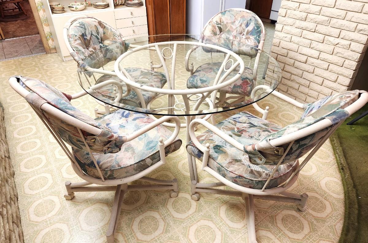 Classic 70's 4 person dining set - good for covered patio as well. Beveled glass table, 4 chairs. Table is 4 feet across. Chairs are 36" tall at the back. Chairs are on coasters. Good condition.