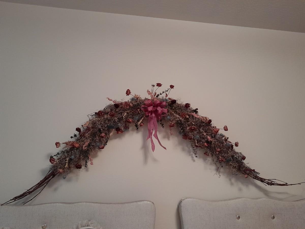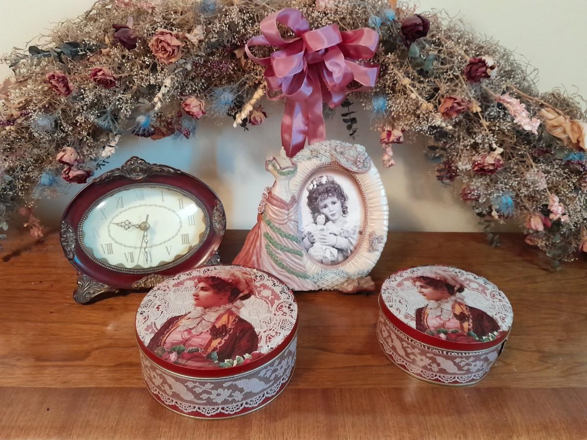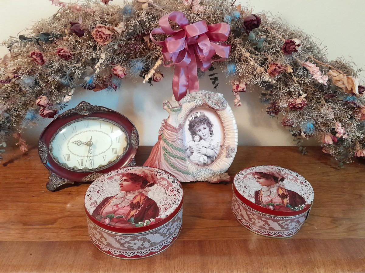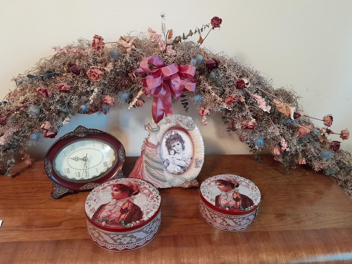 DRIED FLORAL DECORATION AND VICTORIAN STYLE DECORATIONS WITH NEAT CLOCK