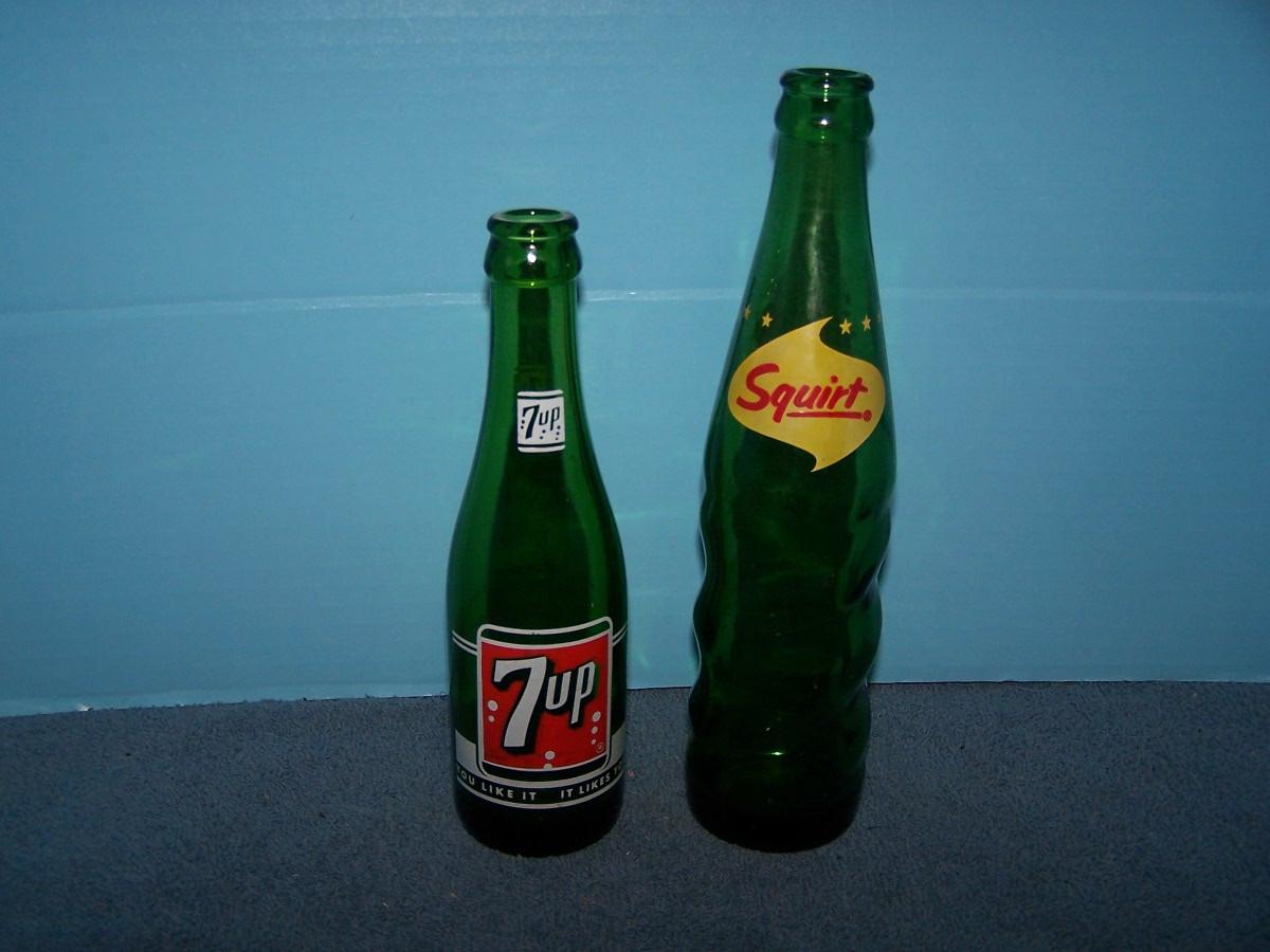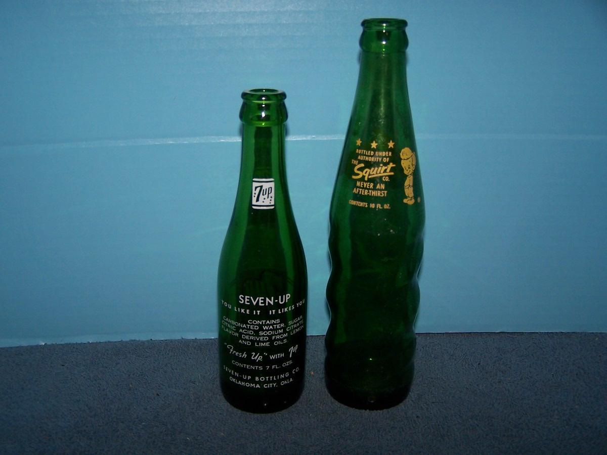 THESE ARE GREAT VINTAGE GREEN GLASS SODA POP BOTTLES, SQUIRT & 7 UP!!! 7UP-7OZ, SQUIRT- 10 OZ.. LIGHT WEAR...