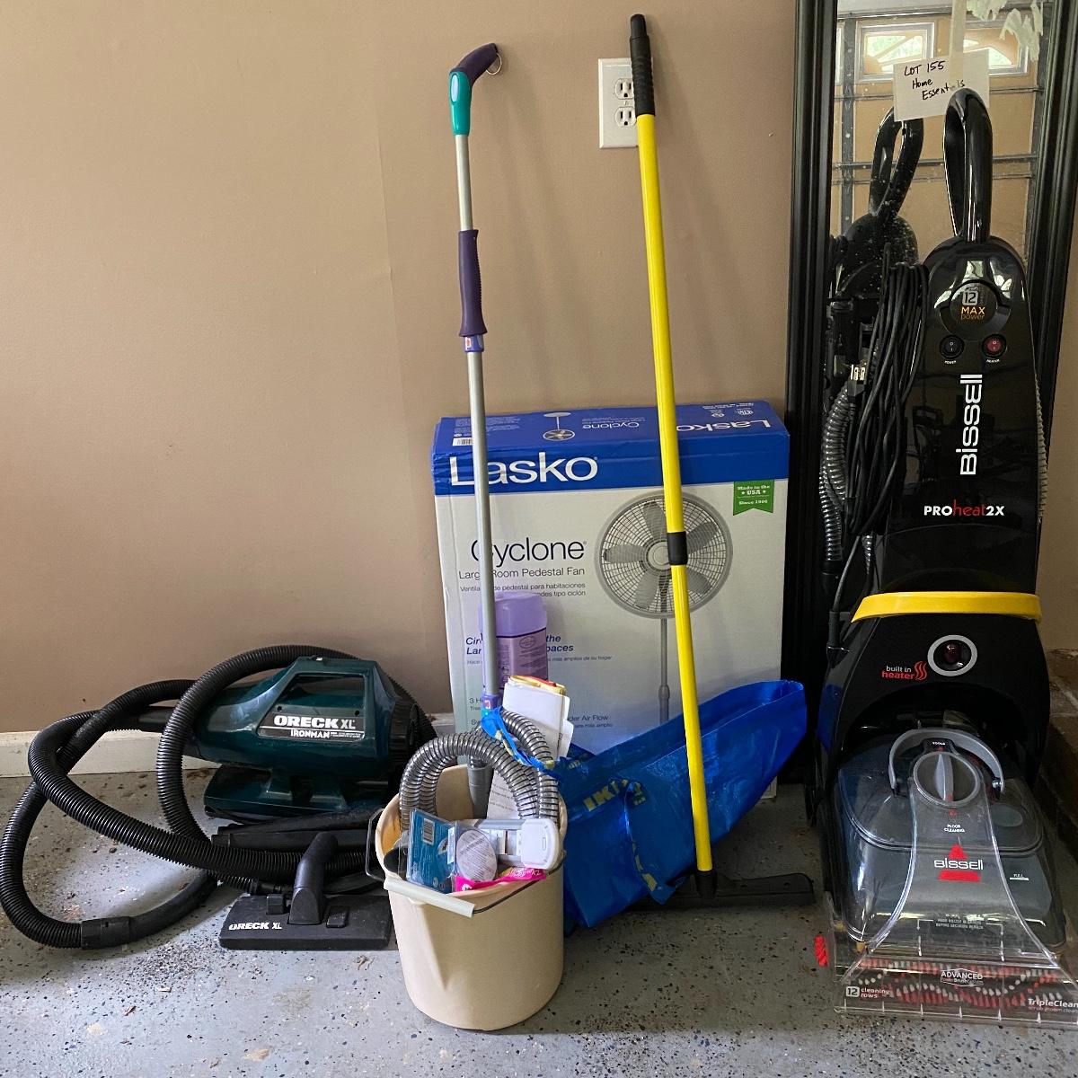 A good selection of home essentials for the college student or AirBnb. Lot includes Bissell Pro Heat2x carpet cleaner, Oreck XL Ironman Vacuum, Lasko 18” pedestal fan that was only opened for pictures. Also includes flashlight, Swiffer, rubber broom and more. Vacuum, carpet cleaner and floor cleaner all powered on when tested.