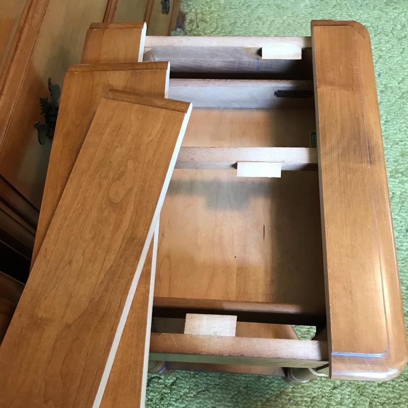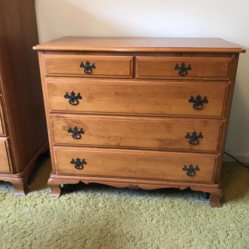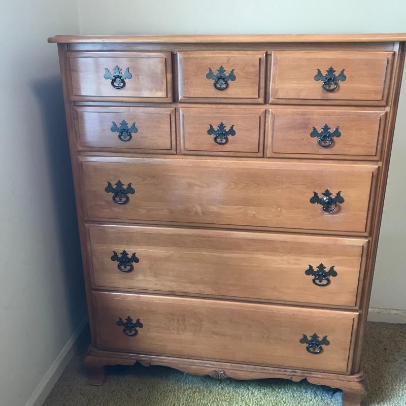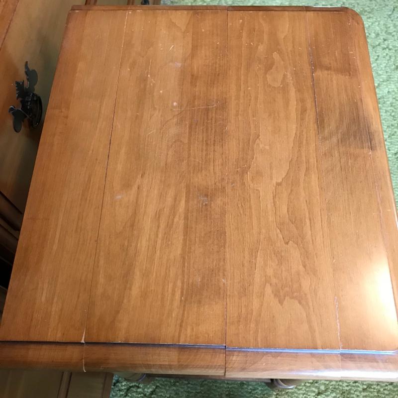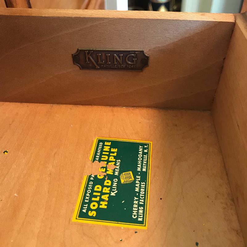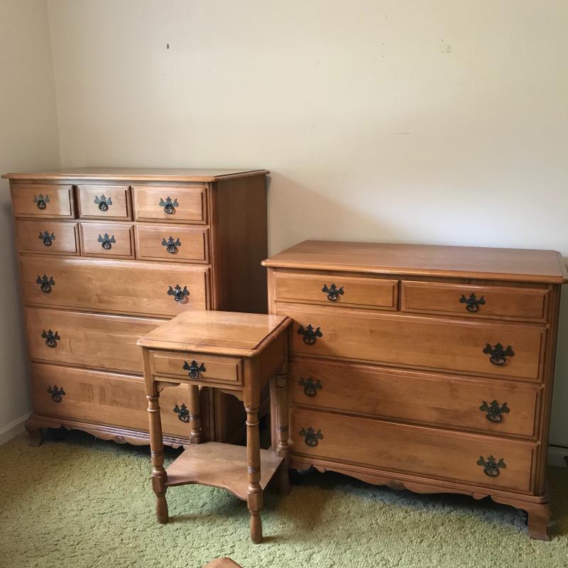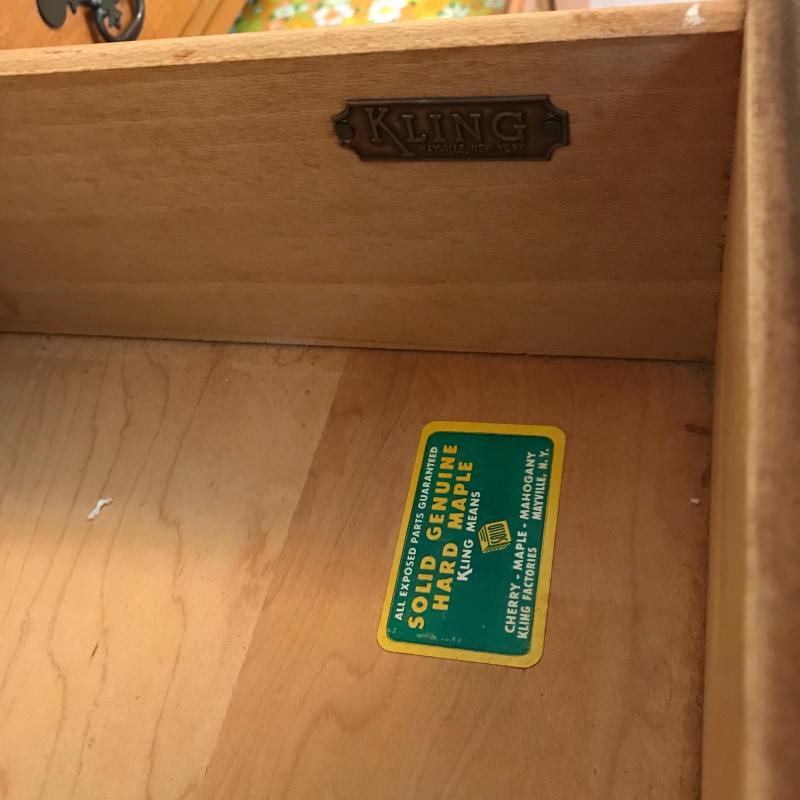 A set of Kling dressers & bedside table, crafter’s sticker states all exposed wood is solid Maple. The chest of drawers (7 drawers, measures approx. 37.5”x20.25”x47”) is in the best condition with minimal wear, while the smaller dresser (5 drawers) shows moderate wear. Both dressers have castors behind all feet. The bedside table has two top panels that have come off, but appears to be an easy fix. See photos for damage and wear. Local pick up only, please bring help to load.