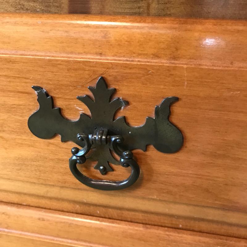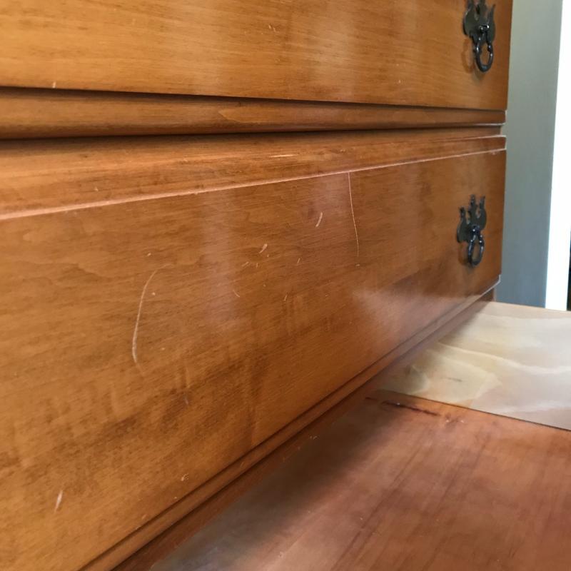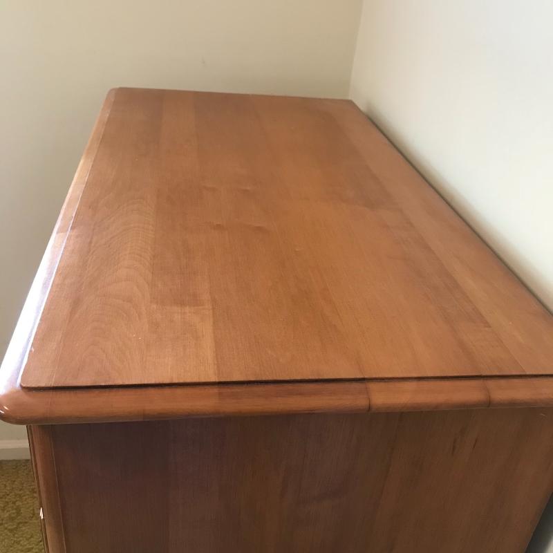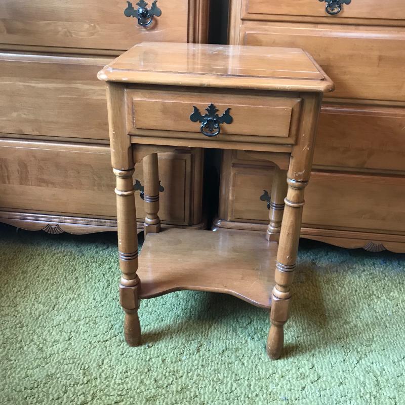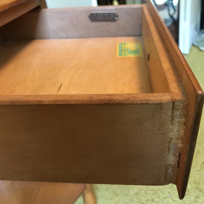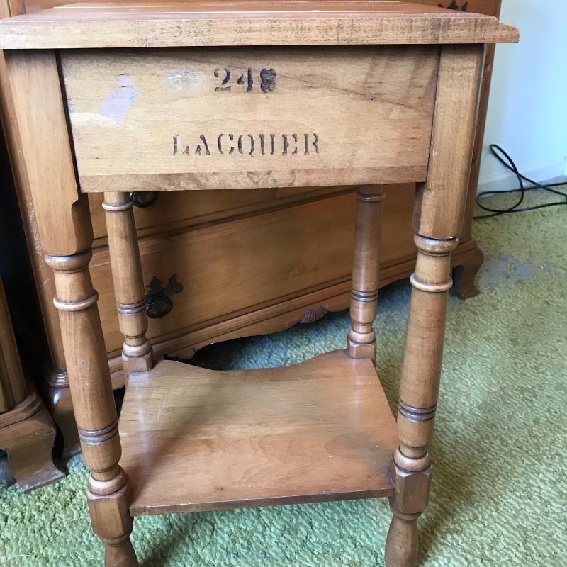 A set of Kling dressers & bedside table, crafter’s sticker states all exposed wood is solid Maple. The chest of drawers (7 drawers, measures approx. 37.5”x20.25”x47”) is in the best condition with minimal wear, while the smaller dresser (5 drawers) shows moderate wear. Both dressers have castors behind all feet. The bedside table has two top panels that have come off, but appears to be an easy fix. See photos for damage and wear. Local pick up only, please bring help to load.