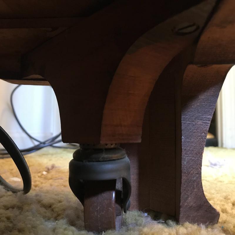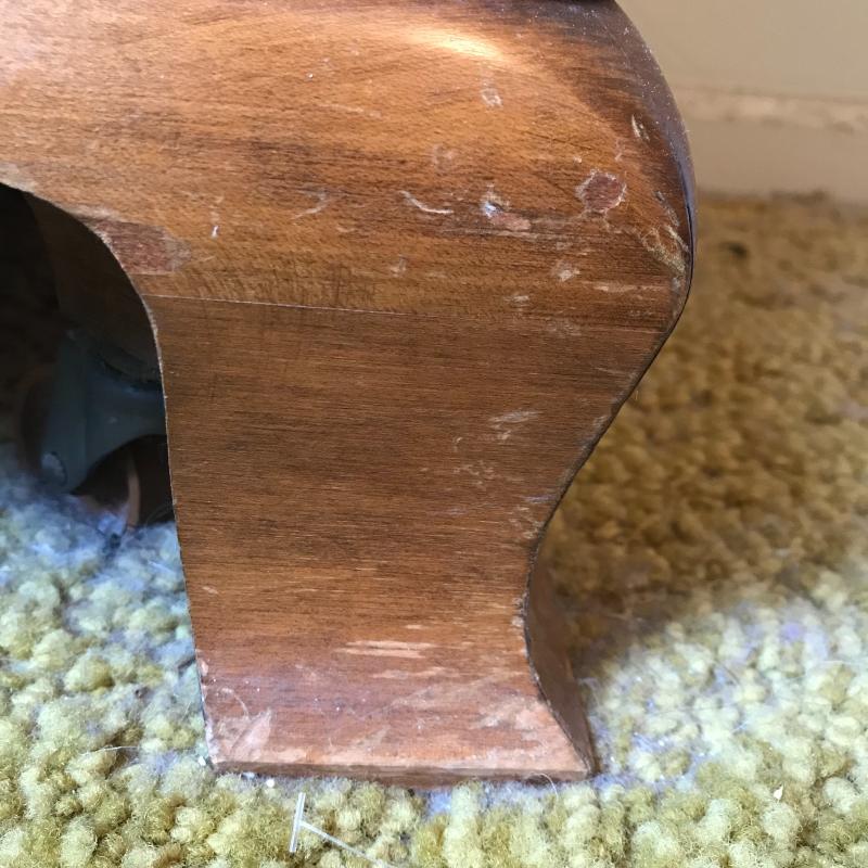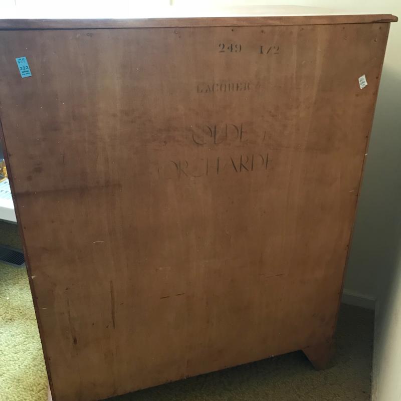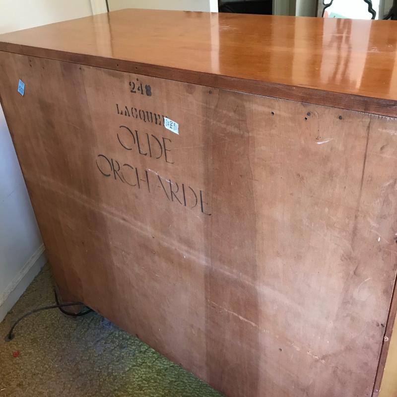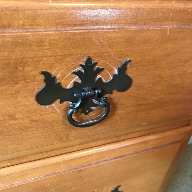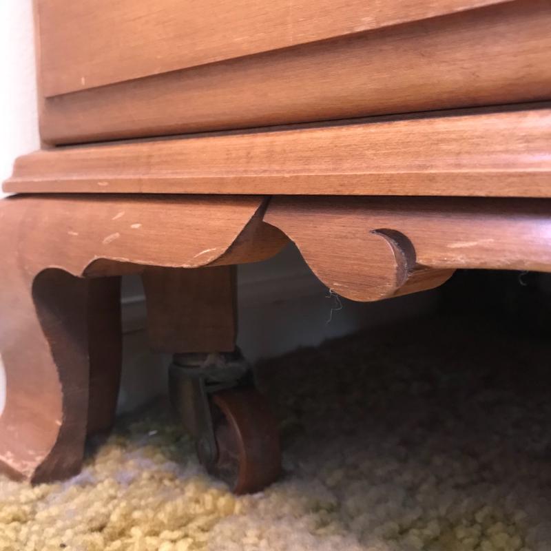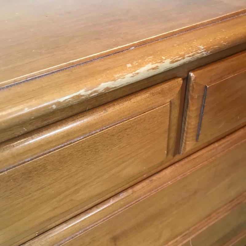 A set of Kling dressers & bedside table, crafter’s sticker states all exposed wood is solid Maple. The chest of drawers (7 drawers, measures approx. 37.5”x20.25”x47”) is in the best condition with minimal wear, while the smaller dresser (5 drawers) shows moderate wear. Both dressers have castors behind all feet. The bedside table has two top panels that have come off, but appears to be an easy fix. See photos for damage and wear. Local pick up only, please bring help to load.