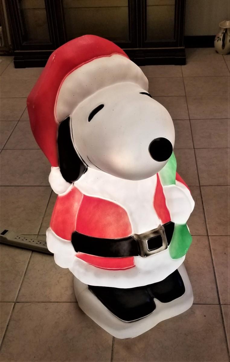 Works fine - vintage Christmas Blow Mold featuring Snoopy as Santa. about 29" tall. Slightly faded in some areas from use.