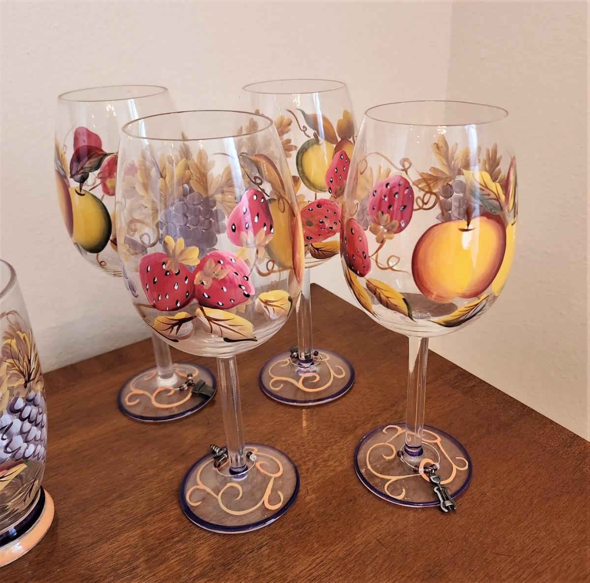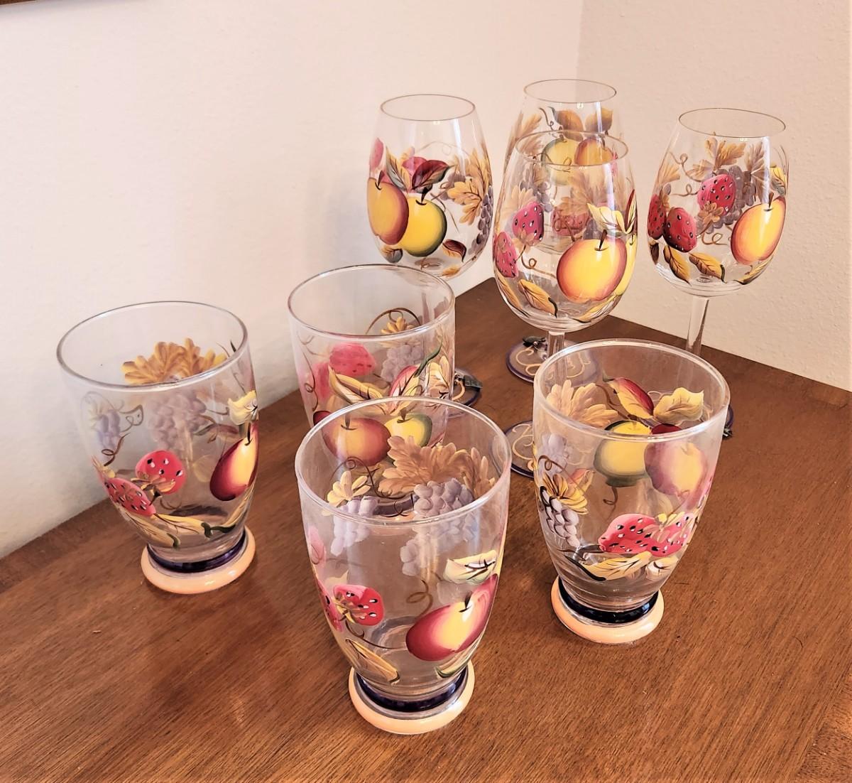 Lot of 8 hand painted crystal glasses. 4 iced tea/water glasses and 4 wine goblets. Iced teas are 6" tall, wine goblets 9" tall. Good used condition. Fruit motif.
