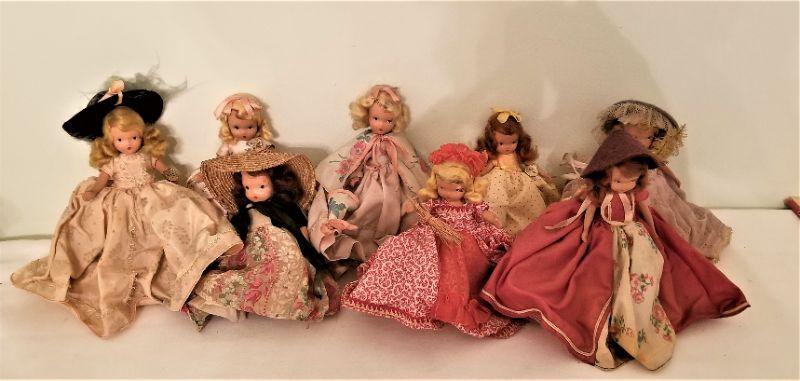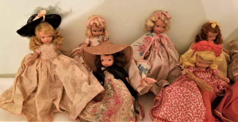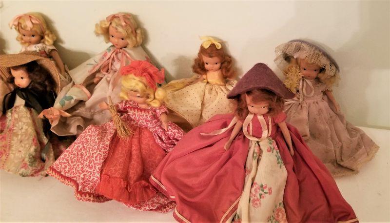 Lot of 9 Nancy Ann Storybook Dolls in original clothing - there are 8 pictured here but I found another one and threw it in, so there are a total of 9. One still has original wristband, one is missing an arm. Each stands about 6" tall. No boxes.