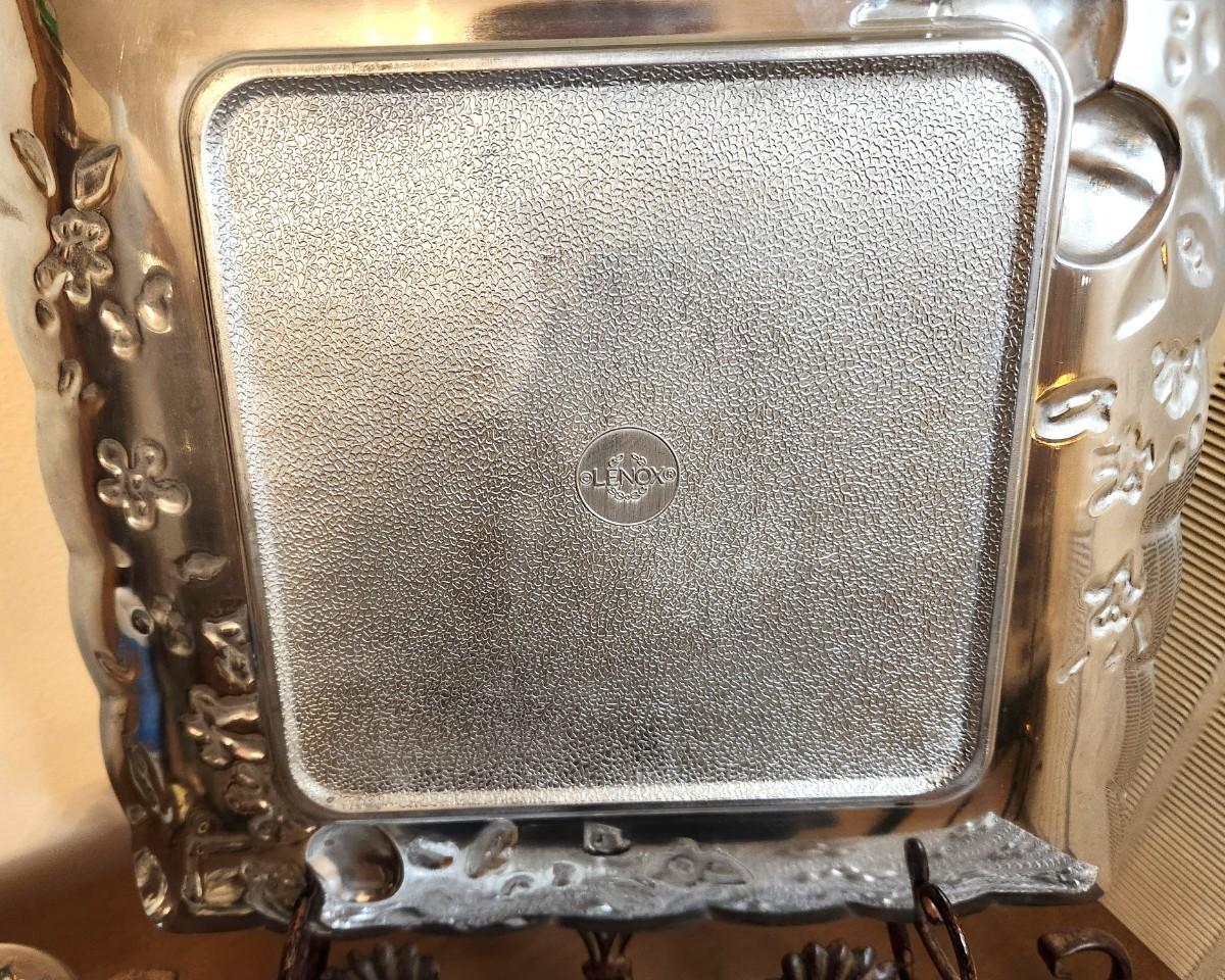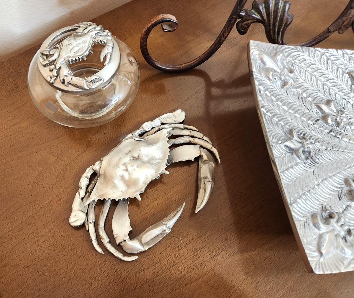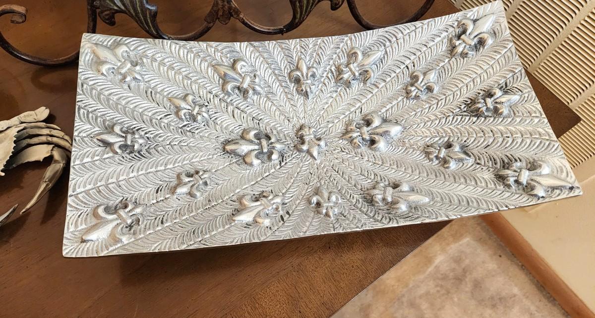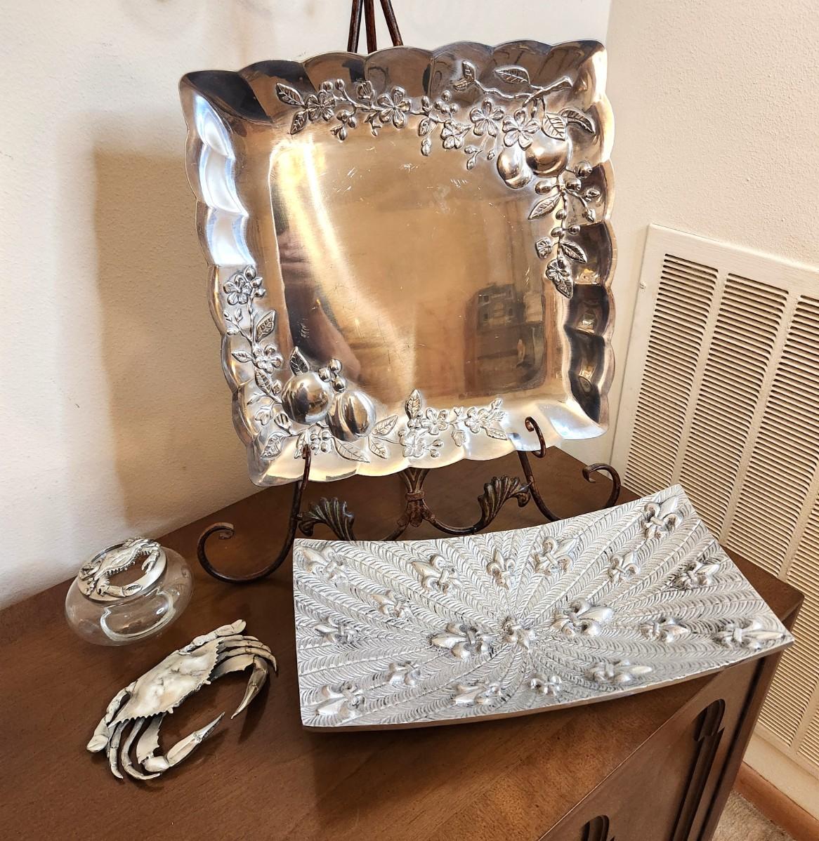 Nice Pewter lot - fleur di lis bowl 15" x 8", Lenox Pewter plate (displayed on stand - stand not included) 13.5" x 14" - small pewter crab figure and dresser jar. All in good condition.