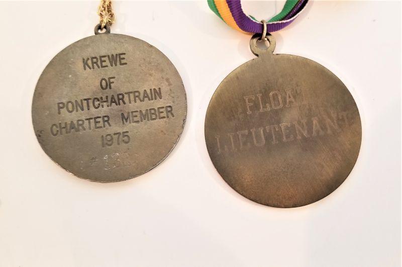 6 piece Mardi Gras lot here - two silverplate favors from Dorians (one from 1975, the other from 1970), 10 year medal from Krewe of Ponchartrain, Charter Member's Medallion (Orpheus), Float Lieutenant's Medallion (Krewe of Ponchartrain) and Charter Member Medal (member #132 - Krewe of Ponchartrain). Medallions are 2.75" across.
