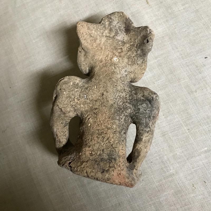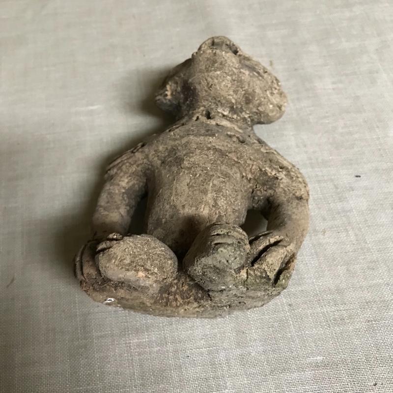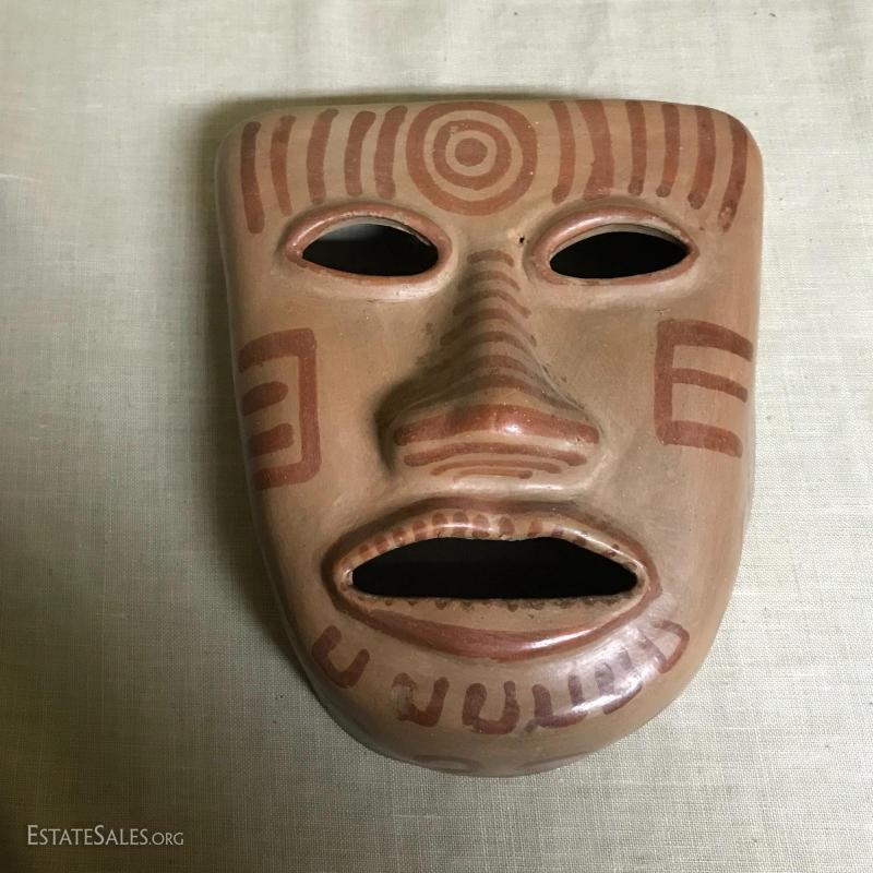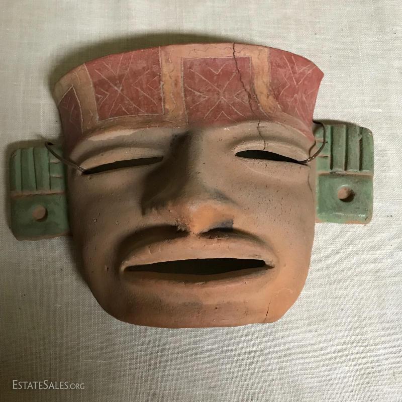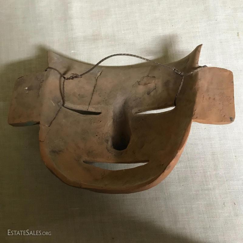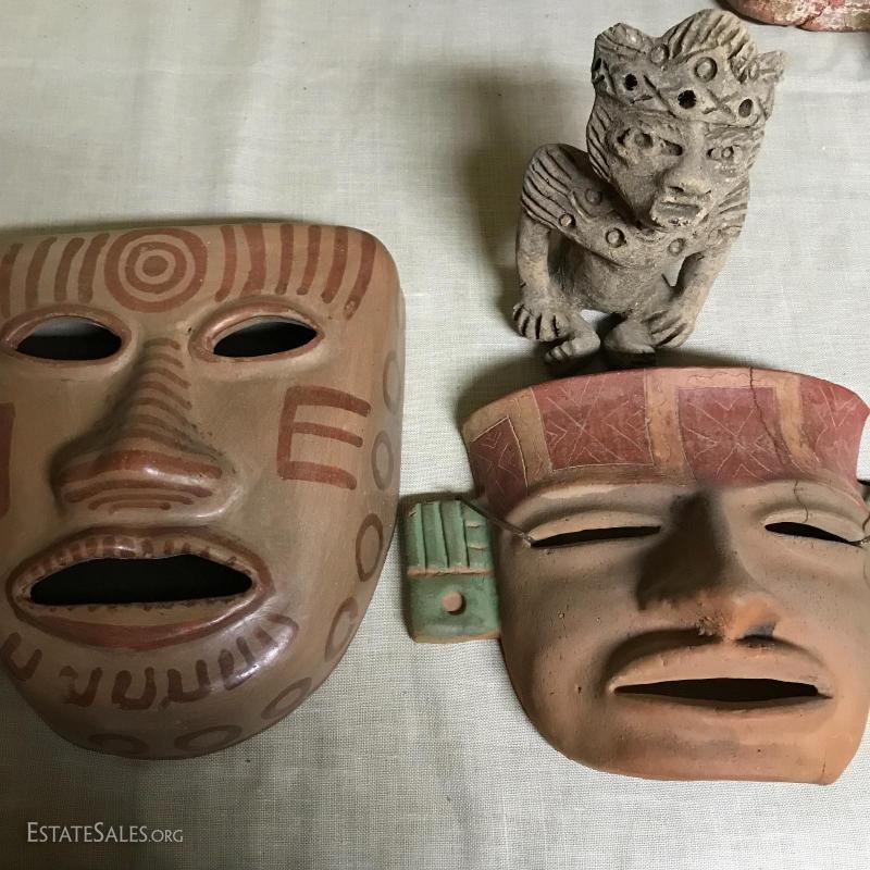 These two masks and figurine appear to be from Mexico, though we cannot verify. Large mask is 9”l x 8”w x 4”h. Smaller mal is 9”l x 7”w x 4”h and has been broken and glued back together (see pics), and figurine is approx. 7” tall.