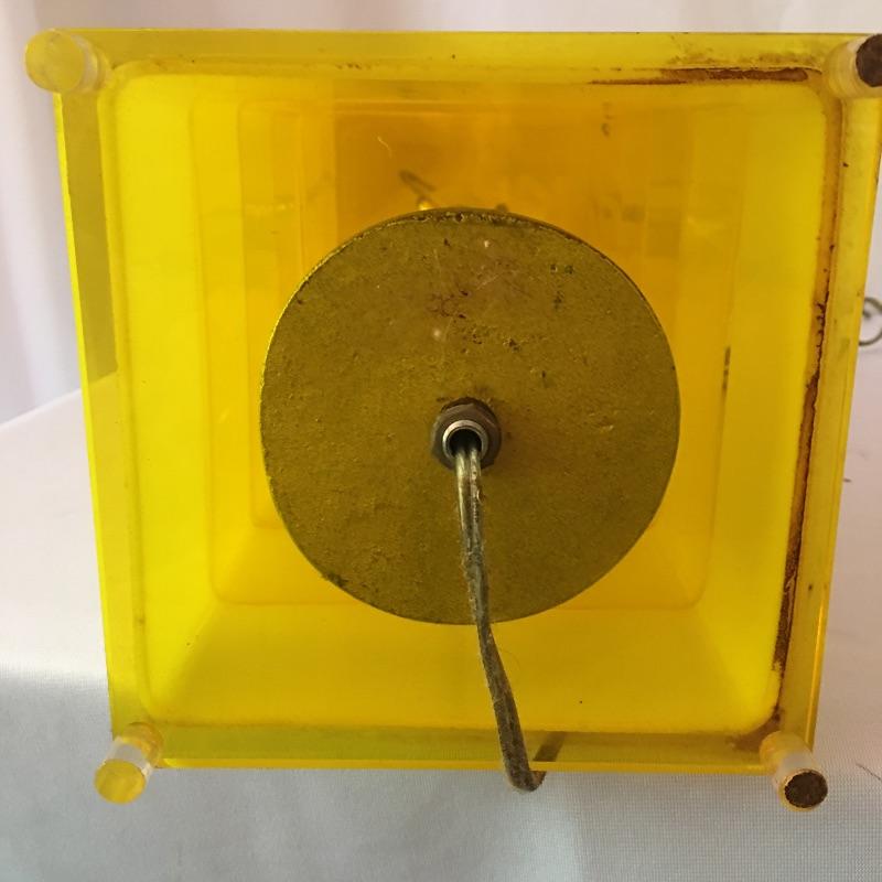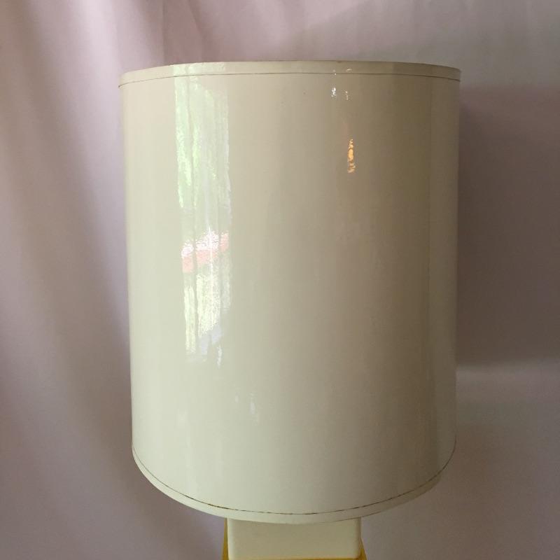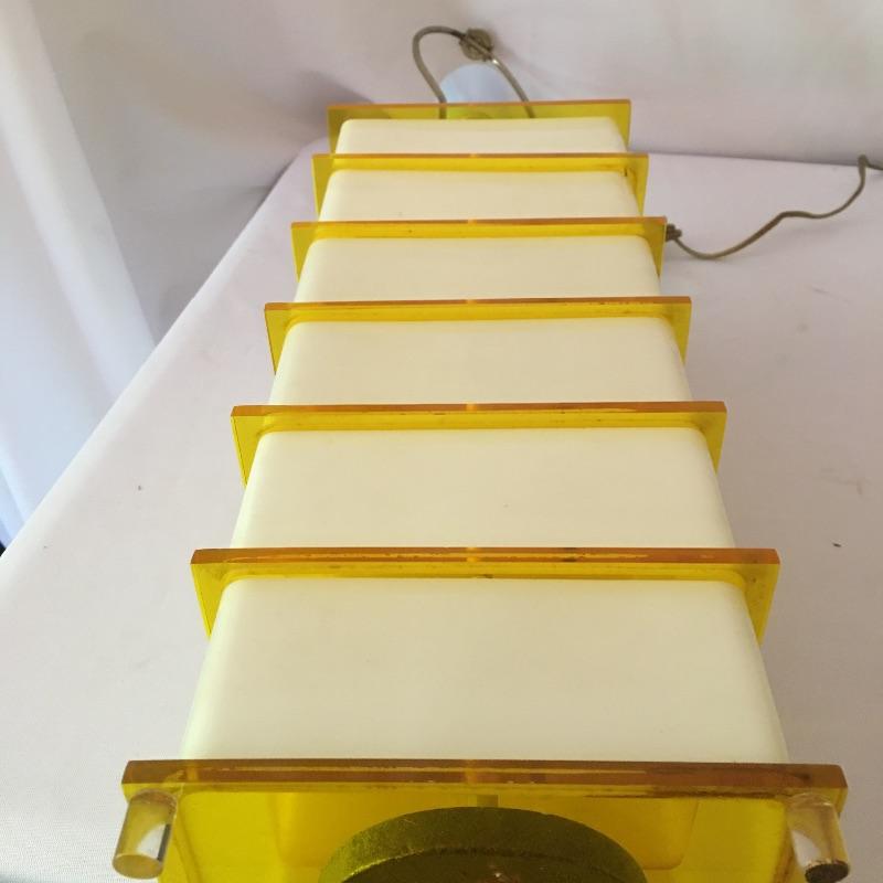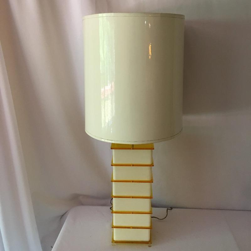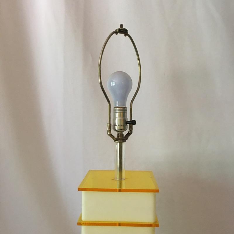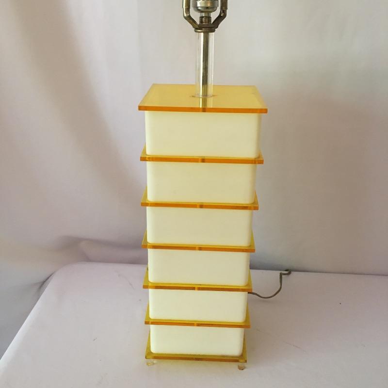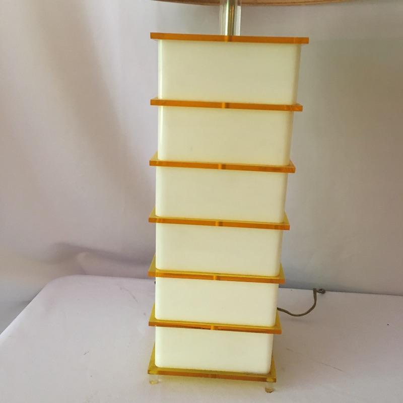 MCM acrylic table lamp. Cool retro acrylic lamp is sure to add some style and color to your decor. Yellow and white color. Lamp without shade measures 6.5” x 6.5” x 31.25”. Lamp worked when tested.