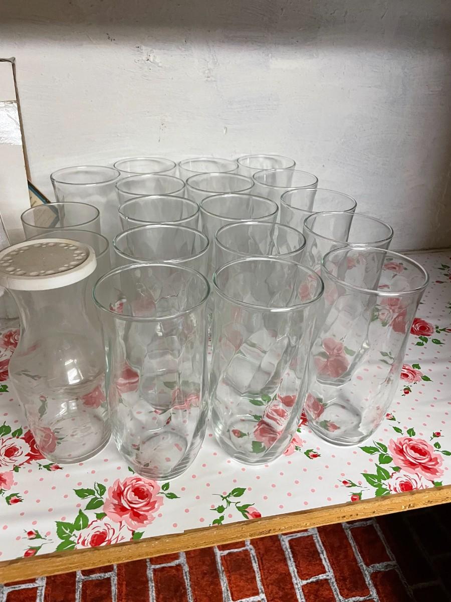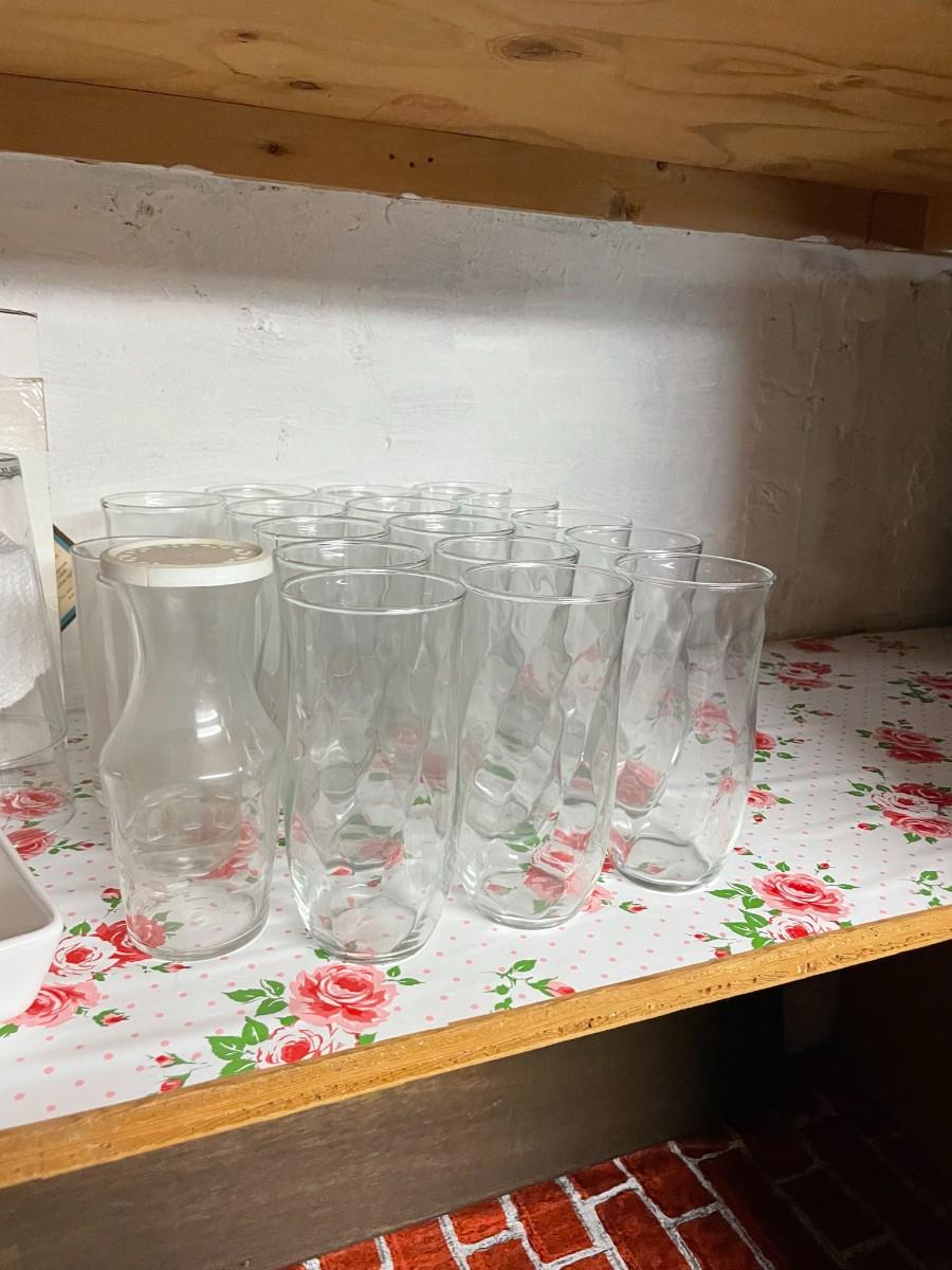misc. glasses, ceramic bird decor, pfaltzgraft USA plate, plate.