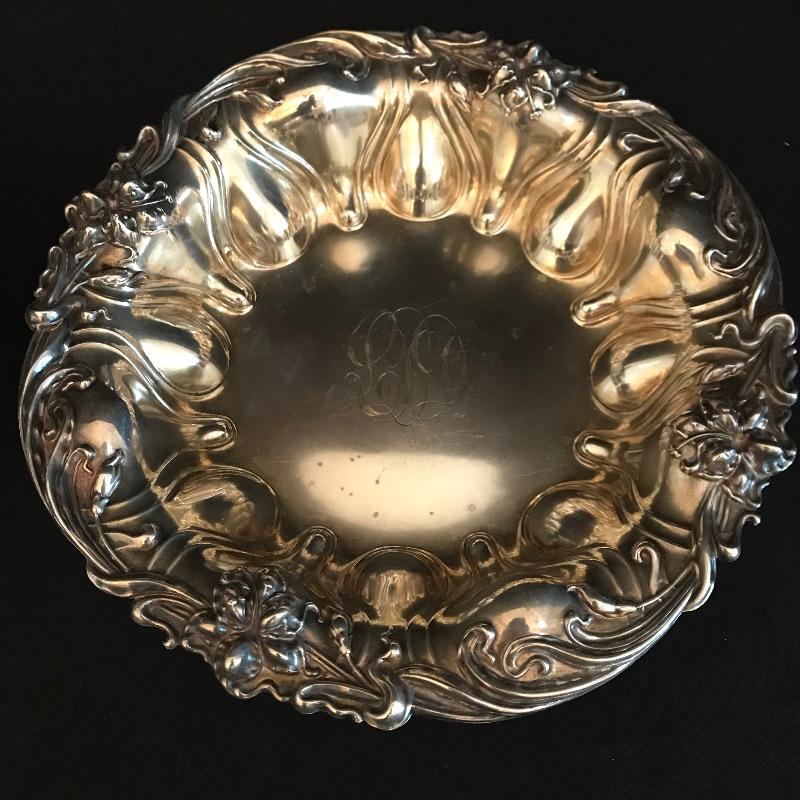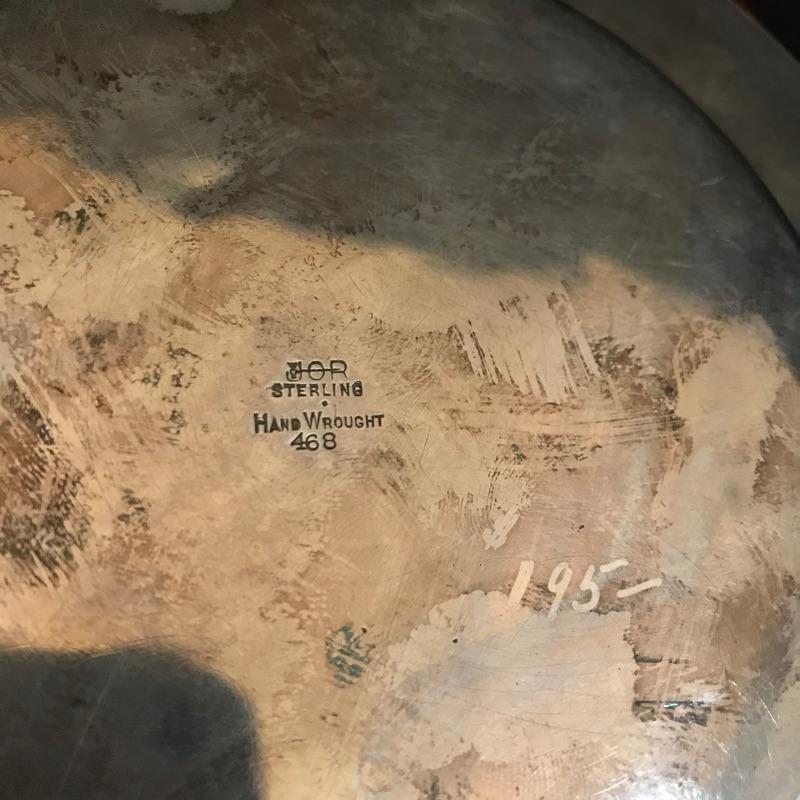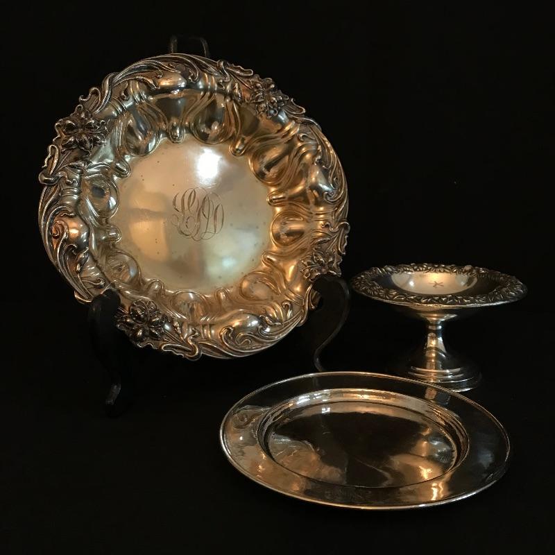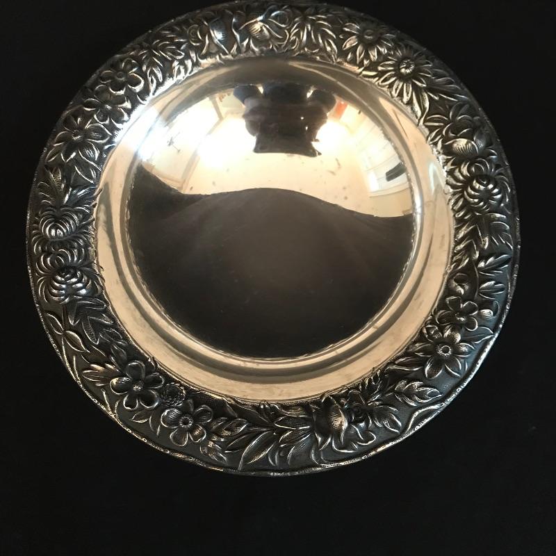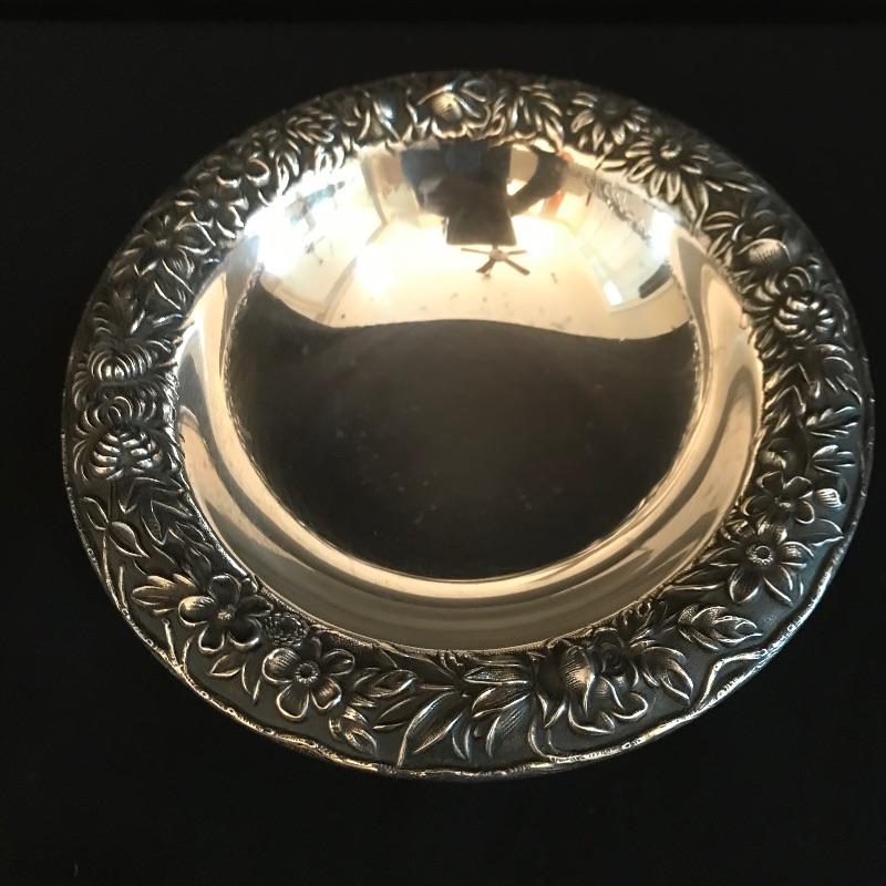 Three beautiful dishes marked sterling, each with an elegant personality. The first bowl is a large floral art Nuevo designs and measures approximately 8.5”d x 1.5”. It has letters engraved in middle. The pedestal bowl is stamped S Kirk & Son Inc and also appears to have atx etched near the sterling stamp. Lastly, a hand wrought sterling plate measuring 6.5”d with letters engraved on side. Starting bid reflects at or near melt value. Shipping available.