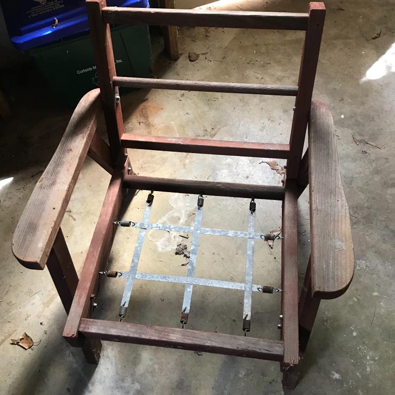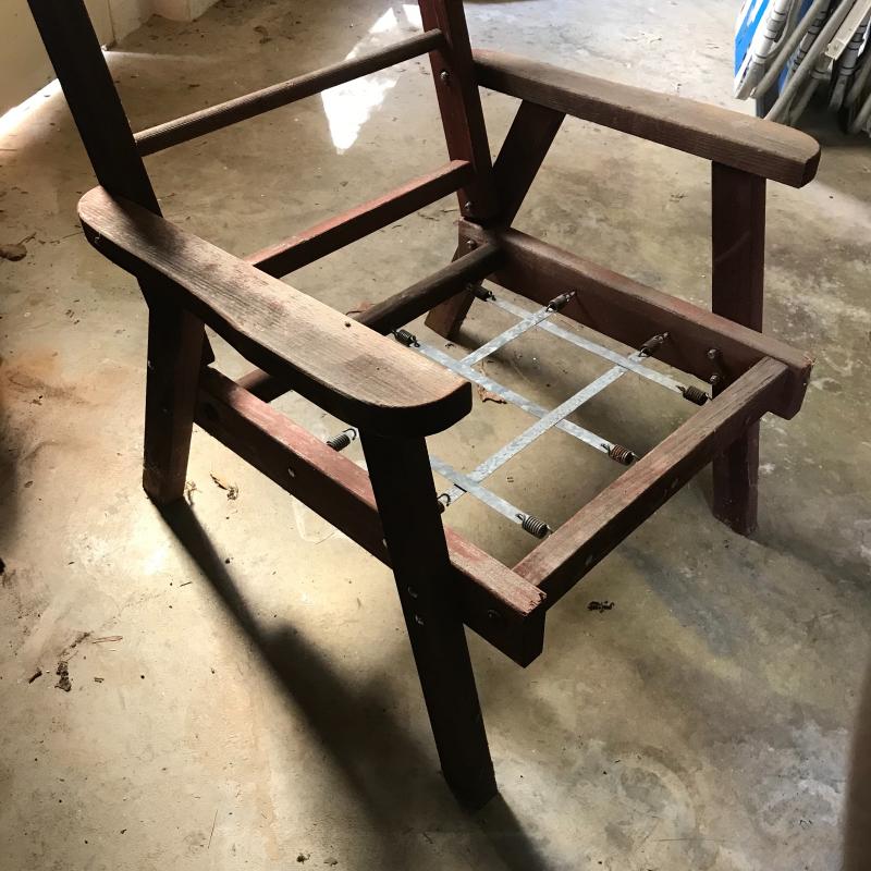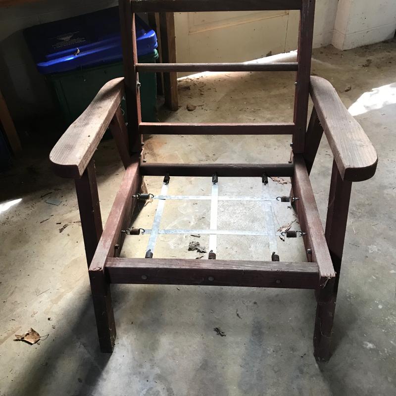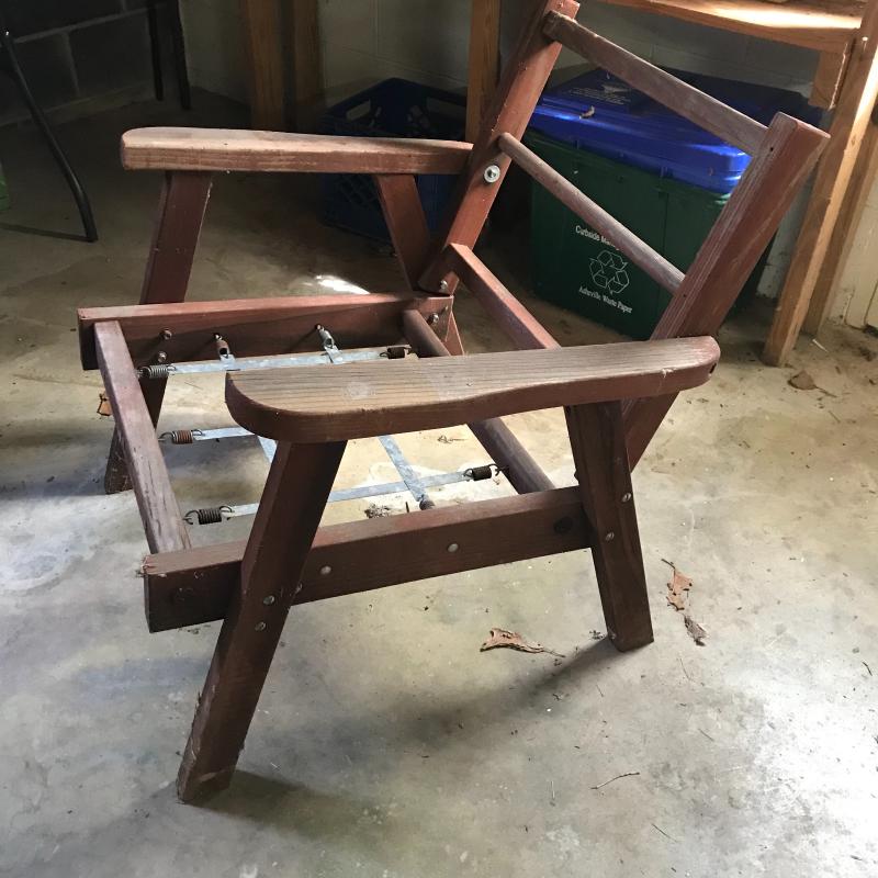 Wood with metal springs in need of cushions ready for an outdoor hangout. Chair measures 30” x28” x28.5”. Lot available for local pick up in Asheville, NC only.