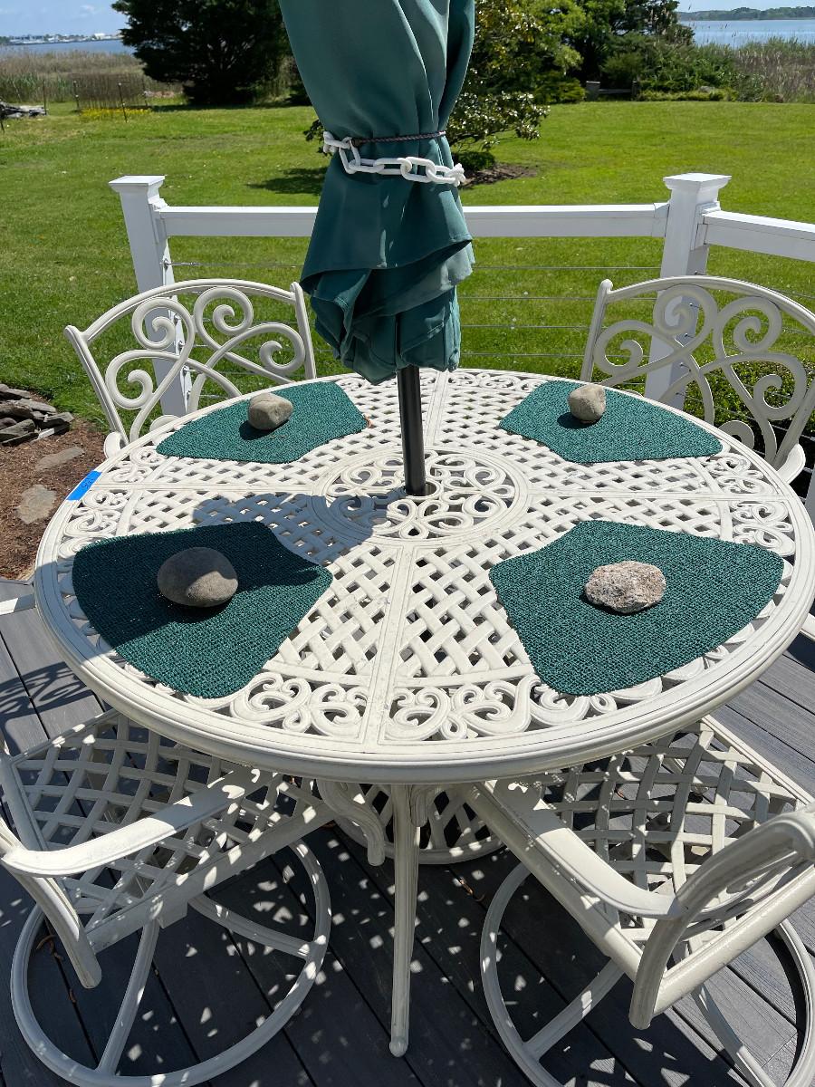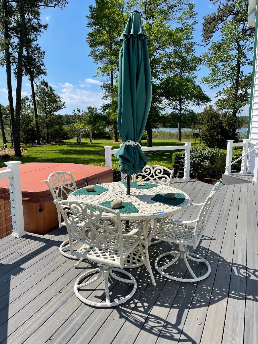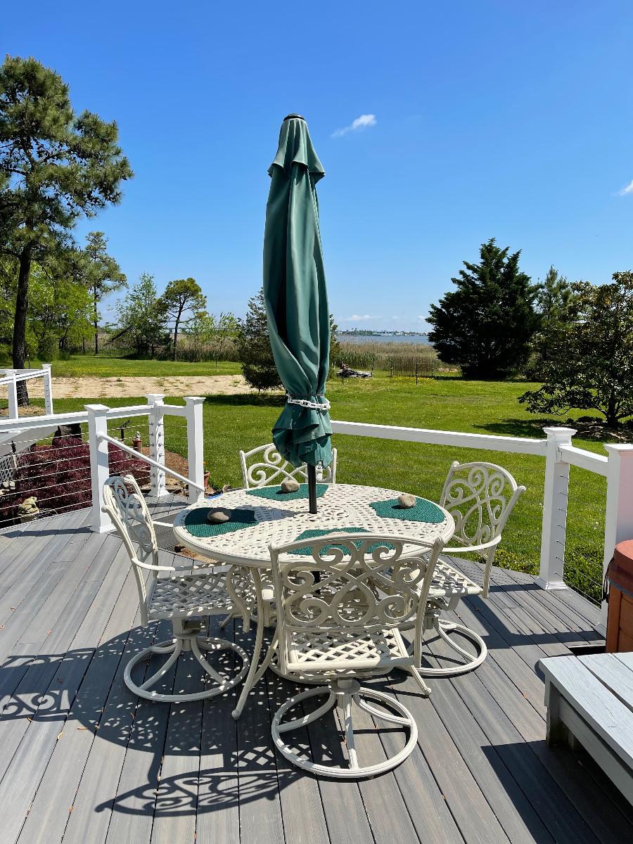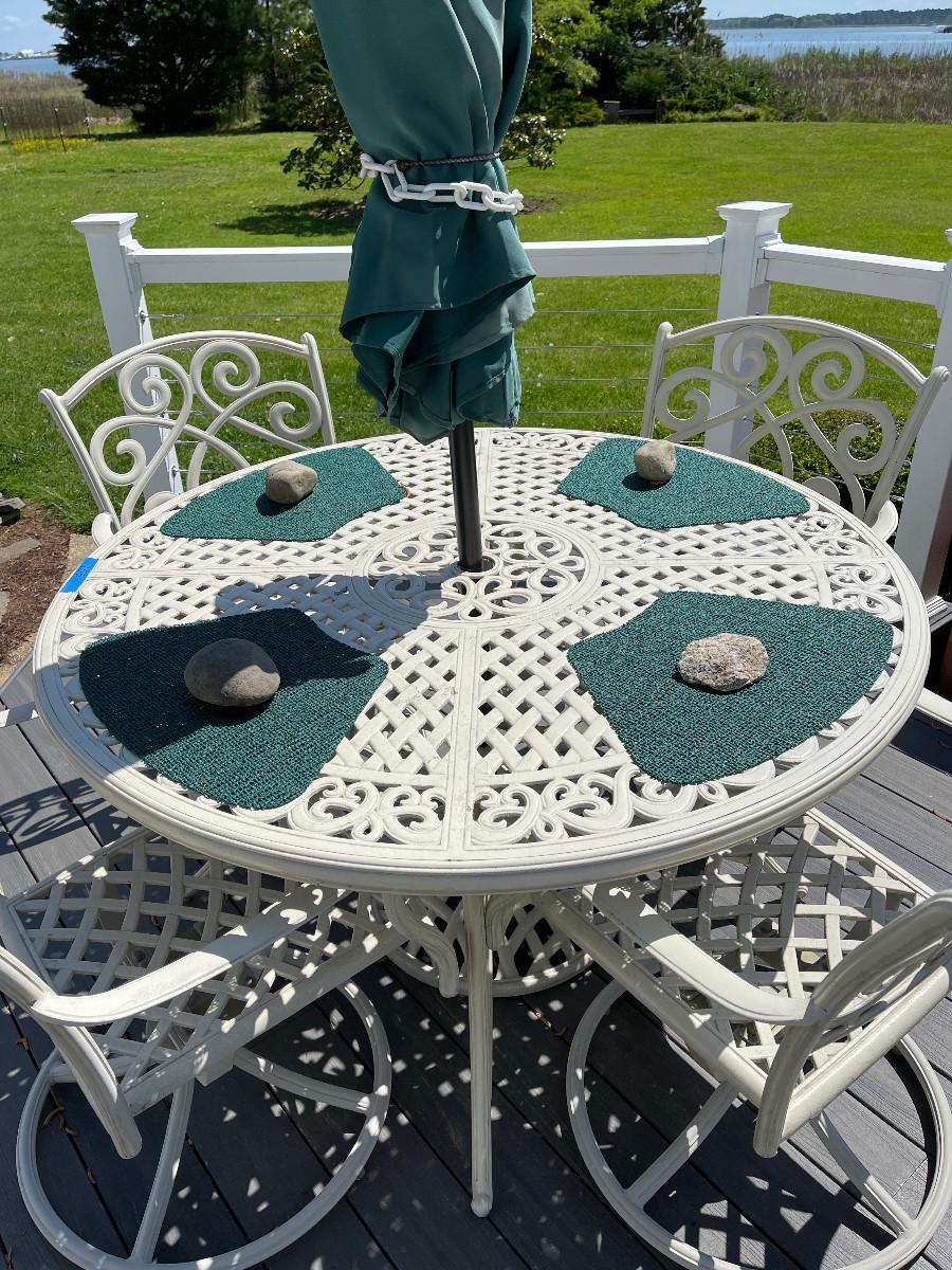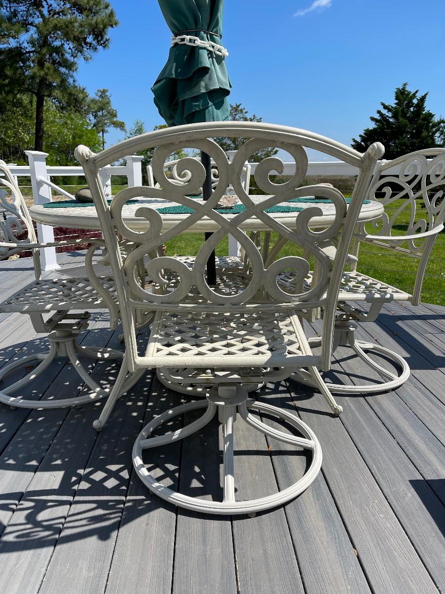 Metal Patio Set Includes 51" Diameter Table, 4 Chairs and Umbrella.