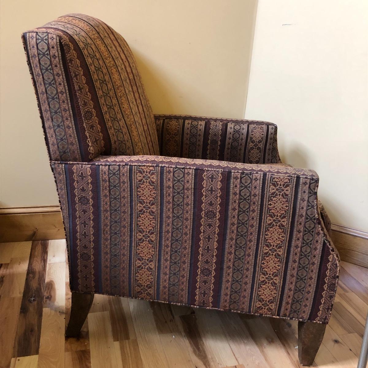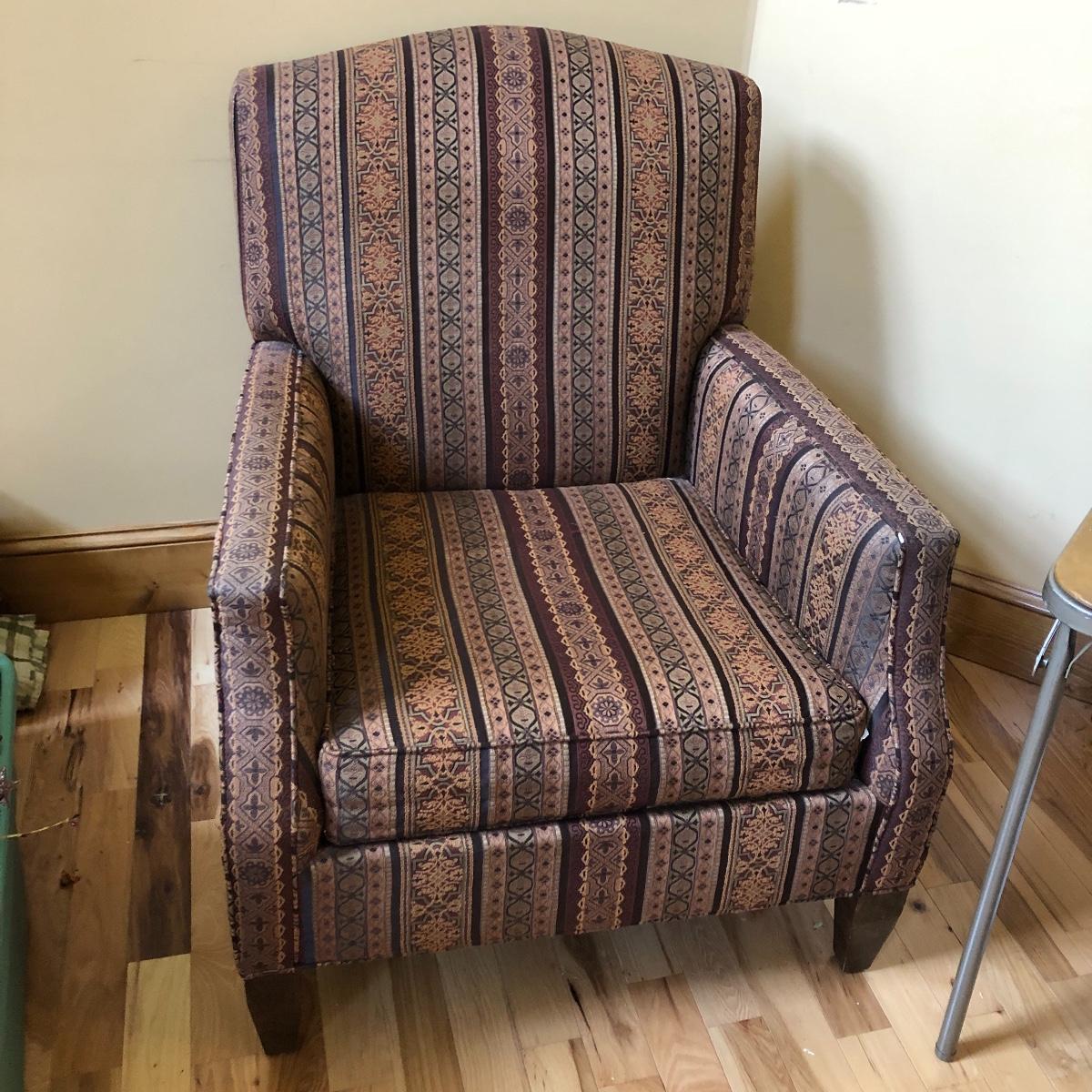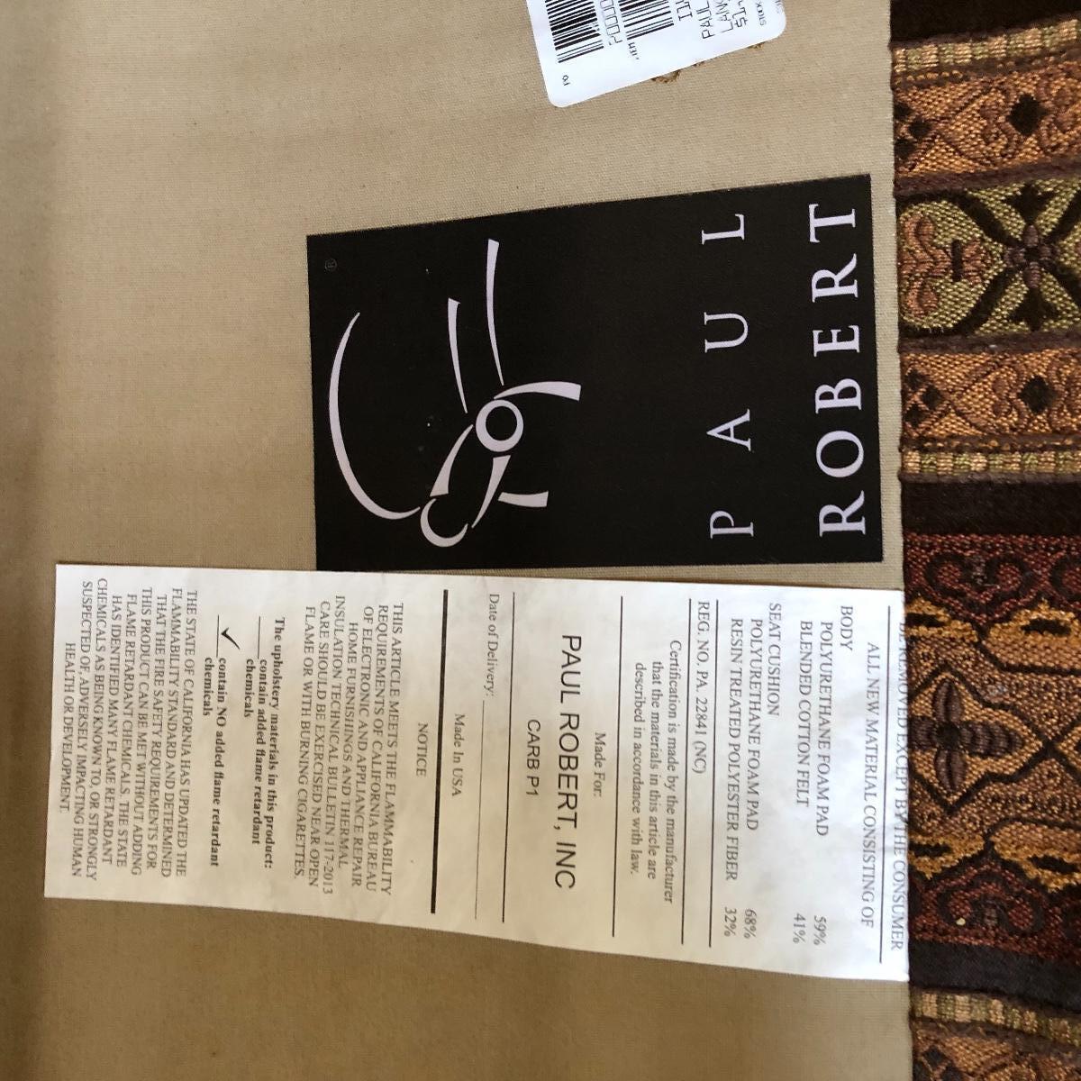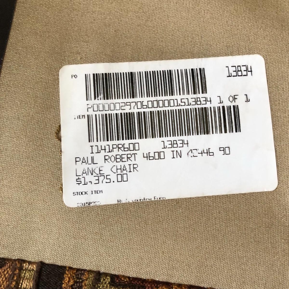 Sit back and relax in this high back arm chair by Paul Roberts. The chair is in muted earth tones and has wooden feet with padded arms back and seat. The chair has some wear on its' arm but otherwise, is in good shape, see pictures. Chair measures 32” x 35” x 39” with a 19” seat height.