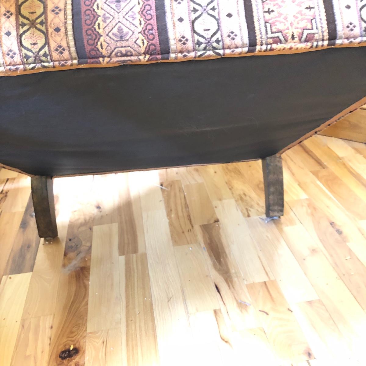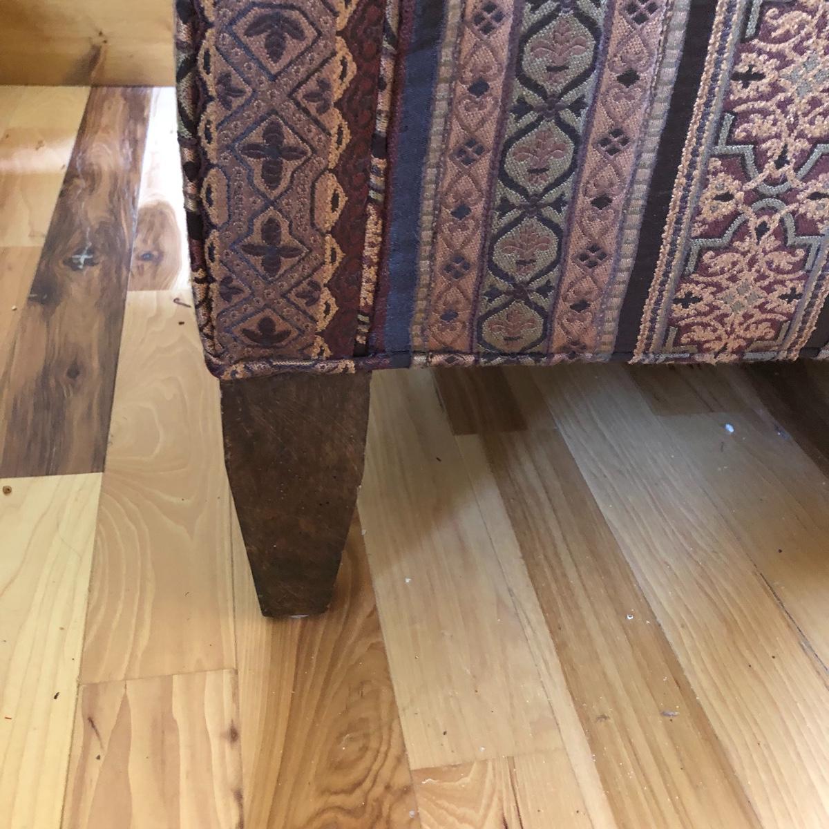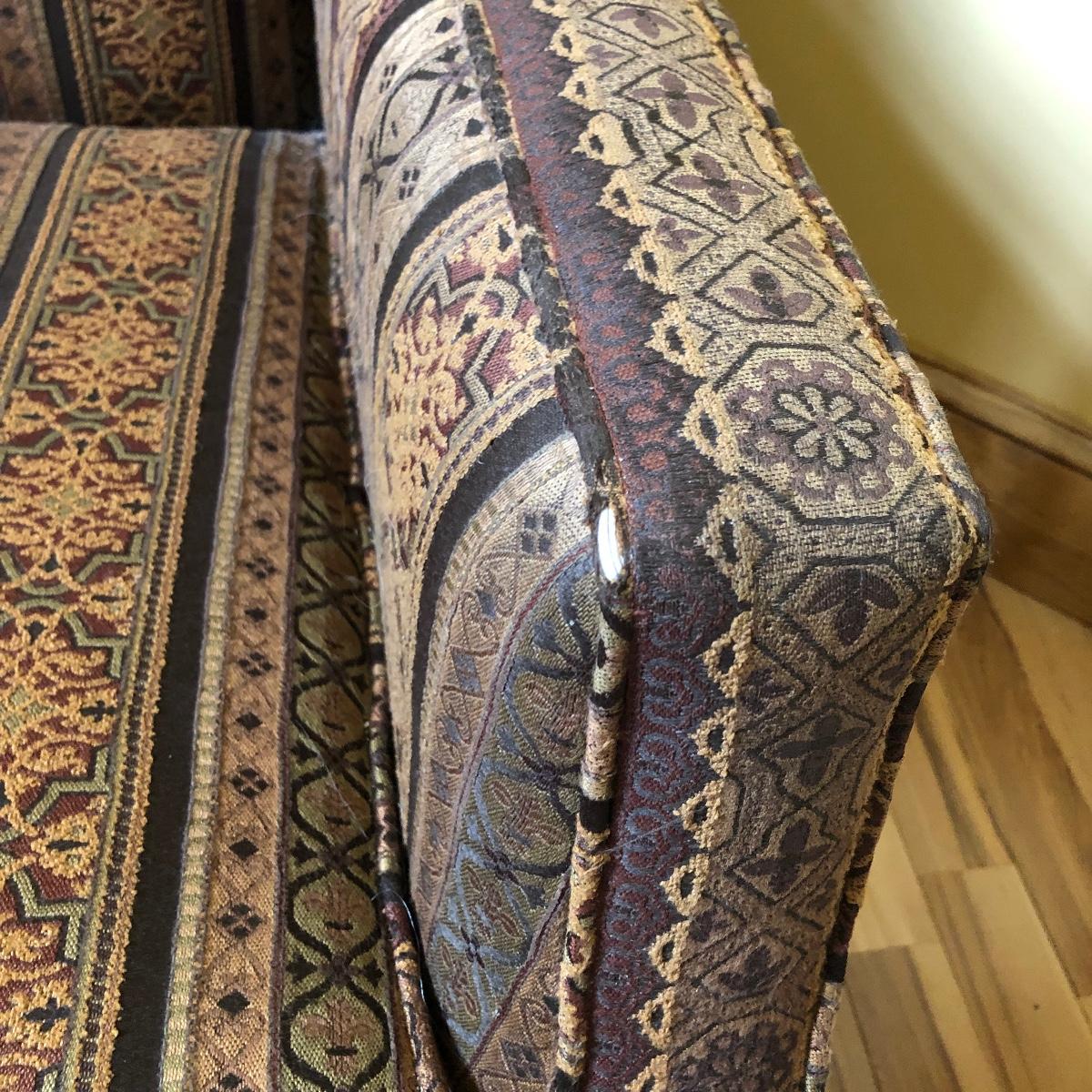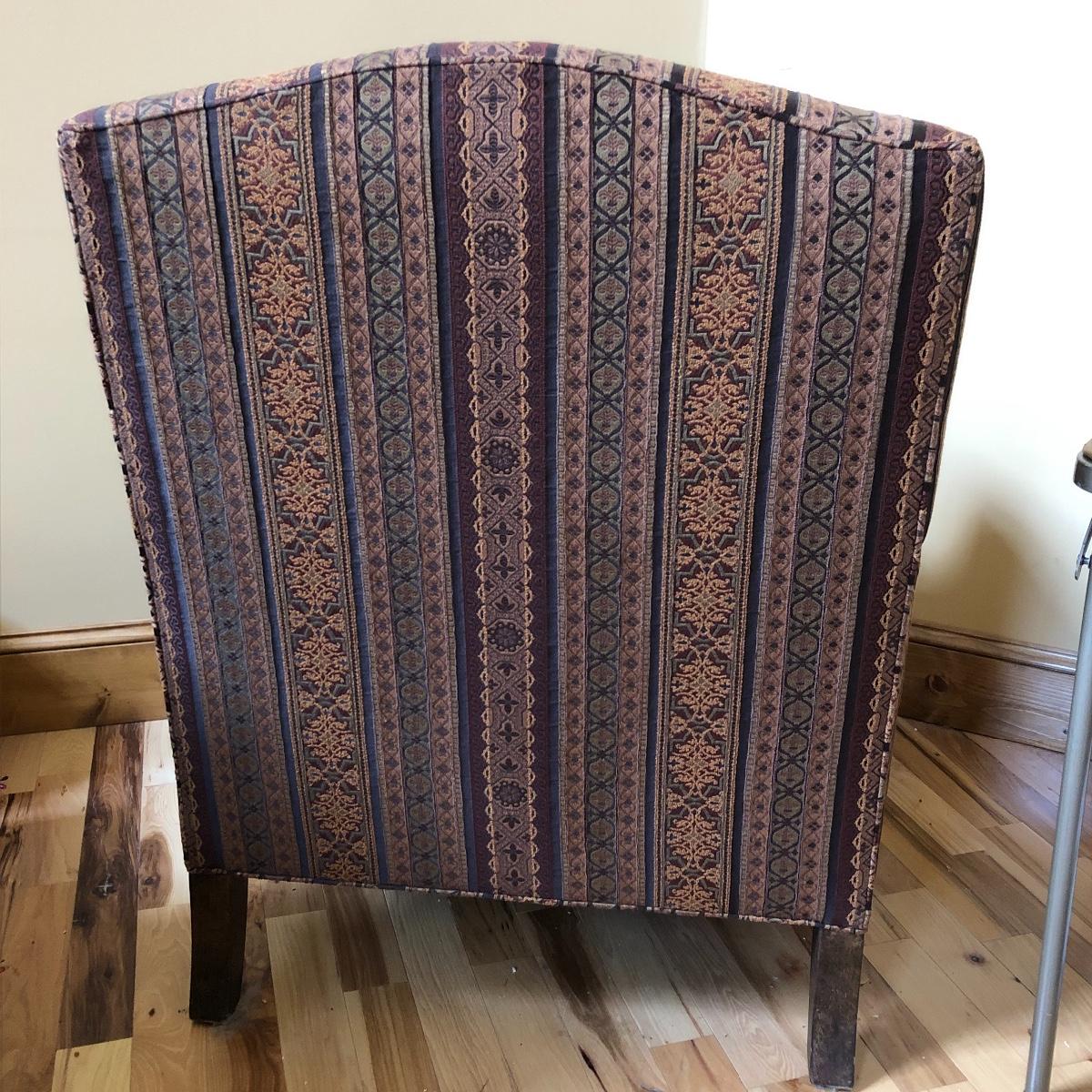 Sit back and relax in this high back arm chair by Paul Roberts. The chair is in muted earth tones and has wooden feet with padded arms back and seat. The chair has some wear on its' arm but otherwise, is in good shape, see pictures. Chair measures 32” x 35” x 39” with a 19” seat height.